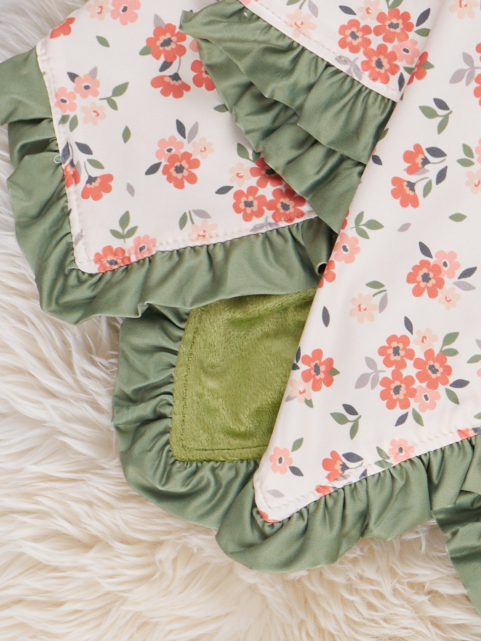 The Forest Petals Floral Blanket by Marie Nicole Clothing features a delightful floral print with elegant ruffle trim and a gentle, cozy fabric. Perfect for nursery décor or on-the-go comfort, this blanket brings woodland charm and softness to everyday cuddles.