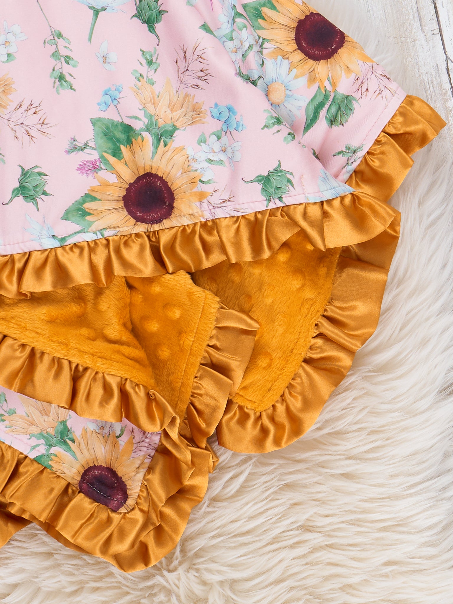 The Sunflower Dream Blanket by Marie Nicole Clothing features a cheerful sunflower pattern, soft minky backing, and ruffled trim for extra cozy texture. This blanket is designed for snuggles, naps, and coordinating with other Sunflower Dream pieces, making it a comforting and bright addition to nursery or travel routines.