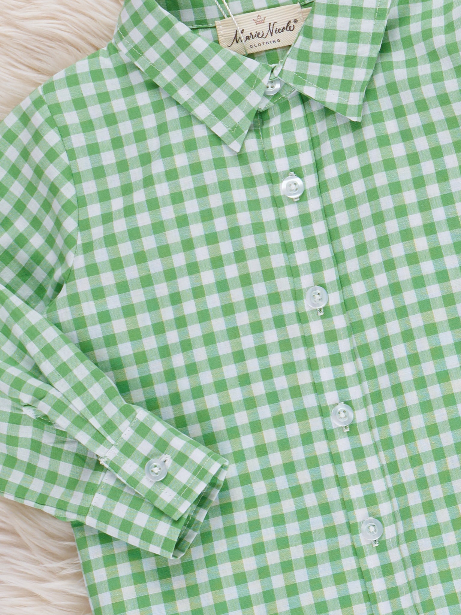 Gather the kiddos around the tree in this Evergreen Gingham Button-Up Shirt! This shirt boasts a charming kelly gingham print with functional buttons.