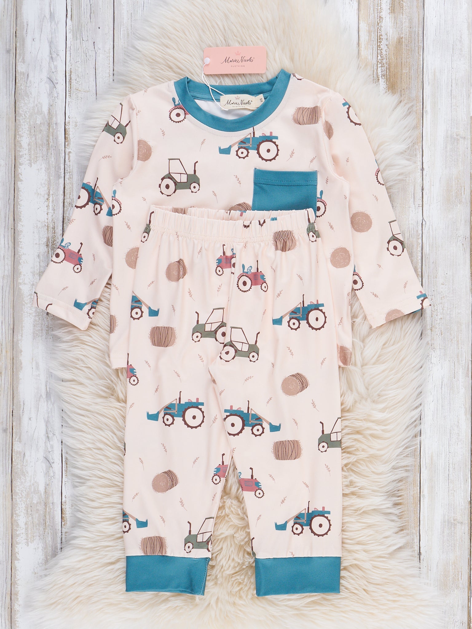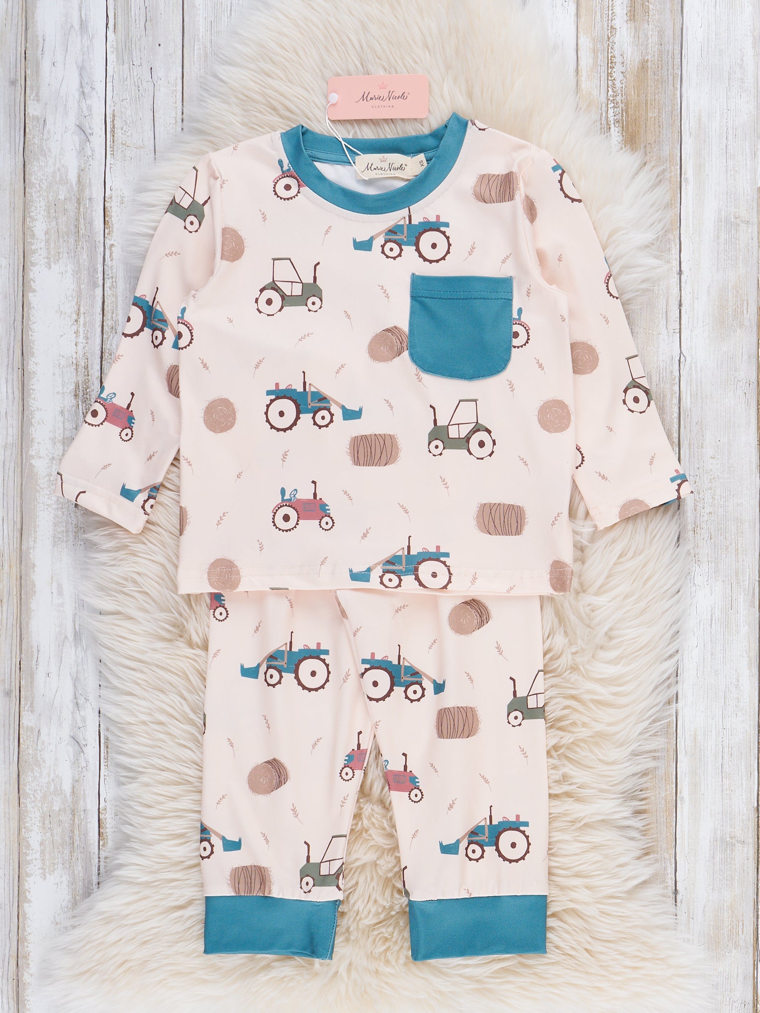 The Rolling Fields Pajamas by Marie Nicole feature a charming tractor print scattered with playful polka dots on a classic long-sleeve, two-piece set. The contrast cuffs and pocket add a touch of fun and practicality, making these pajamas cozy for bedtime and perfect for little farm fans