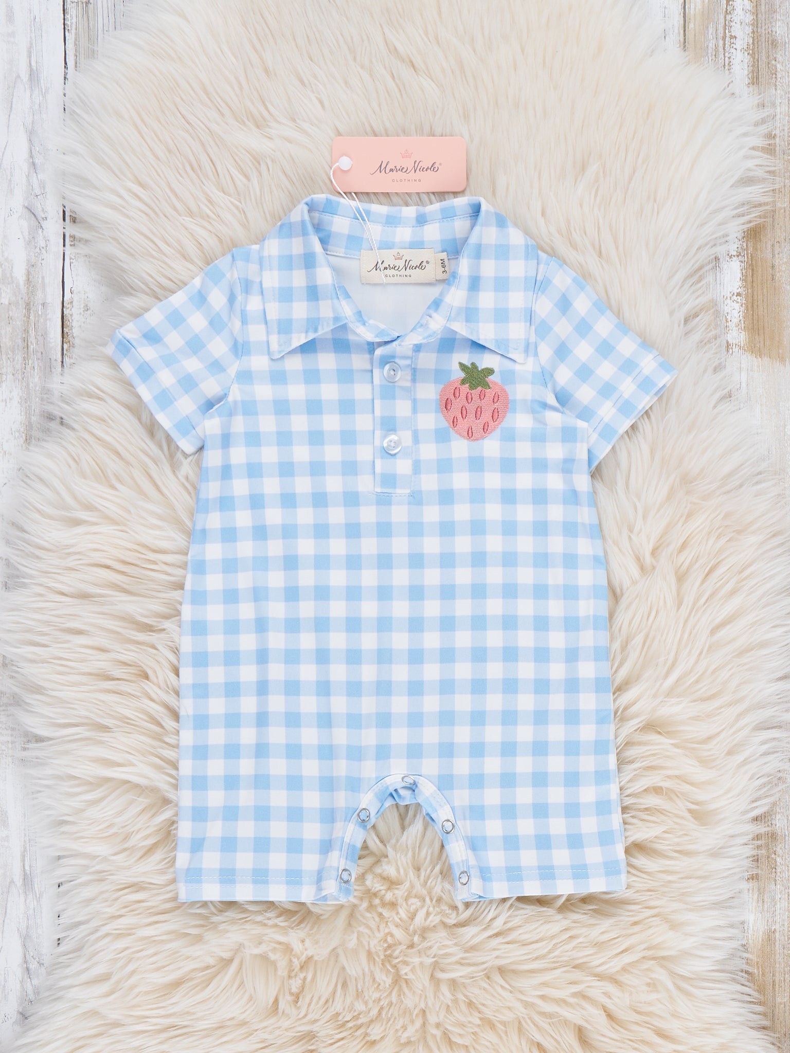 The Strawberry Checkmate Embroidered Romper by Marie Nicole Clothing combines classic gingham with a polished collared neckline and a sweet strawberry accent for a smart, playful look. Soft fabric, short sleeves, and convenient snaps keep baby comfy and make changes easy, perfect for warm-weather outings, family photos, and everyday adventures.