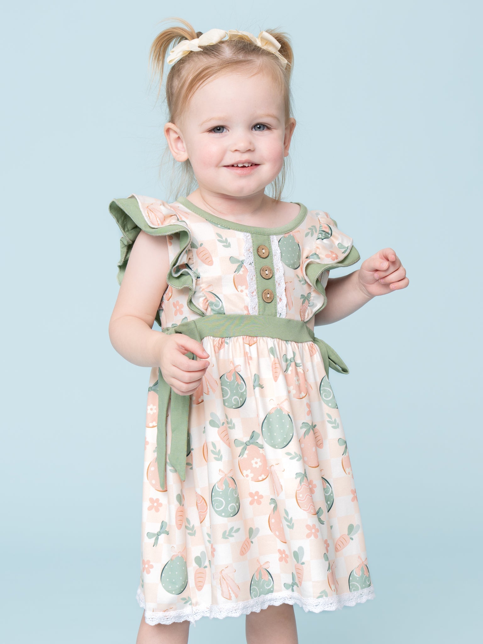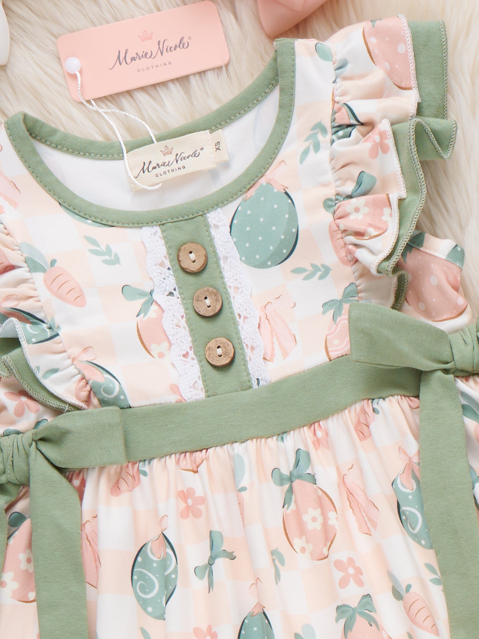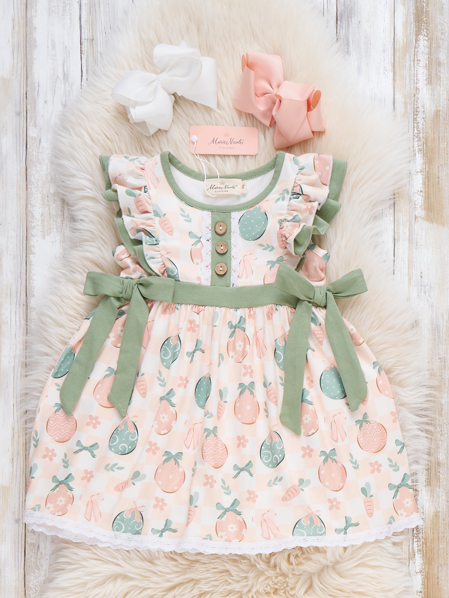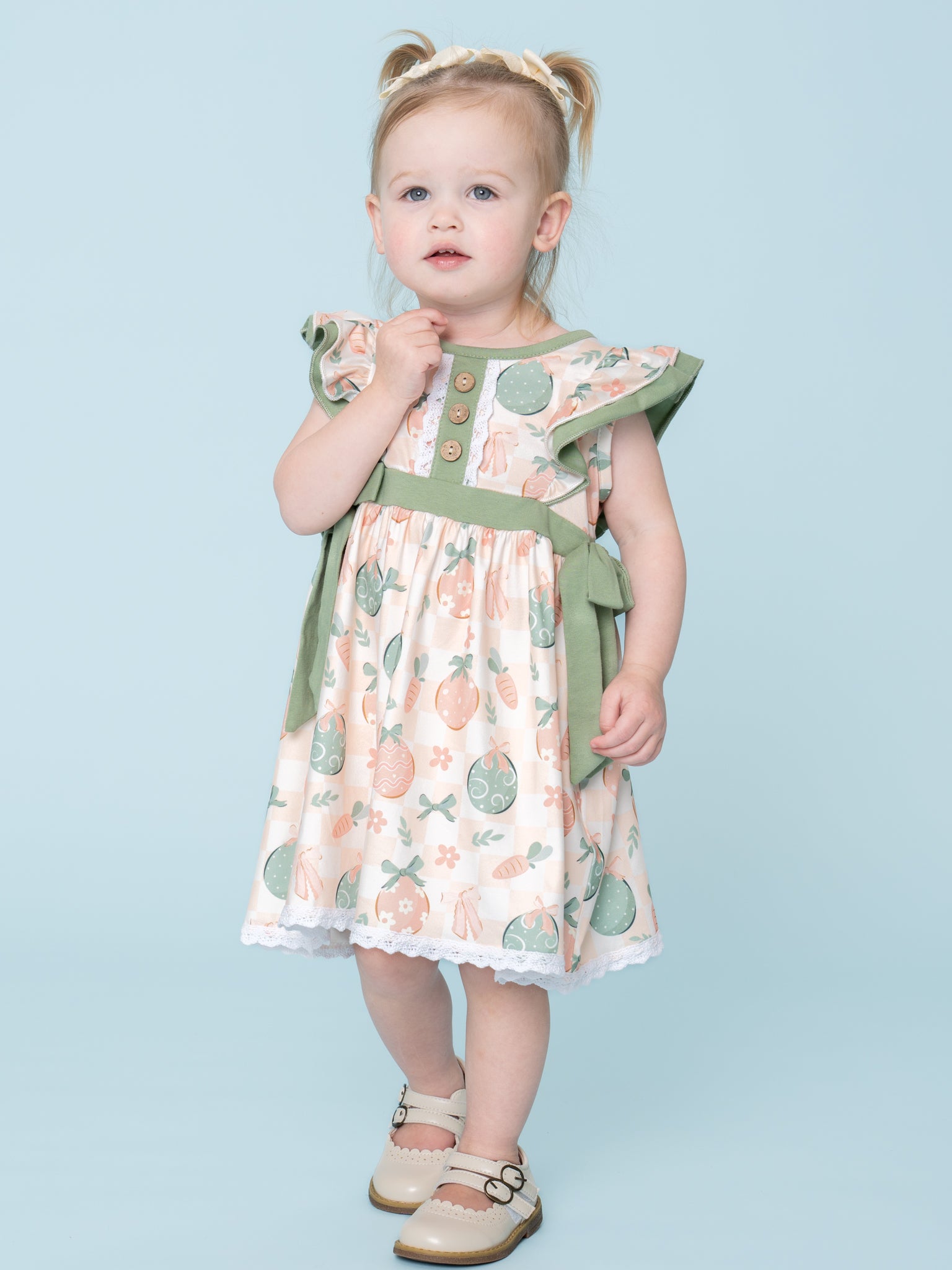 Celebrate Eggs Ruffle Dress by Marie Nicole Clothing is a twirl-ready little dress covered in sweet Easter eggs, with fluttery sleeves, tiny buttons down the front, and side sash bows made for picture-perfect cuddles. The soft knit and gentle lace hem let your little bunny hop, spin, and sit for egg hunts in cozy comfort, making this an adorable choice for church, brunch, or springtime photos.