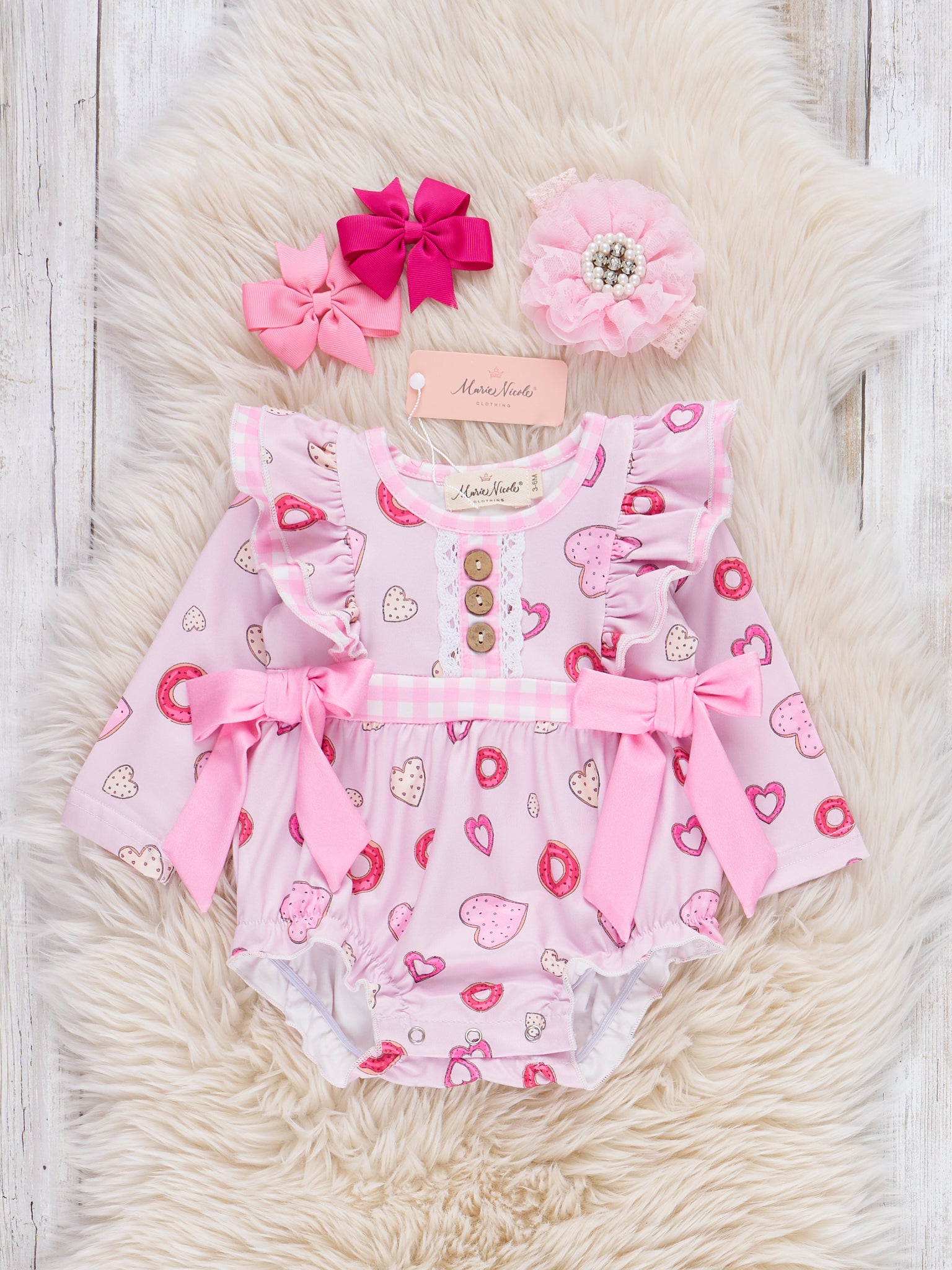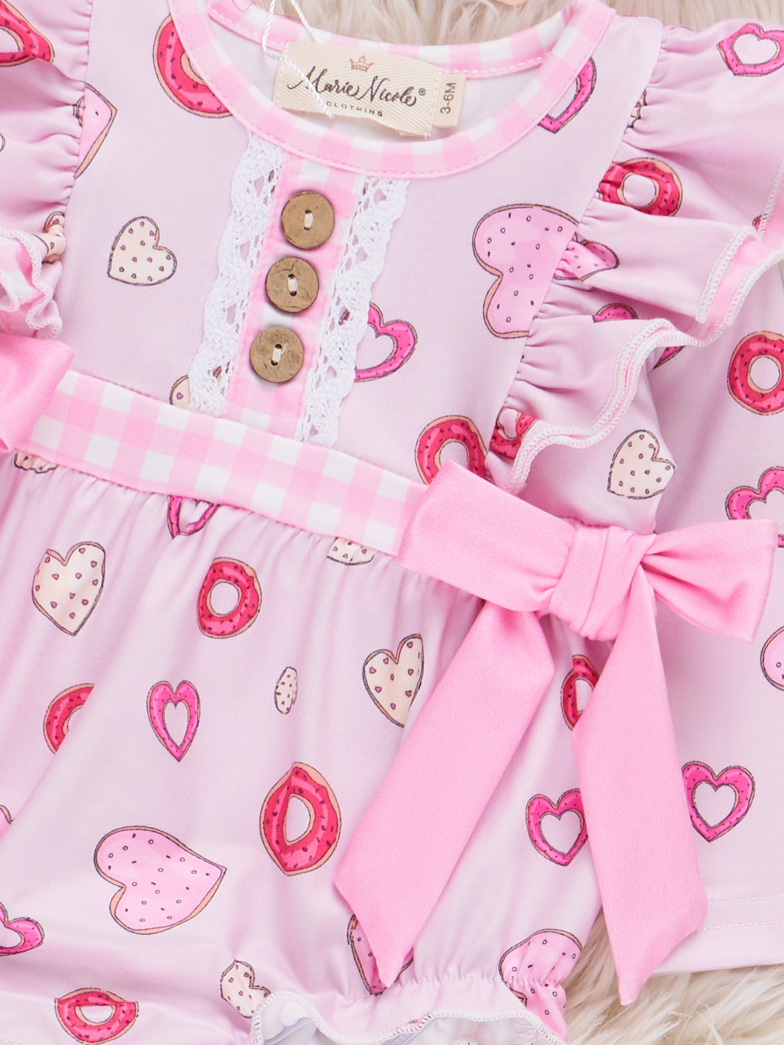 Heartfelt Petals Ruffle Bubble by Marie Nicole Clothing is a sweet one-piece featuring heart and dot prints, a ruffled button neckline, and playful bow-tied sashes at the waist. Designed for easy changes and adorable style, this bubble brings together cozy softness and darling details, perfect for Valentine's Day photo moments and everyday snuggles.