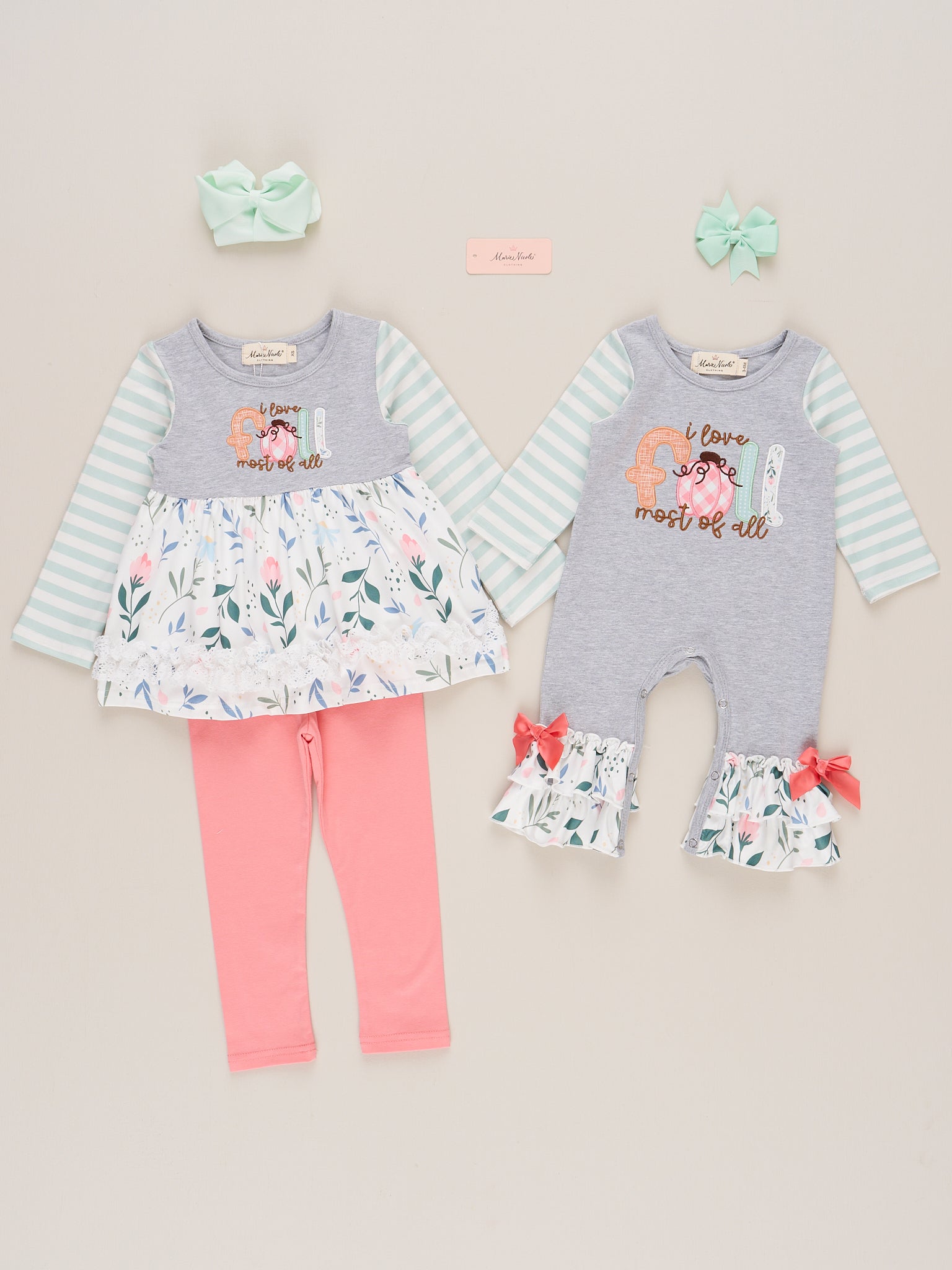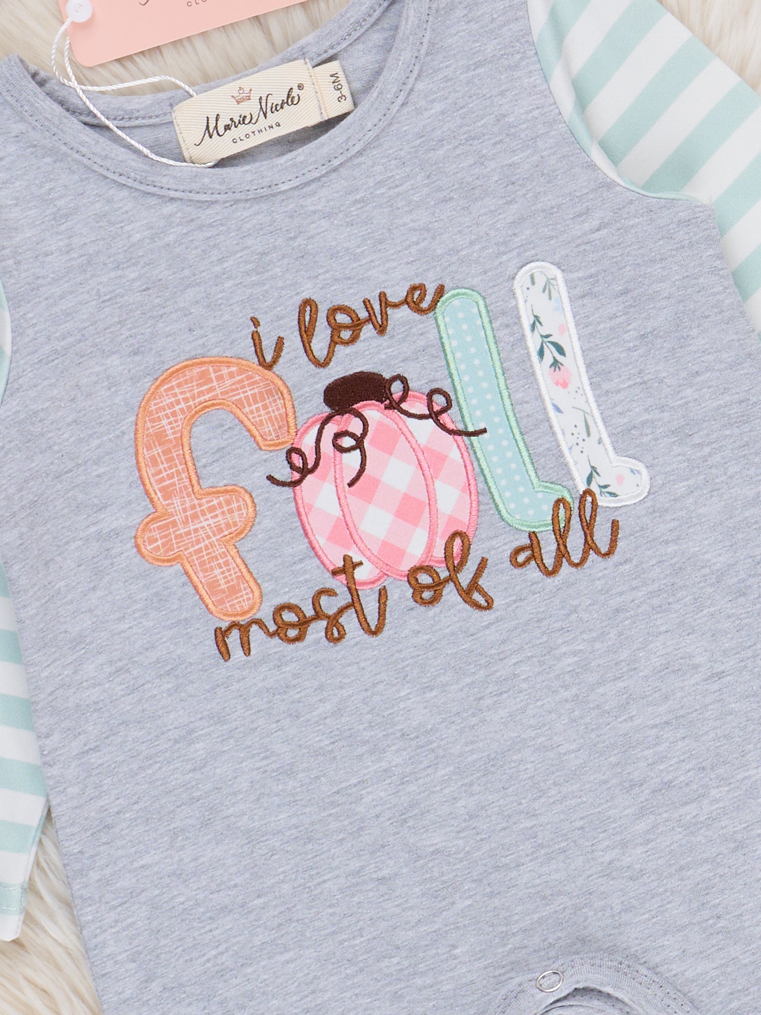 The "I Love Fall Most of All" Ruffle Romper is a cozy and cheerful choice that’s perfect for celebrating the magic of autumn. Featuring playful fall-themed prints and soft ruffle details, this romper from Marie Nicole Clothing blends seasonal charm with everyday comfort. Made from breathable fabric designed for easy movement, it’s ideal for pumpkin patch visits, crisp walks, and picture-perfect fall moments.