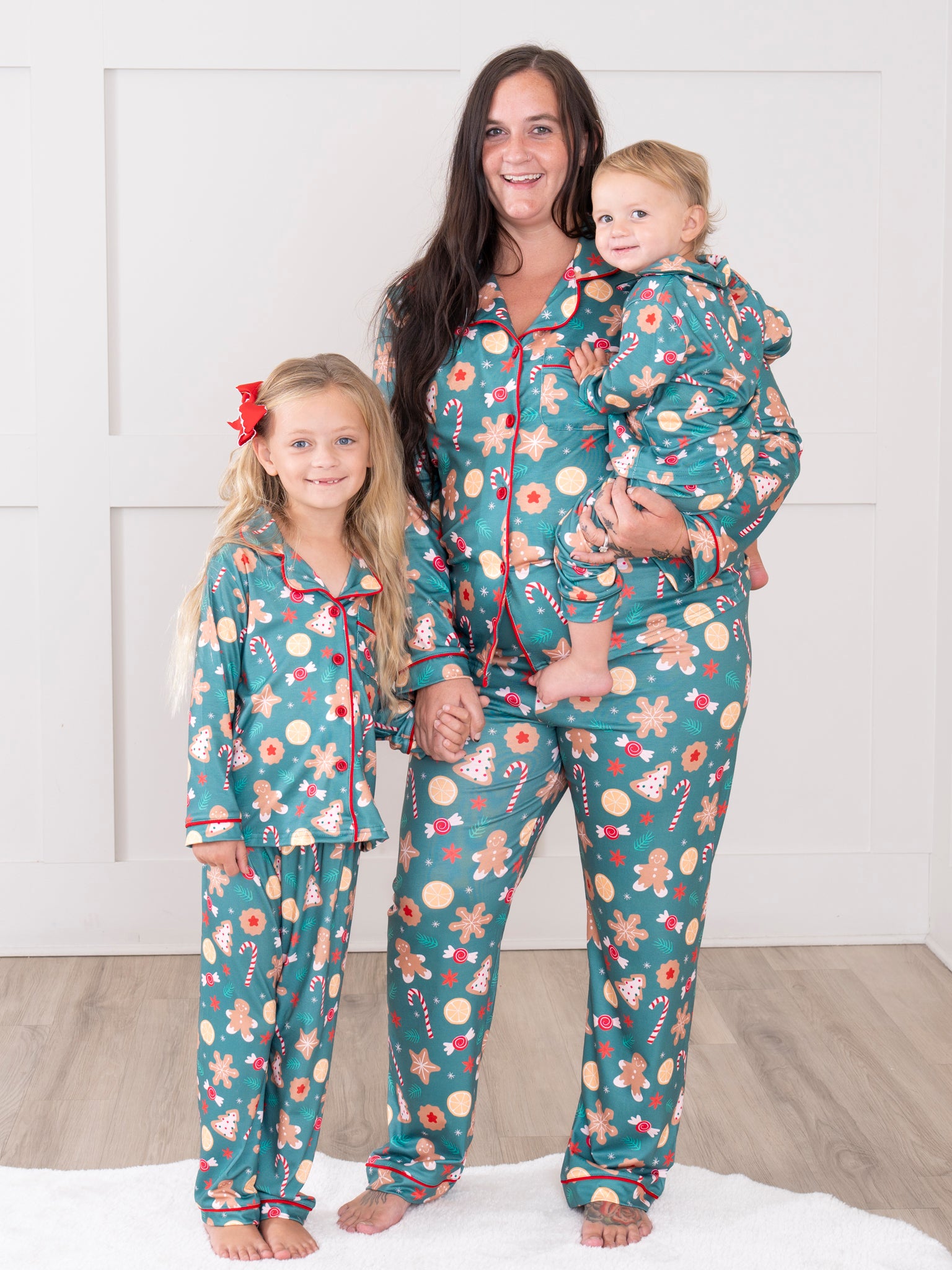 The Jolly Sweets Family Pajamas by Marie Nicole Clothing feature a festive pattern with gingerbread cookies, candy canes, and holiday treats, perfect for bringing cheer to cozy nights at home. Soft, comfortable fabric and a relaxed fit make these pajamas ideal for creating joyful family memories throughout the holiday season.