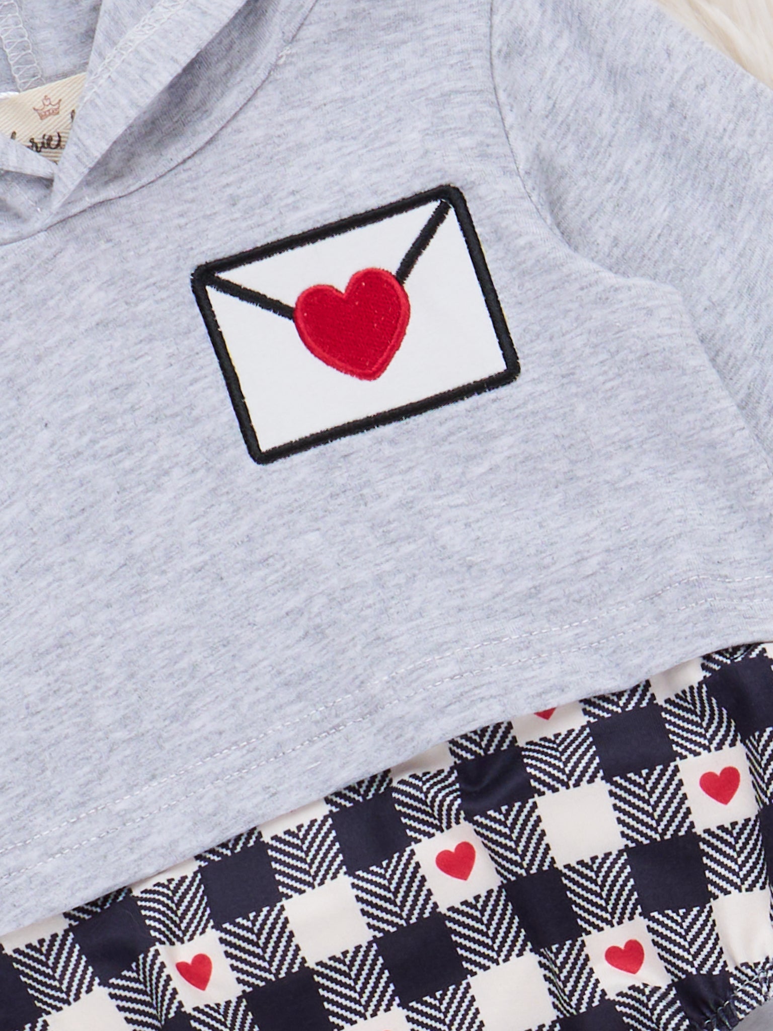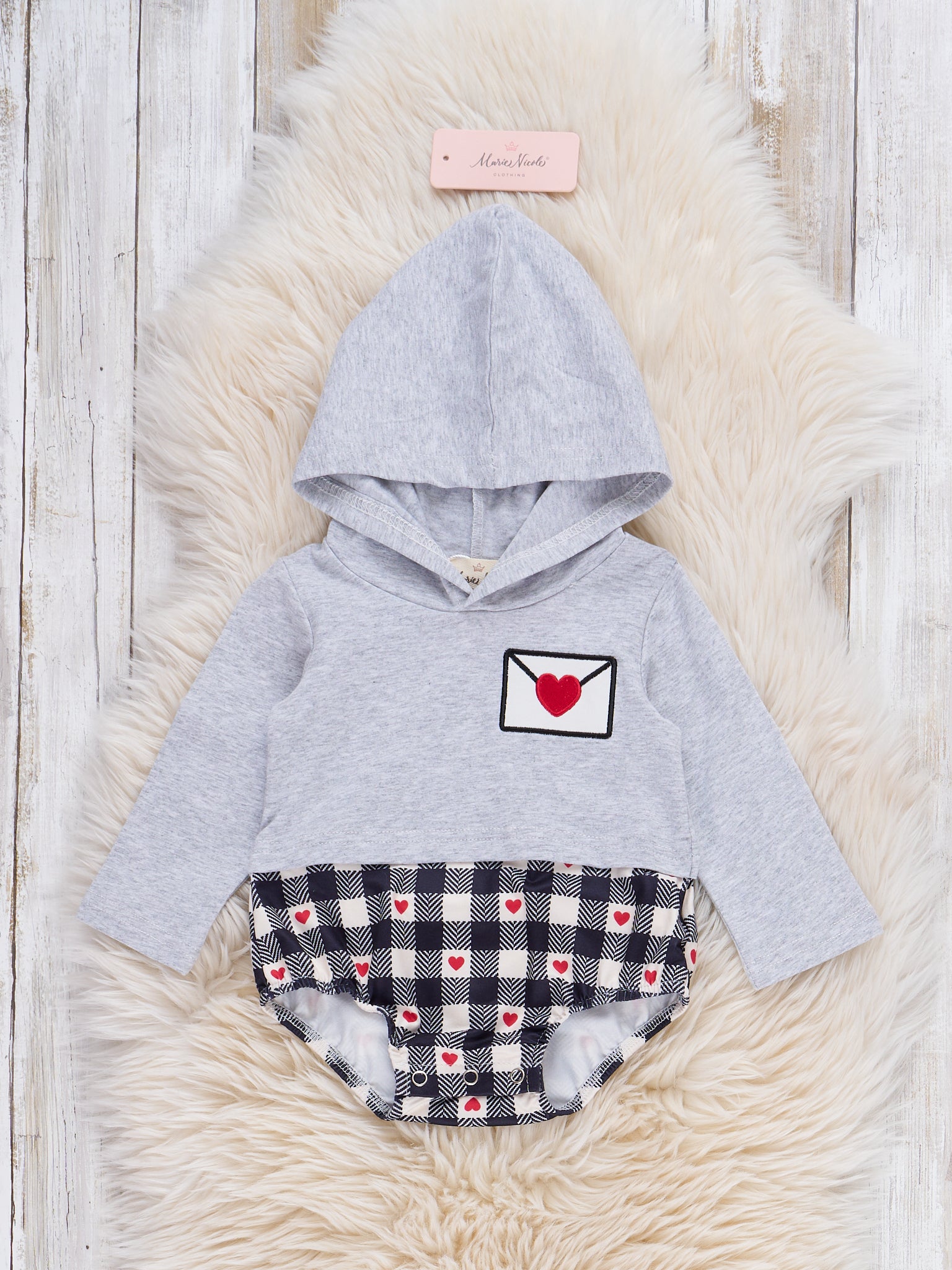Love Letter Embroidered Hooded Romper by Marie Nicole Clothing is a whimsical addition to any little one's wardrobe, complete with a cozy hood and a sweetly embroidered Valentine's Day envelope featuring a heart. With playful checkered details and charming heart motifs, this romper is designed for those moments that celebrate love—whether it's for a special occasion, festive gathering, or sharing smiles during the Valentine season.