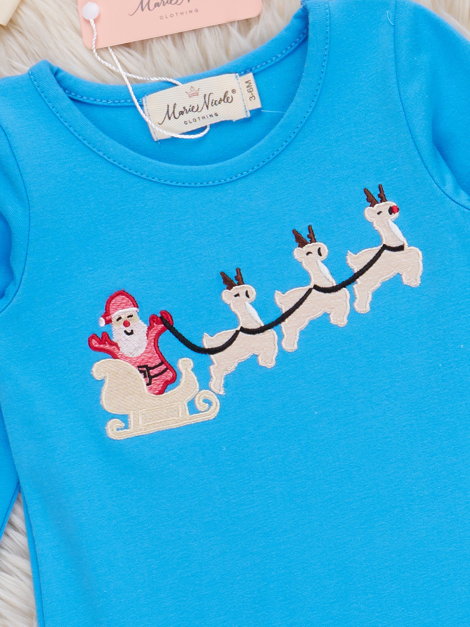 The Reindeer Night Christmas Embroidered Ruffle Romper by Marie Nicole features a festive long-sleeve design with playful reindeer and sleigh embroidery across the chest. The romper is finished with ruffled cuffs at the ankles, adorned with seasonal prints and bows, offering both charm and comfort for the holiday season