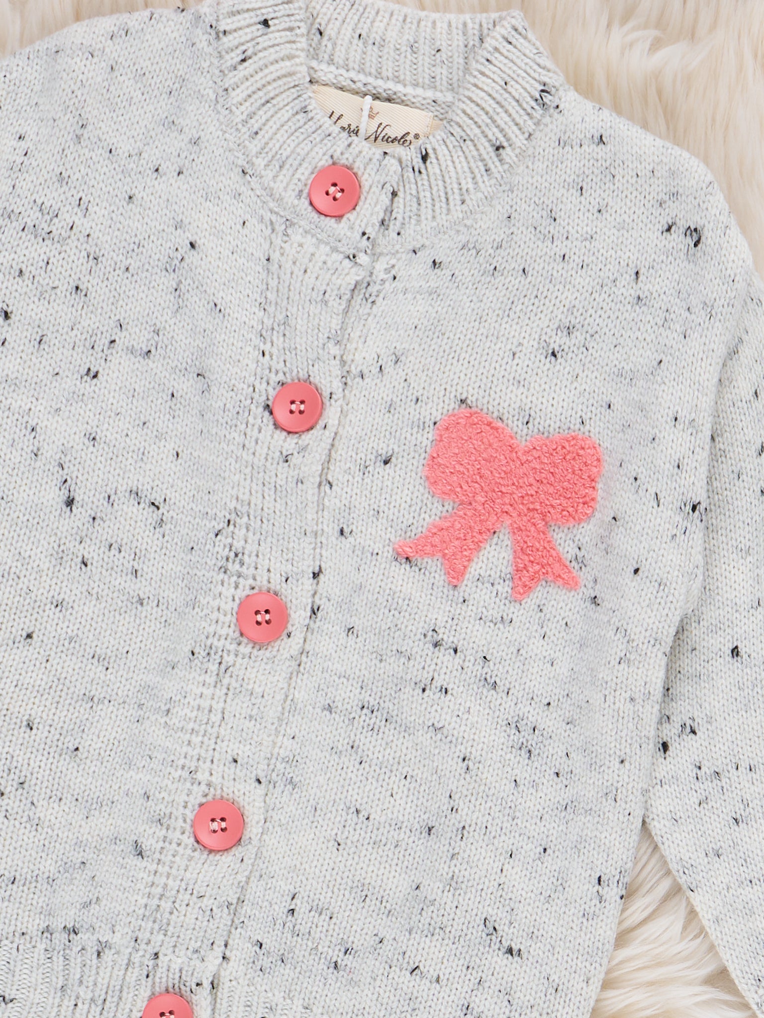 The Speckle Charm Bow Cardigan by Marie Nicole is a knit cardigan detailed with playful speckles throughout the fabric, featuring ribbed cuffs and hem for a cozy fit. This design is elevated by charming accent buttons and an adorable bow detail on the chest, making it a sweet layering piece for everyday comfort and style.