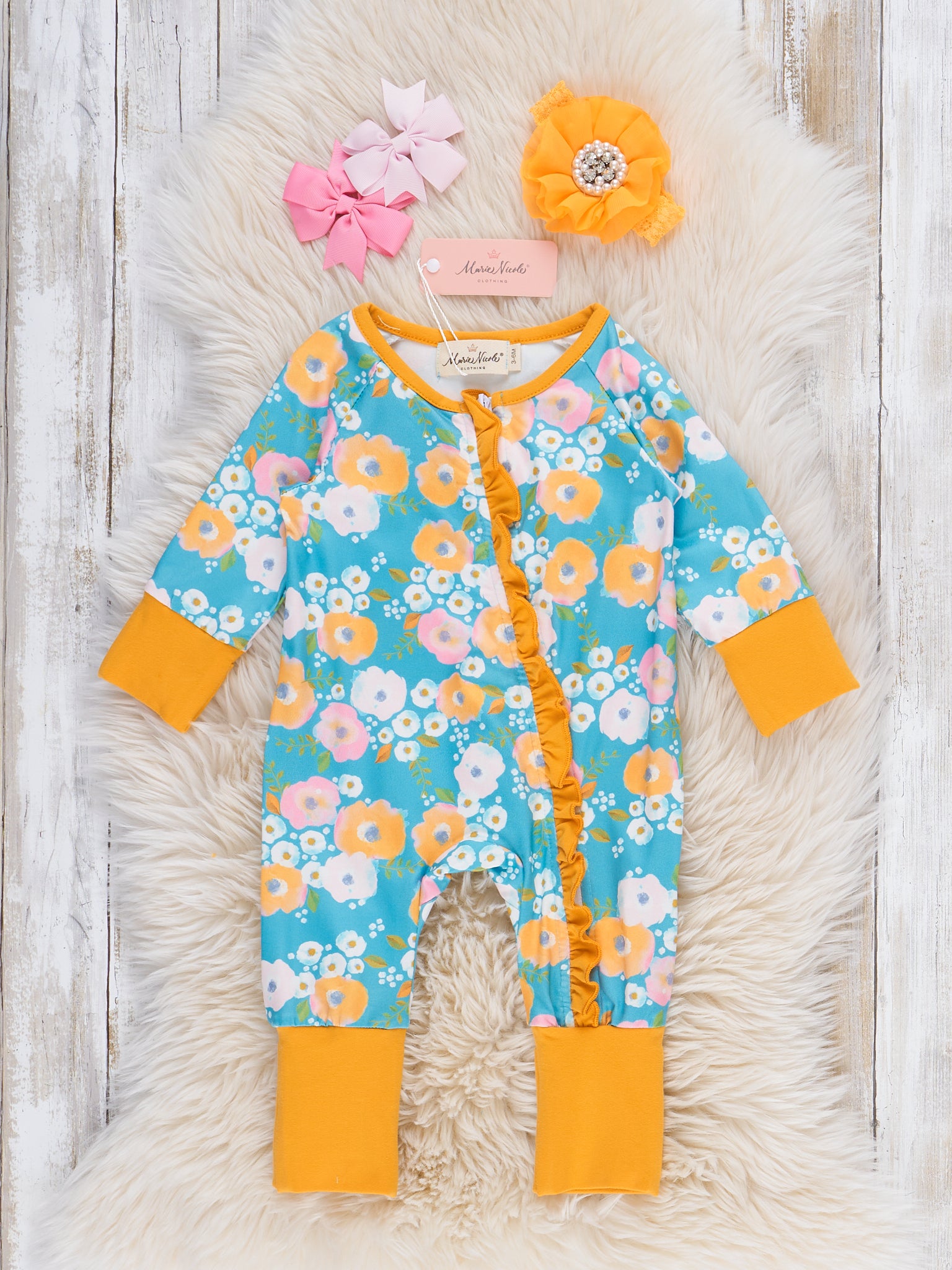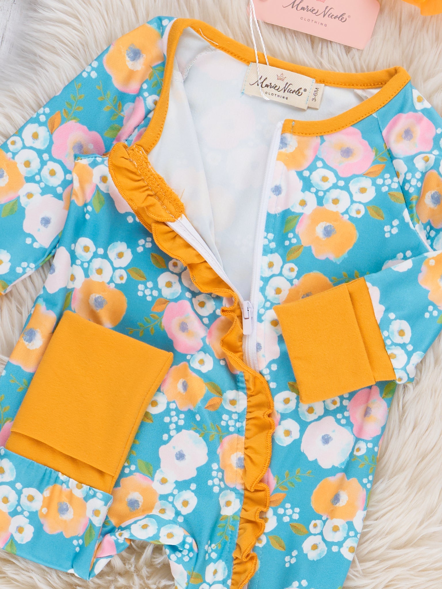 The Sunshine & Daisies Sleeper Pajamas by Marie Nicole feature a playful floral print accented by contrast cuffs and neckline, with a sweet ruffle detail cascading along the snap-up front. The long sleeves and cozy fit make this pajama perfect for comfortable nights and cheerful mornings