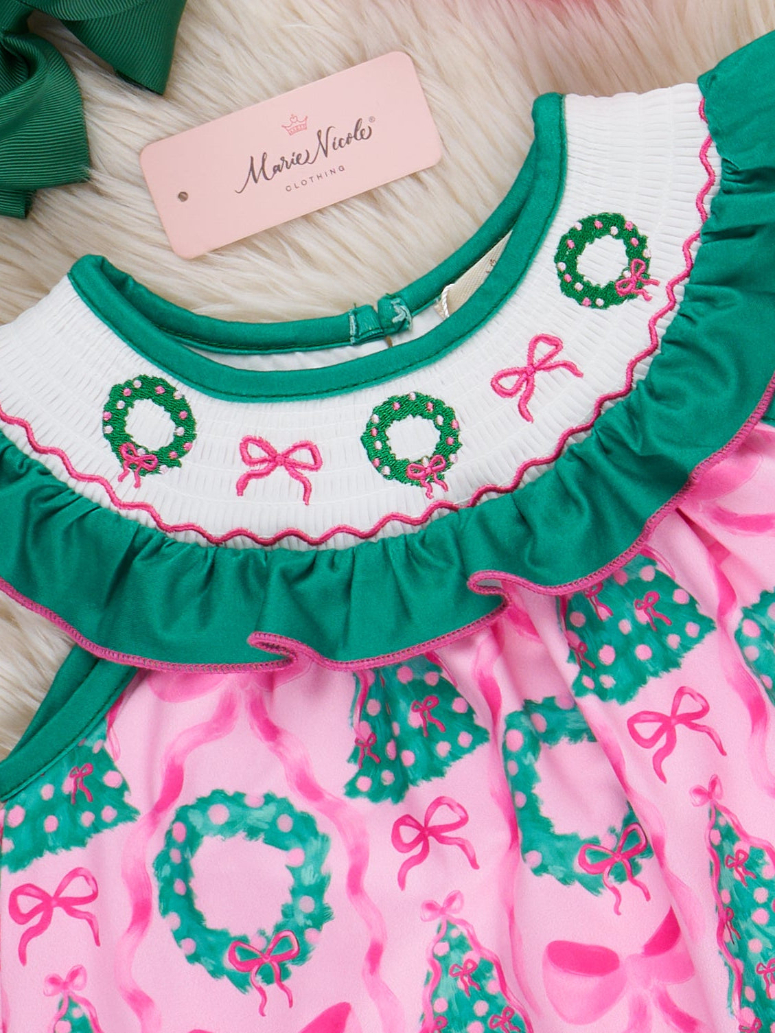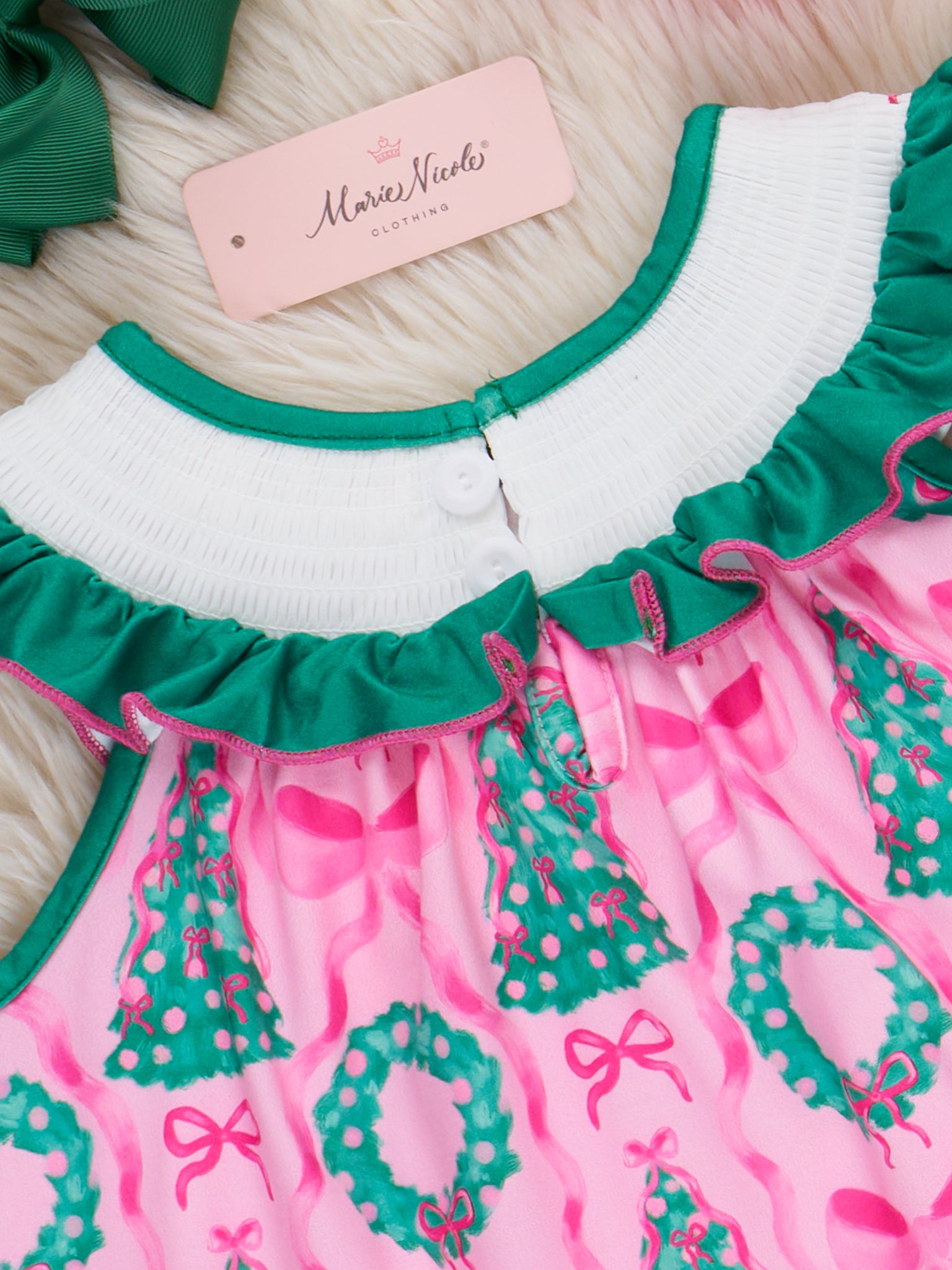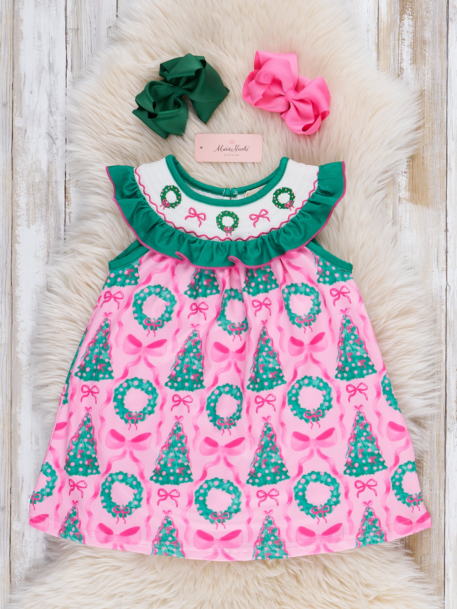 The Wreath & Trees Holiday Smocked Dress by Marie Nicole Clothing is a festive sleeveless dress adorned with cheerful wreath and Christmas tree prints, accented by a sweet green ruffle collar. This dress combines playful holiday designs with a comfortable, flowing fit, making it perfect for any seasonal celebration or special occasion during the holidays.
