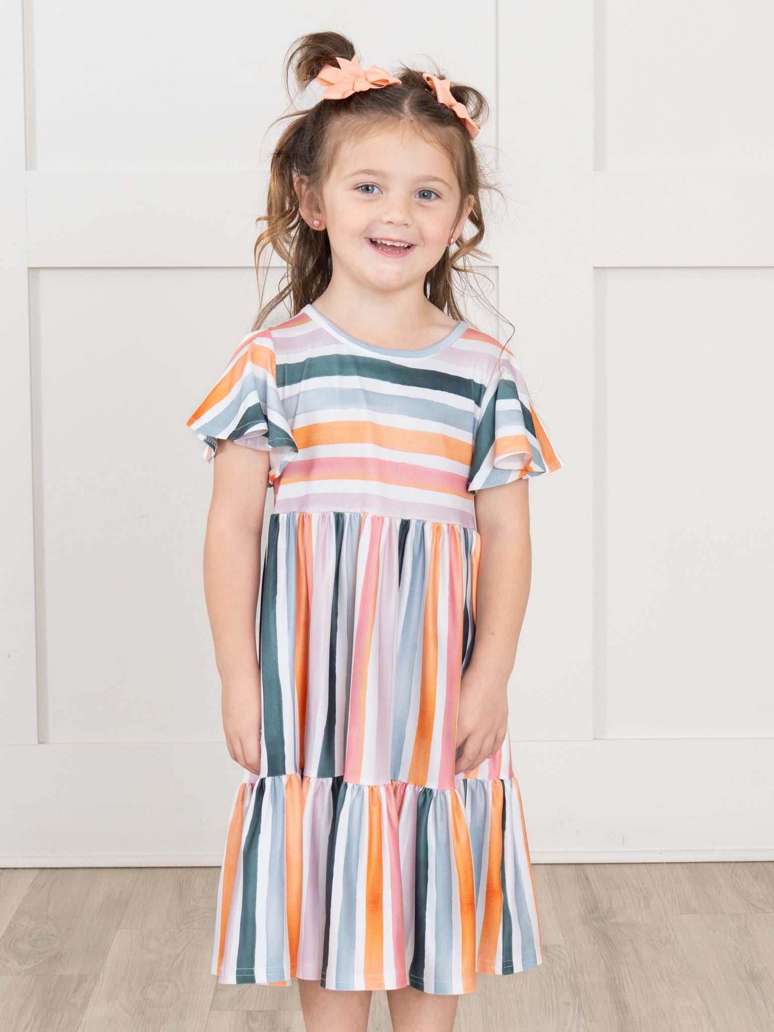 This Coastal Tide Tiered Stripe Ruffle Dress by Marie Nicole Clothing features the sweetest stripes & ruffle trim for a beautiful family match. With colors inspired by the sea foam and sunny beaches, this soft, comfy one-piece is perfect for warmer weather, whether spring or summer. The lovely ruffles make it extra cute. As a Mom & Me set, it is perfect for family matching!