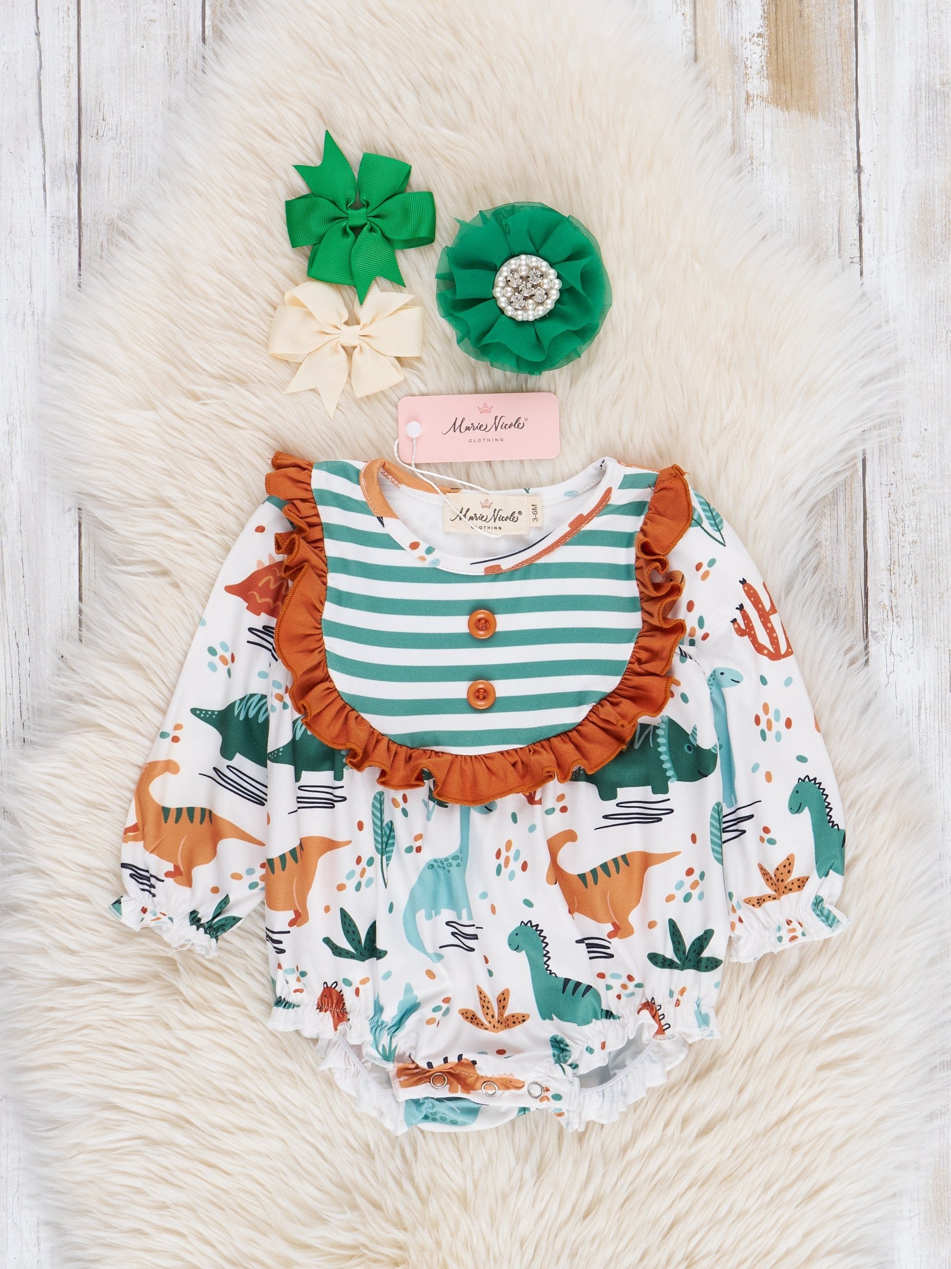 Get ready to roar with this dino-mite sister set! This playful girls bubble features a trendy striped bib collar and a cute dinosaur print that is perfect for her next adventure.