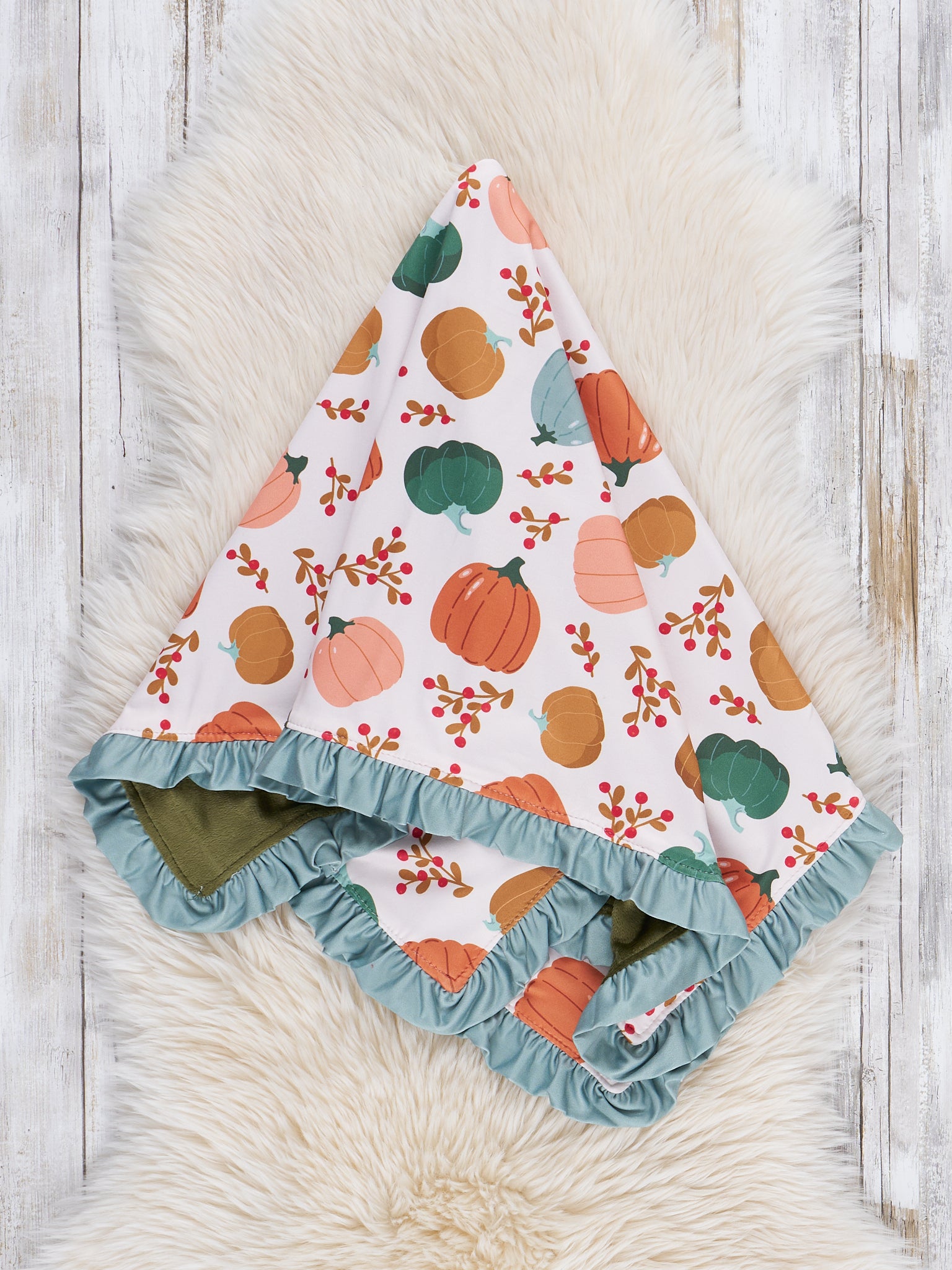 The Sweet Gourd Ruffle Minky Blanket is full of autumn charm and cozy comfort. Featuring a festive gourd print in warm seasonal tones, this blanket from Marie Nicole Clothing is crafted from ultra-soft minky fabric and finished with a sweet ruffle trim. Perfect for stroller rides, tummy time, or cuddling up on crisp fall days.