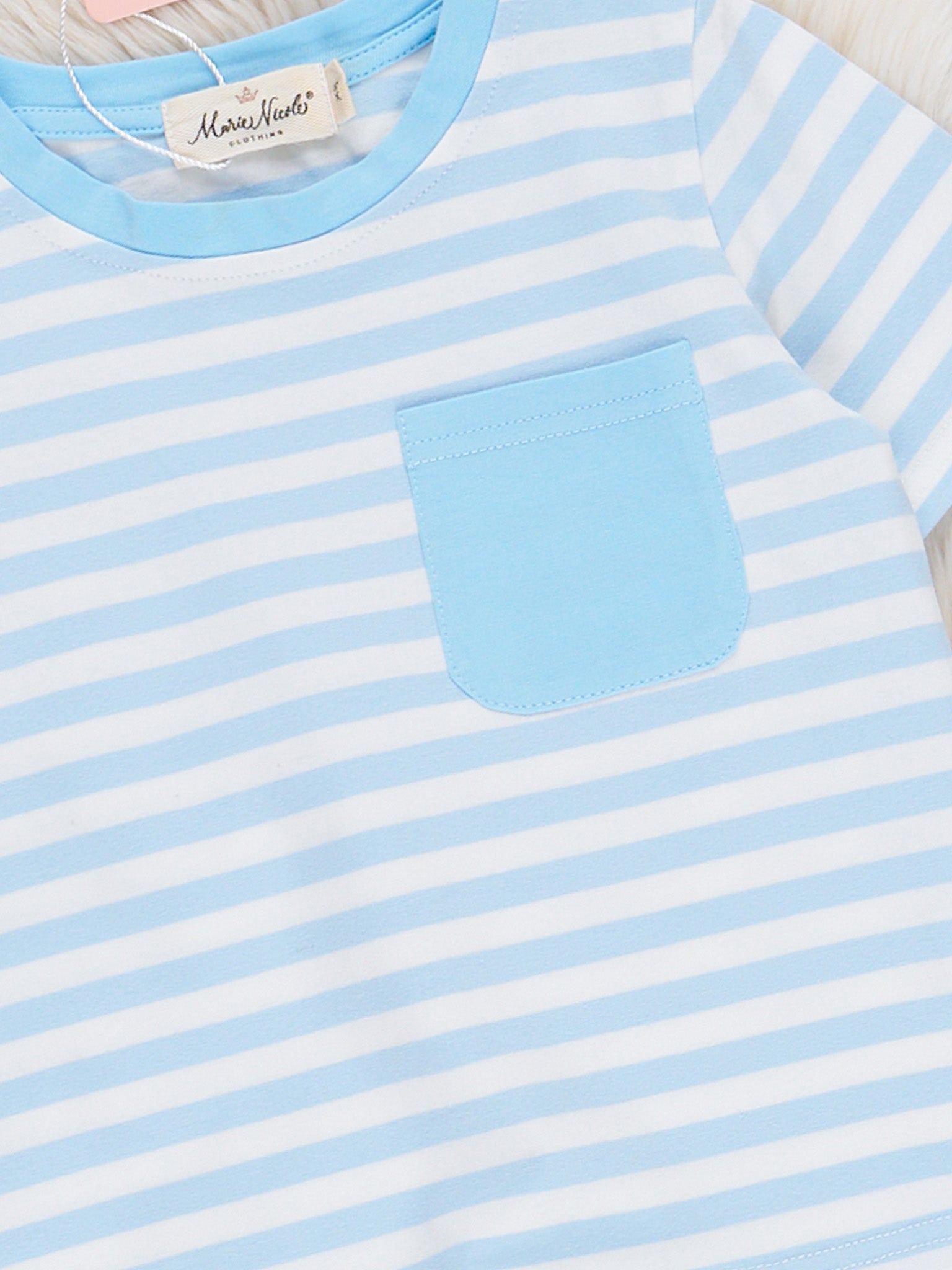 Get ready for the spring season with this adorable Blue Striped Pocket Outfit! Perfect for your little one, this boys outfit features a stylish blue striped top with blue trim and pocket detail paired with cozy blue pull-on pants. Your kids will be the talk of the town in this fun and playful outfit by Marie Nicole Clothing!