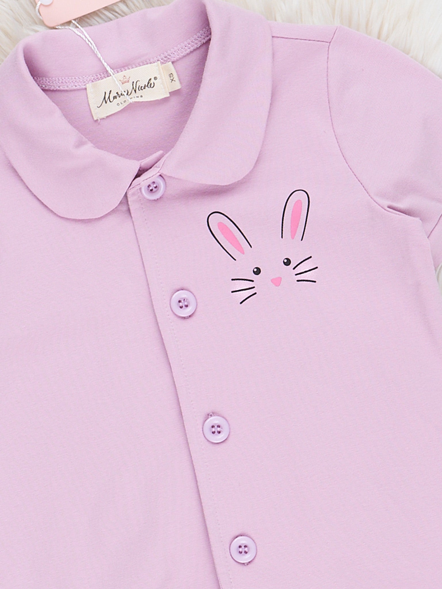 Get ready for a cozy night's sleep with our Purple Stripes Spring Pajamas. These pajamas are perfect for lounging around the house or enjoying a lazy Sunday morning, featuring a charming bunny print, functioning buttons, and playful stripes. Sweet bunny dreams!