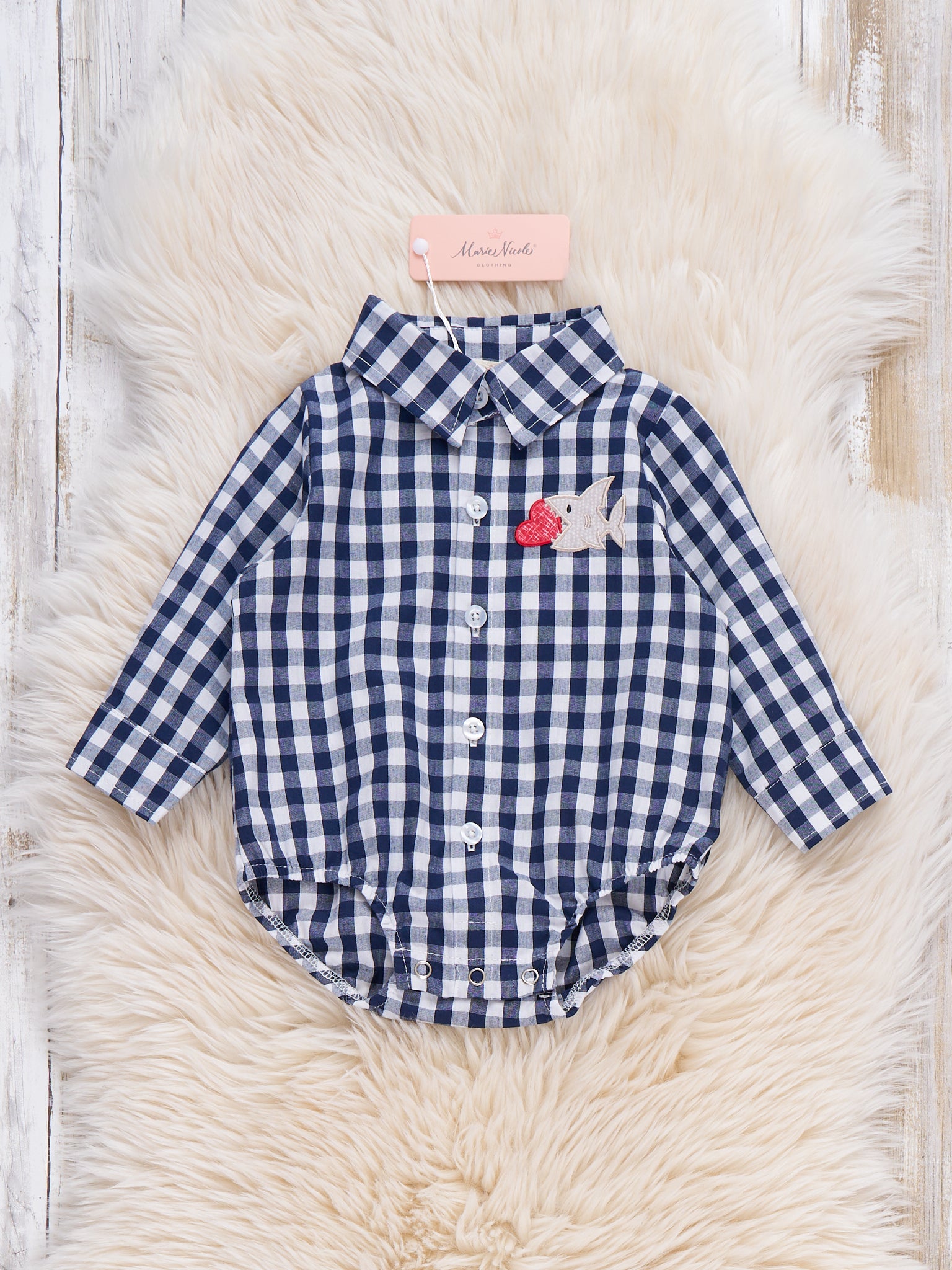 The Heartfelt Patch Embroidered Cotton Button-Up Onesie by Marie Nicole Clothing brings a timeless touch with its classic check pattern and sweet embroidered heart detail. Featuring a crisp collar and snap closure for easy dressing, this cotton onesie blends everyday comfort with a playful motif, making it perfect for celebrations or simply showcasing love-inspired style.