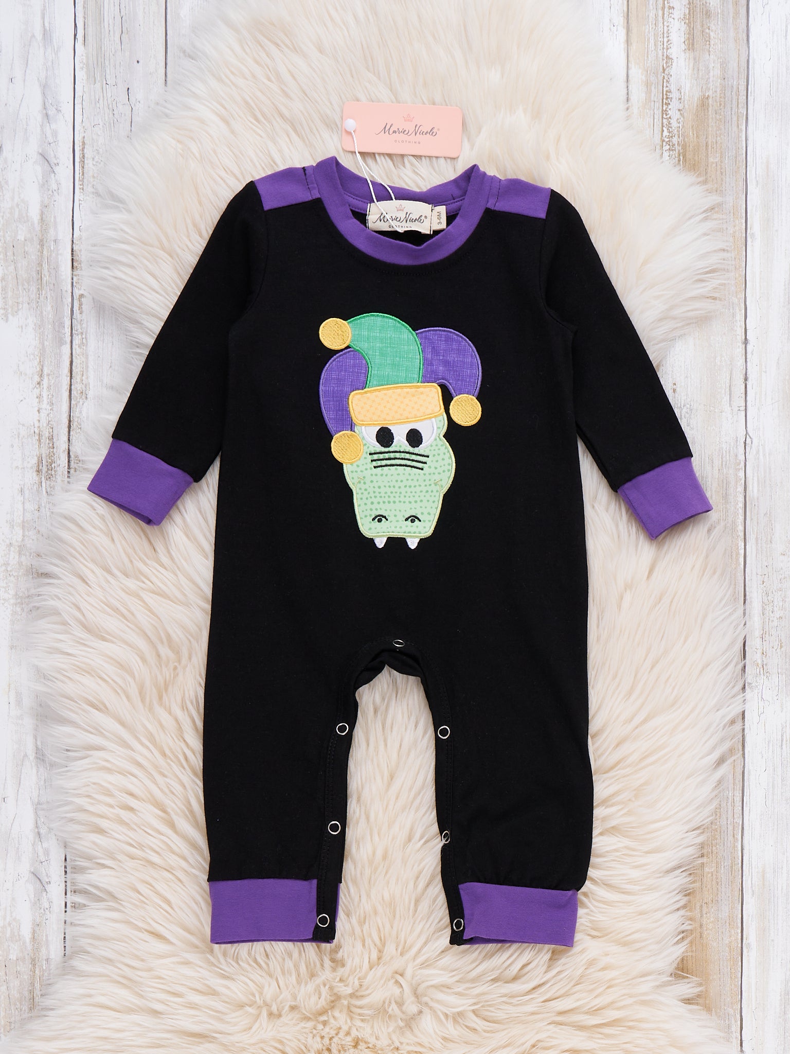 Step into festive fun with the Little Jester Alligator Embroidered Romper by Marie Nicole Clothing. This playful romper features an adorable alligator in a classic jester hat, accented with vibrant cuffs for a burst of Mardi Gras cheer. Designed for comfort and joy-filled adventures, it’s perfect for little ones making the most of every carnival celebration and costume moment.