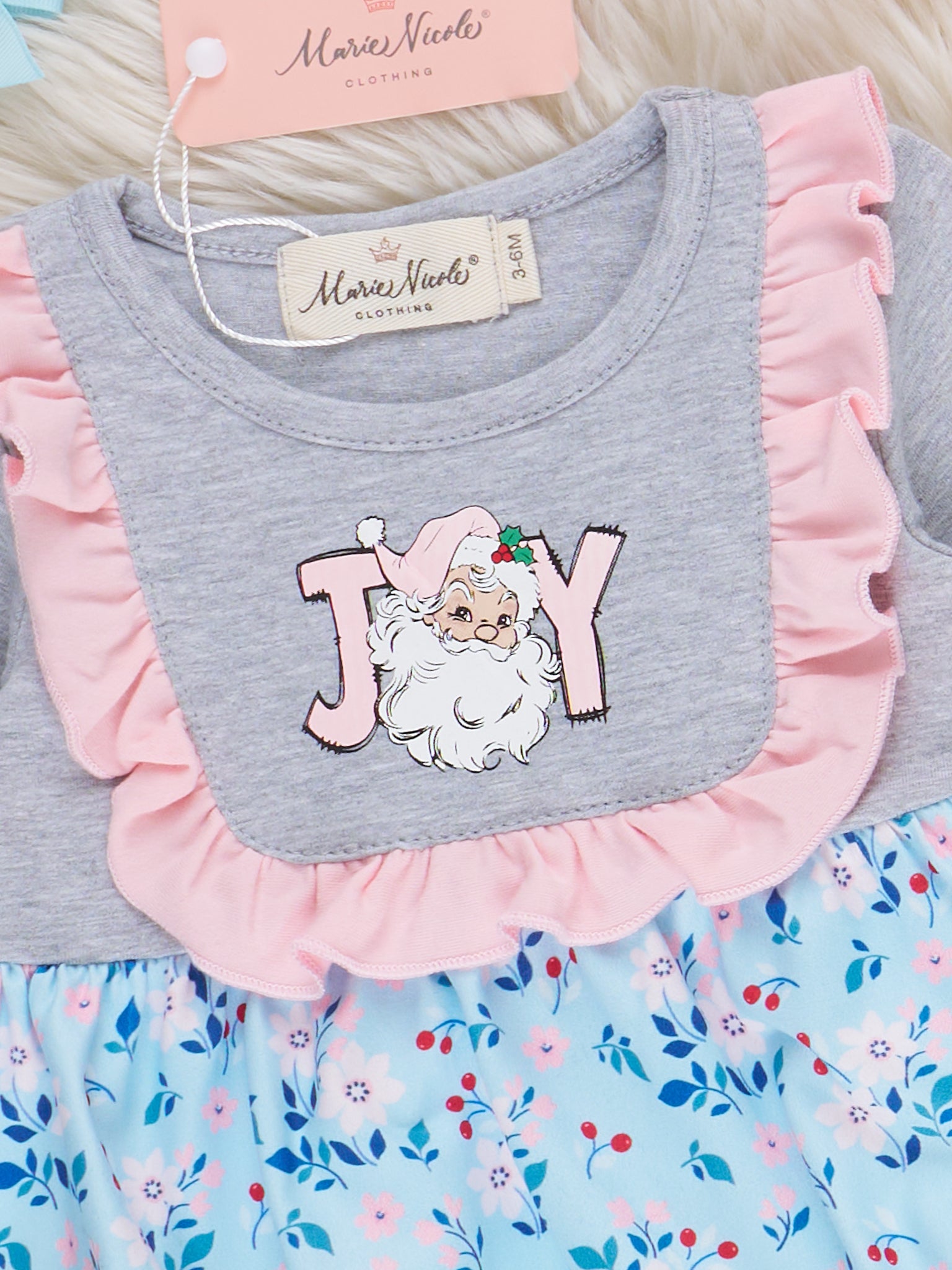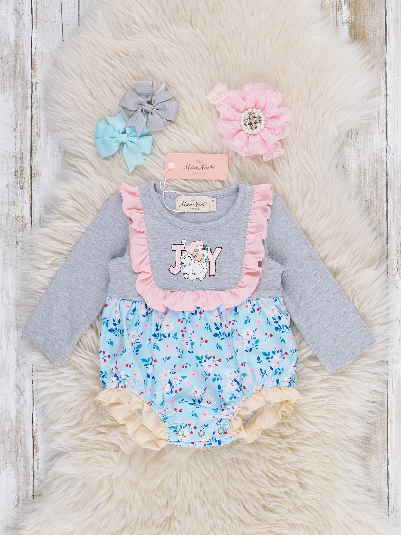 The Joyful Blooms Embroidered Ruffle Bubble Romper by Marie Nicole Clothing is a baby romper featuring “JOY” embroidery on a soft knit bodice with long sleeves, ruffled floral skirt accents, and matching pastel trim. This sweet ruffle bubble offers a delightful blend of cheerful embroidery and garden-inspired style, perfect for special occasions and comfortable everyday wear.