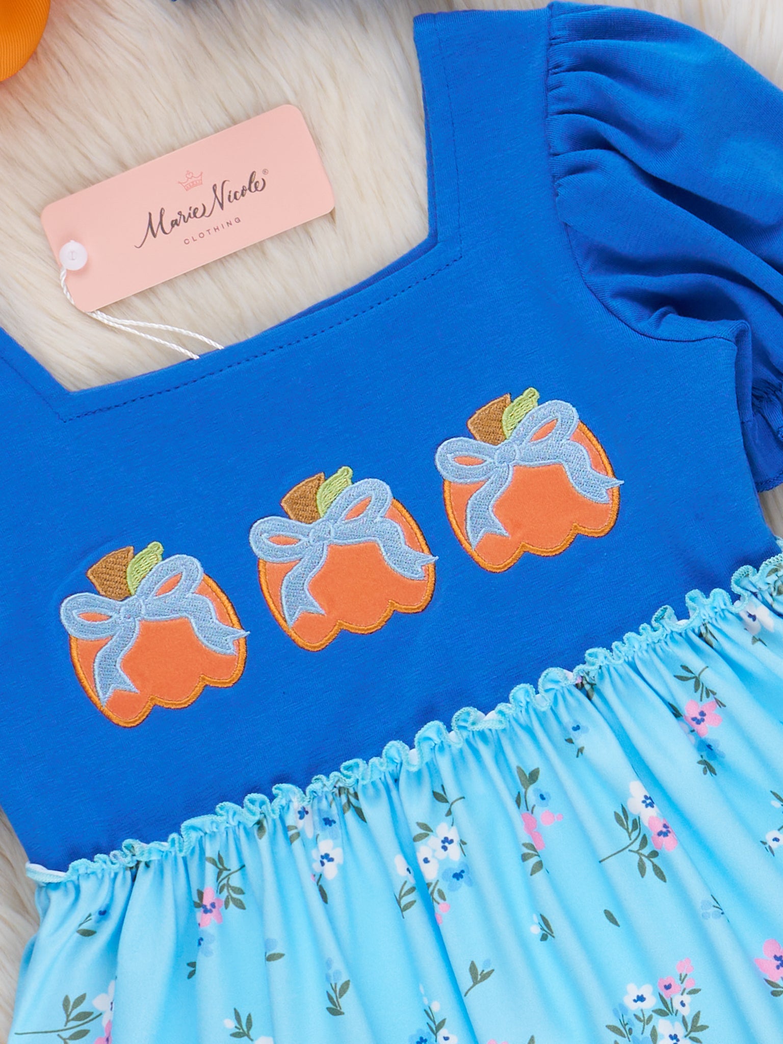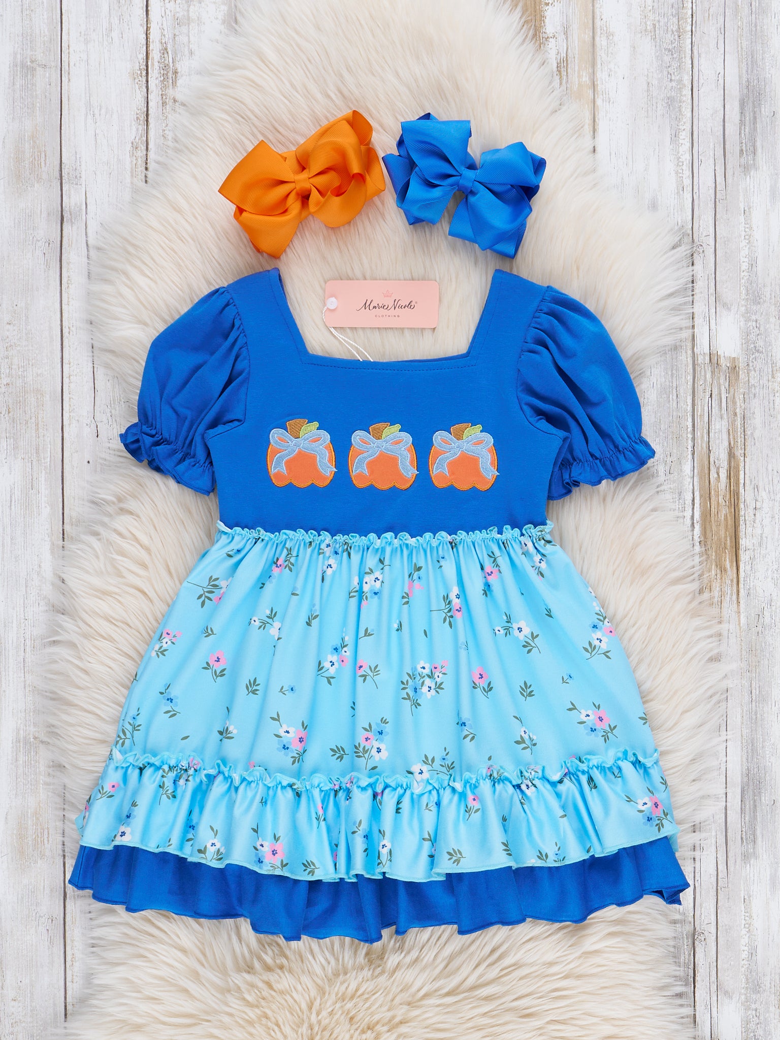 The Bow Pumpkin Petal Charm Embroidered Dress is a darling blend of autumn whimsy and sweet detail. Featuring charming embroidered pumpkins and bows, with petal accents, this dress from Marie Nicole Clothing is full of seasonal flair. With ruffle trim and soft, breathable fabric, it’s the perfect pick for fall outings, festive photos, and cozy cuddles all season long.