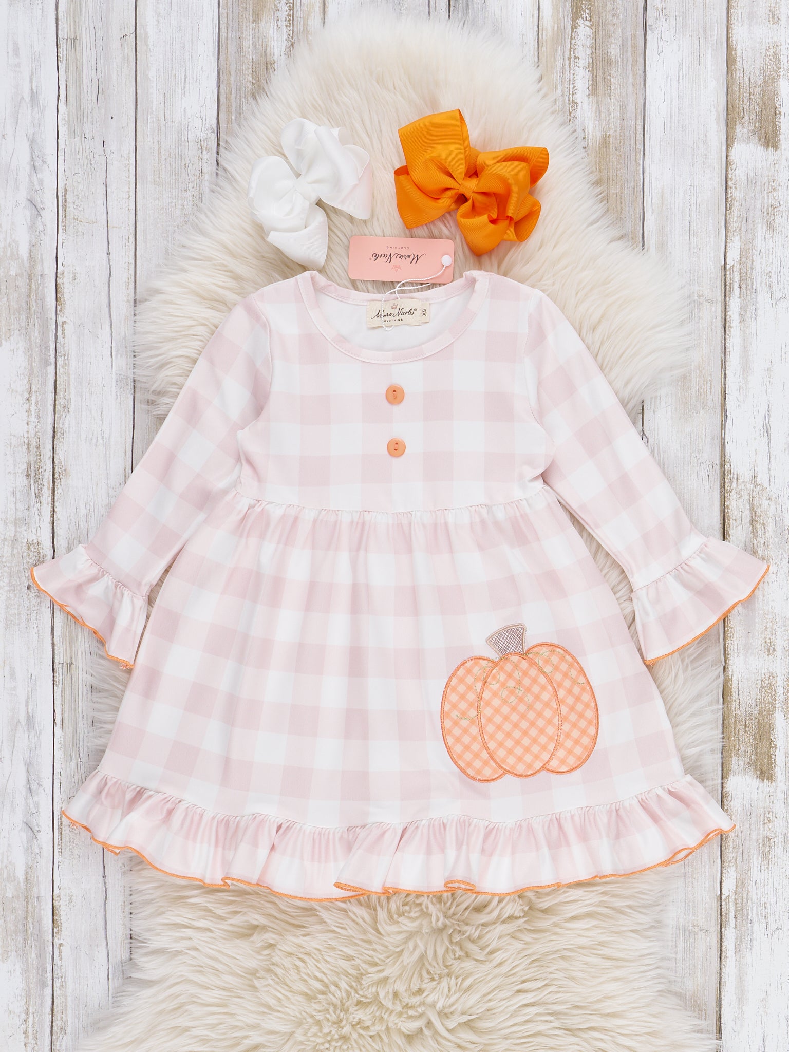 The weather is getting nicer, so it's the perfect time for the Picnic in the Pumpkin Patch Embroidered Plaid Ruffle Dress! This soft and comfy piece from Marie Nicole Clothing has a classic gingham pattern, accentuated with orange buttons, trim, and embroidered pumpkin. Enjoy a meal in the light sun and cool breeze with this lovely dress!