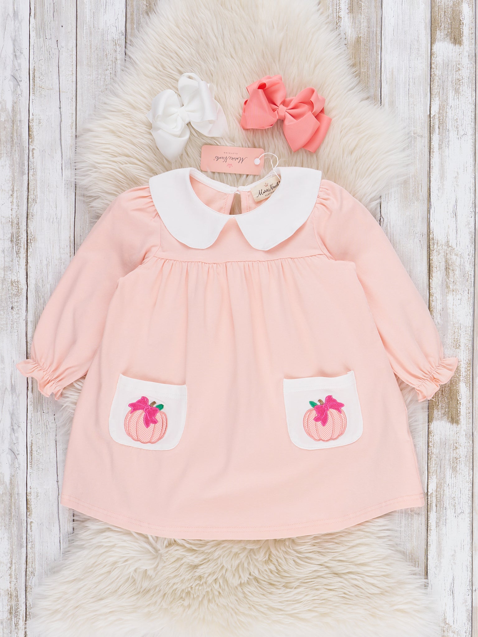 Pockets full of fall fun? The Pumpkin Pockets Embroidered Dress has got them! This comfy piece by Marie Nicole Clothing is pretty in pink and features embroidered pumpkins and a cute peter pan collar. Your little girl will love wearing this during fun activities, gatherings, and Thanksgiving occasions!