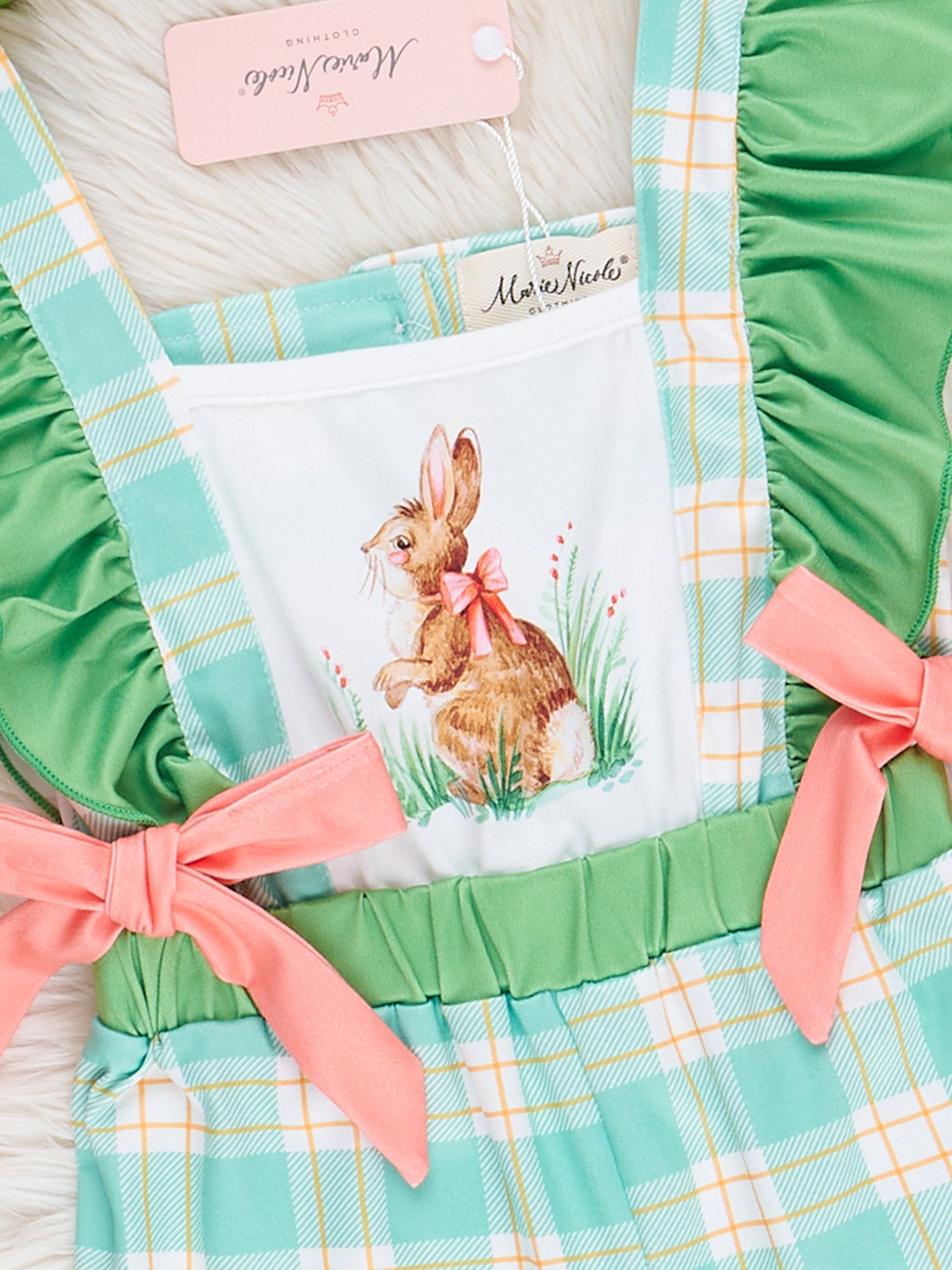 Hop into spring with this adorable Bright Bunnies Plaid Jumpsuit! Perfect for Easter celebrations, this jumpsuit features a cute bunny print on a beautiful plaid green background. Get ready to "hop" into style with this must-have look.