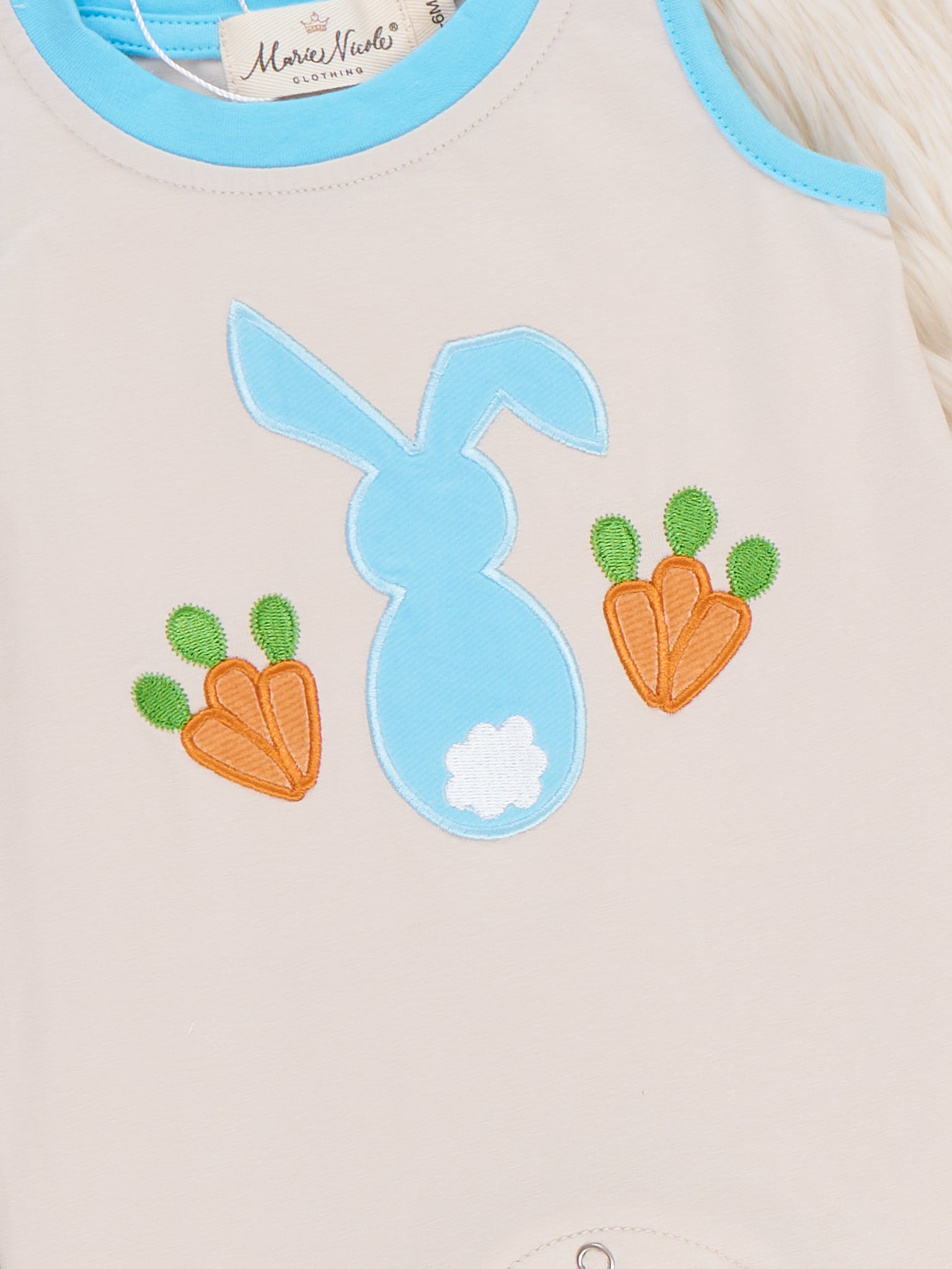 Bunny & Carrot Patch Embroidered Cotton Johnny by Marie Nicole Clothing is a sleeveless shortall featuring a center appliqué of a bunny and carrot accents. Designed with soft knit fabric, complementary trim, and snap openings for easy changes, this springtime jonjon is ideal for Easter, farm visits, or sunny day outings.