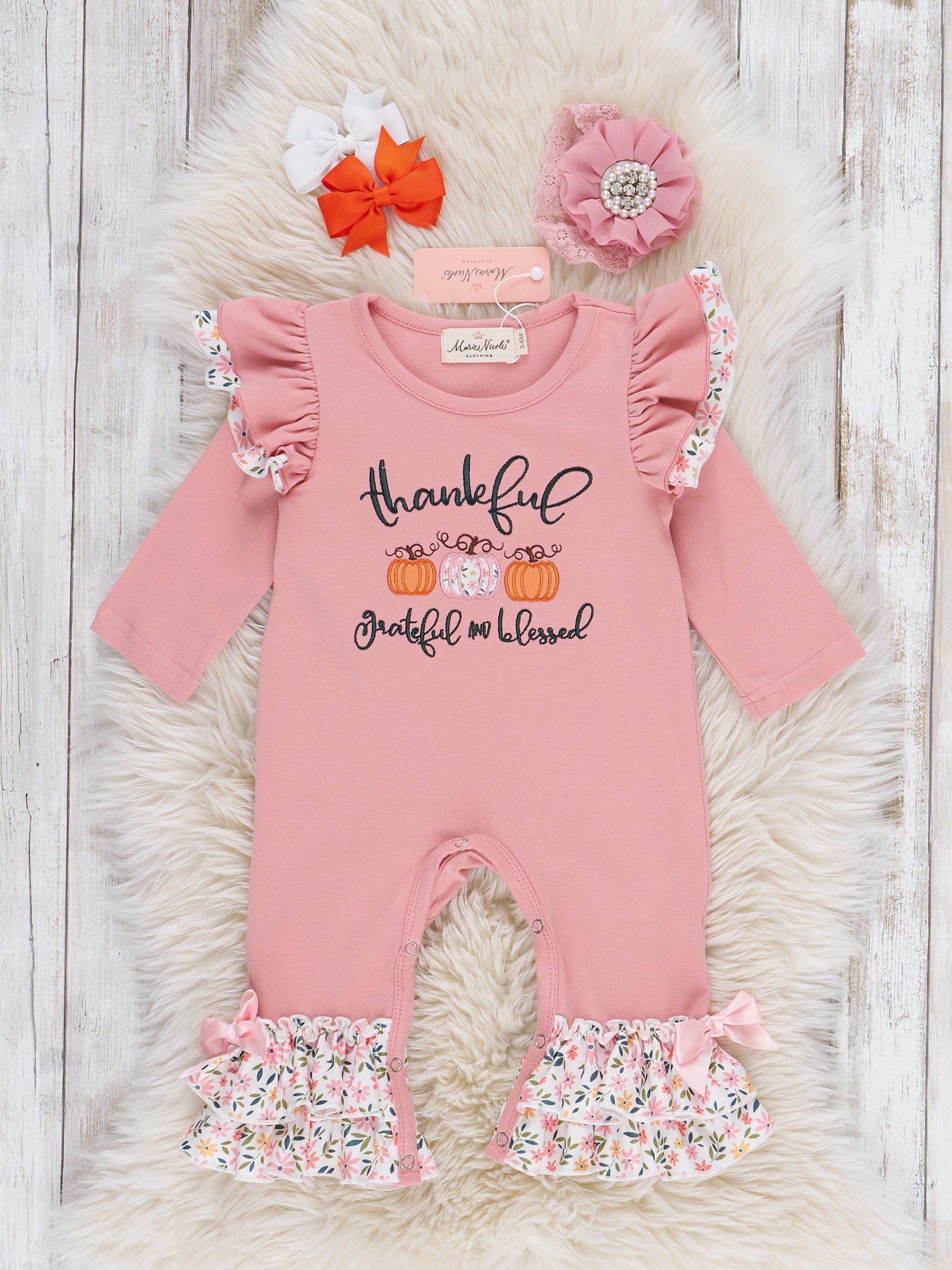 Thankful Graceful & Blessed Pumpkin Ruffle Romper