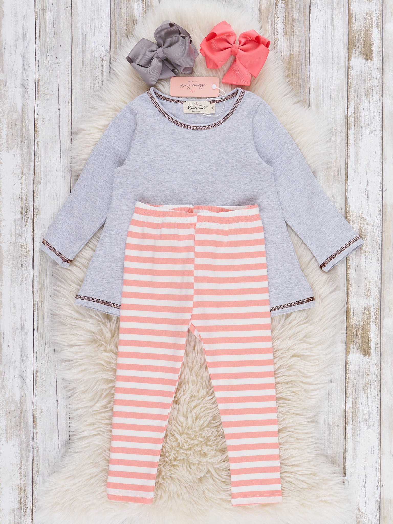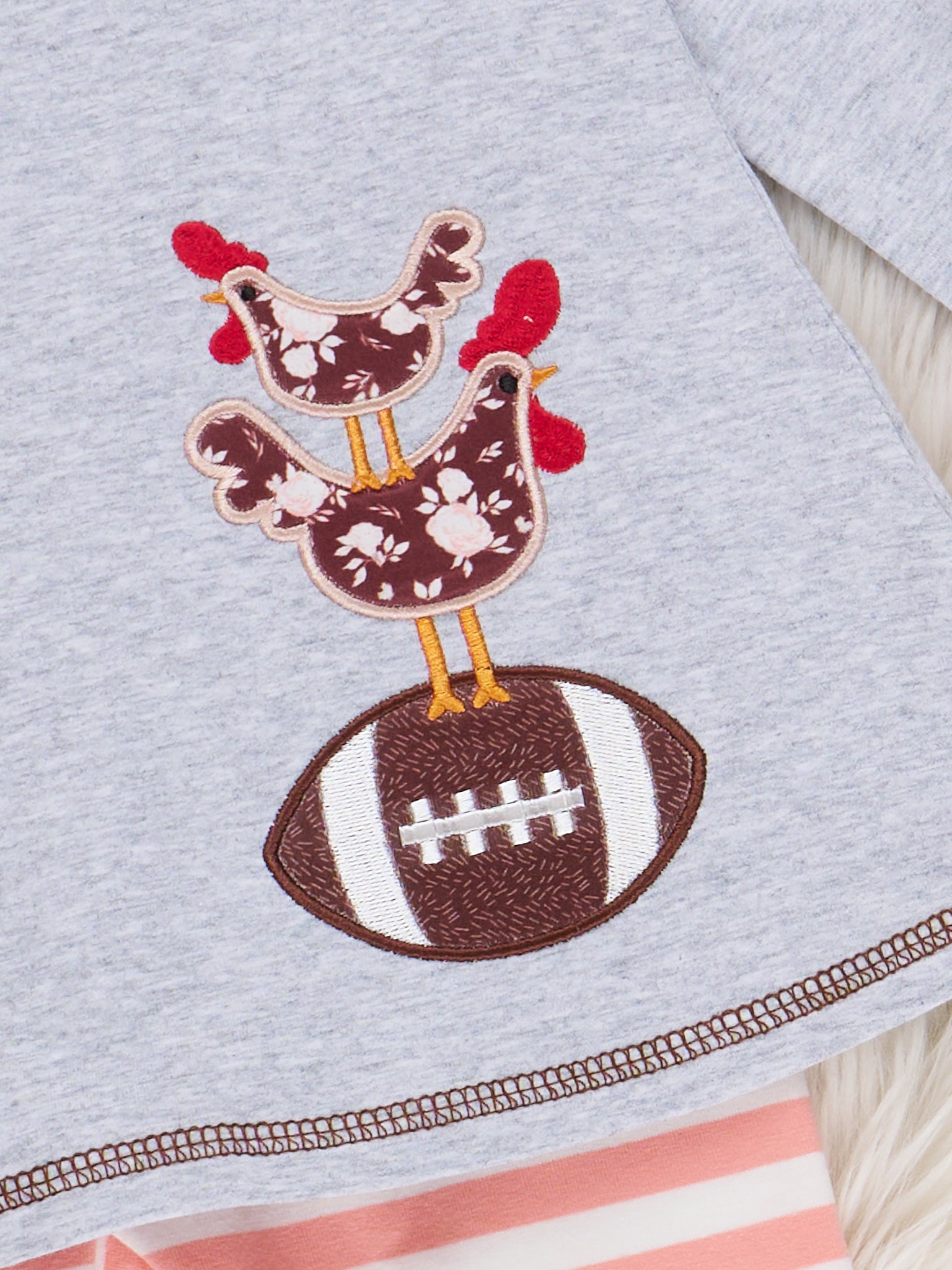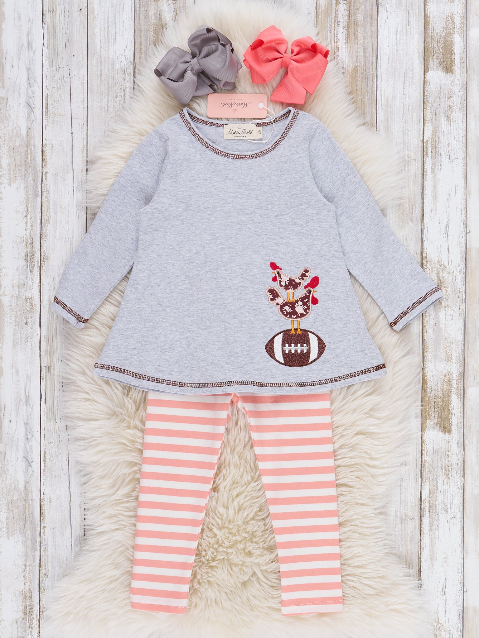 Celebrate two special occasions at once -- football and Thanksgiving! The Fowl Play Embroidered Striped Outfit is an adorable two-piece set by Marie Nicole Clothing, with embroidered poultry and footballs. With a loose top and comfy leggings, your girl can run, play, or rest in this fun outfit.