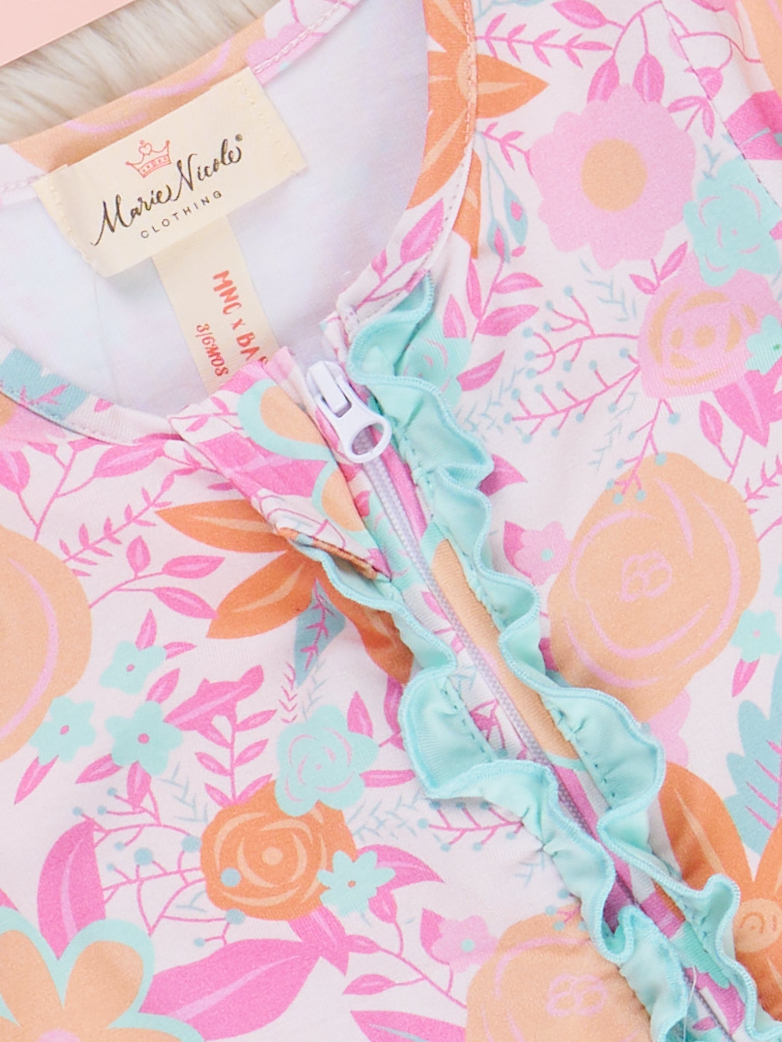 Let your little one sleep in style with our Hibiscus Buds Ruffle Footed Sleeper Pajamas. These baby girls pajamas feature a playful pink & orange tropical print, accented with teal ruffle trim for a touch of sweetness. The asymmetrical zipper closure ensures a comfortable fit, and you can complete the look with our matching sleep set. Perfect for summer from Marie Nicole Clothing.