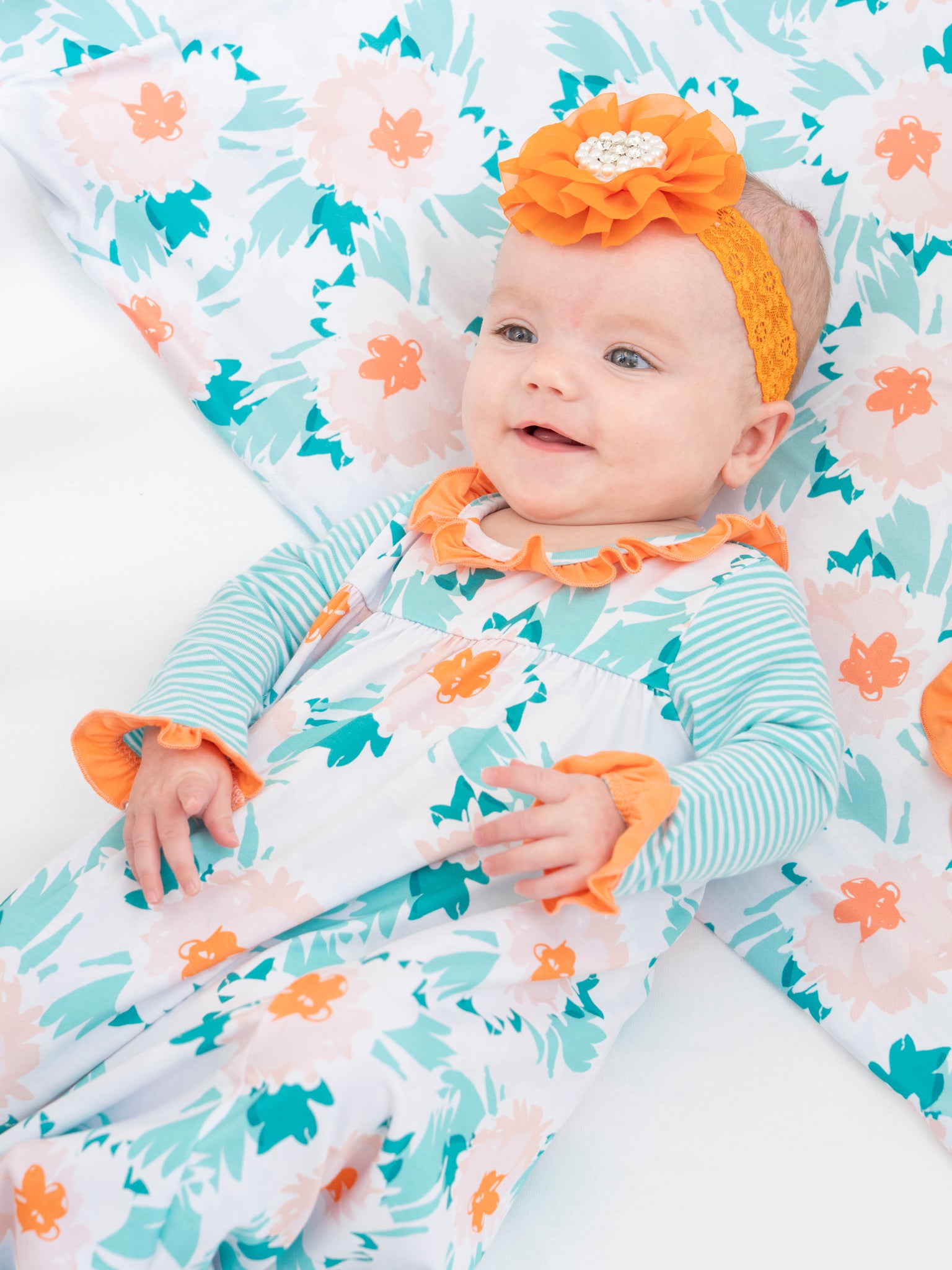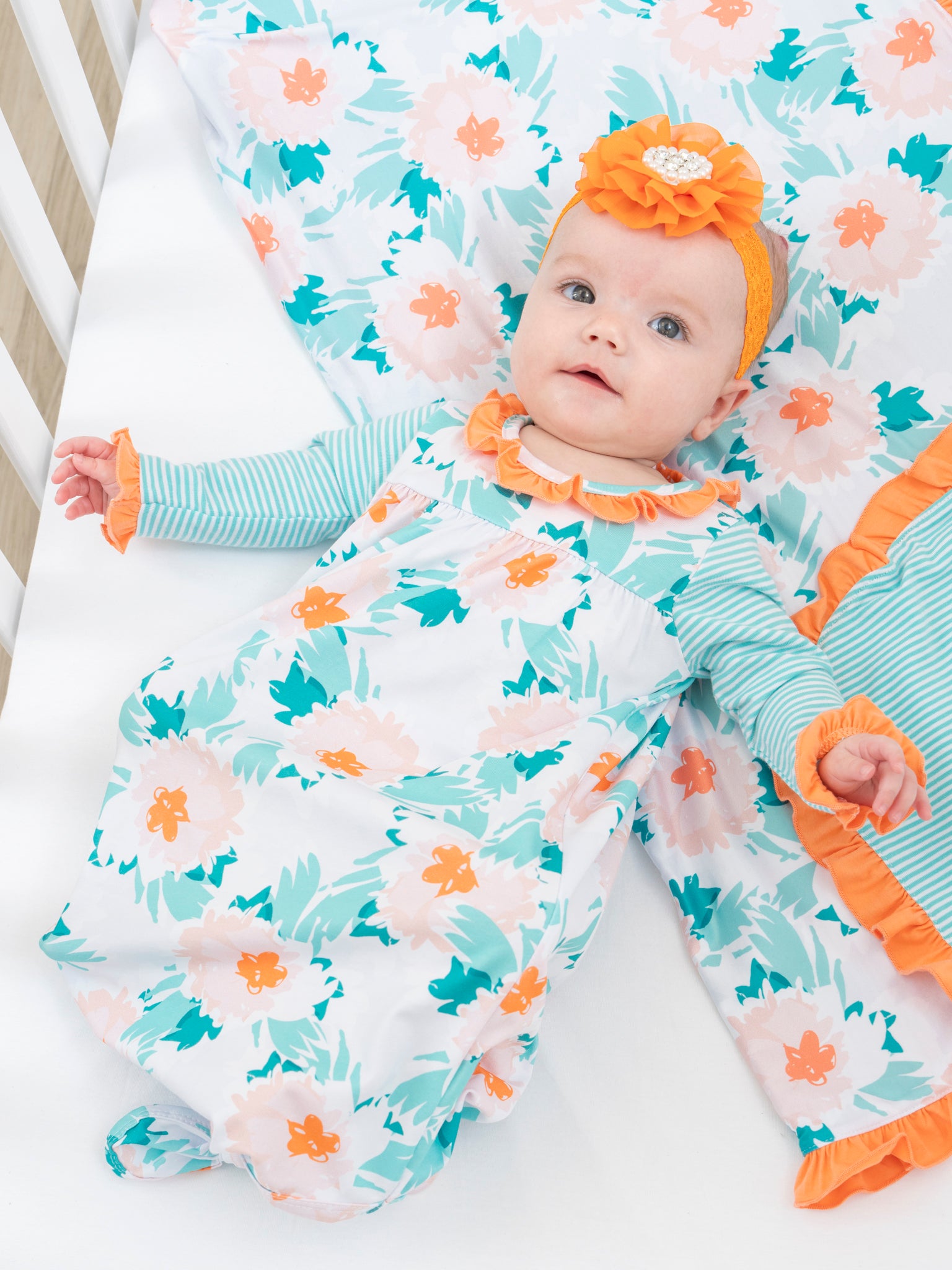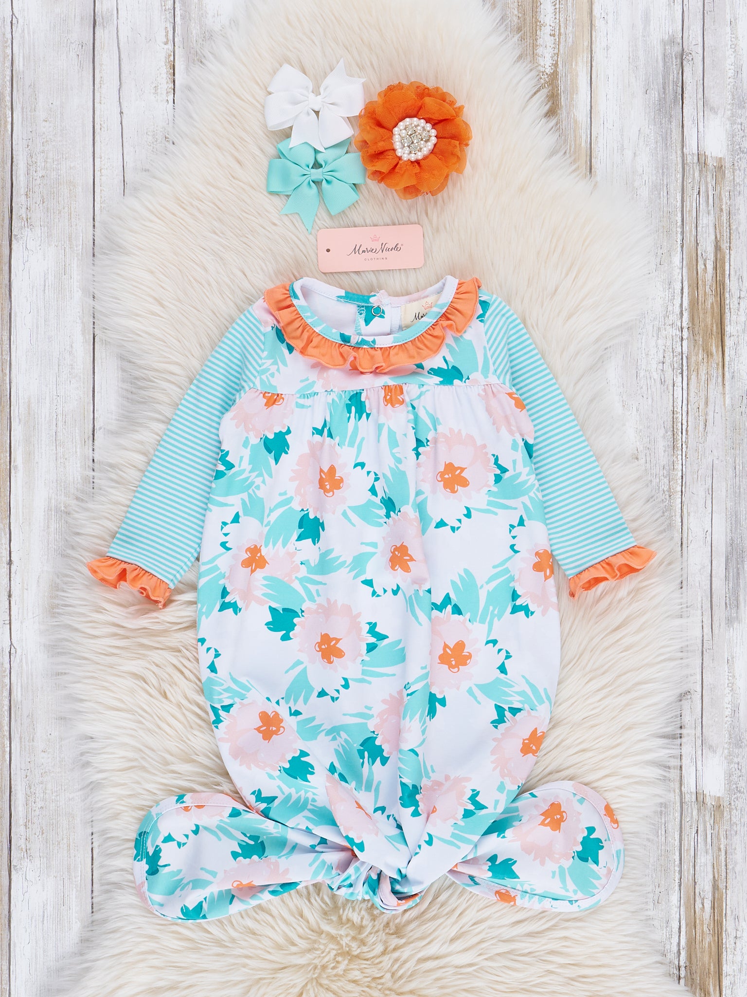 Add a touch of whimsy to your little girl's sleep routine with the Pretty Petals Ruffle Knot Gown. The vibrant orange and teal flowers and playful ruffle detail make this sleep gown a must-have for any sister sleep set. Made by Marie Nicole Clothing, it's perfect for your growing little one on those warm summer nights. Sleep tight!