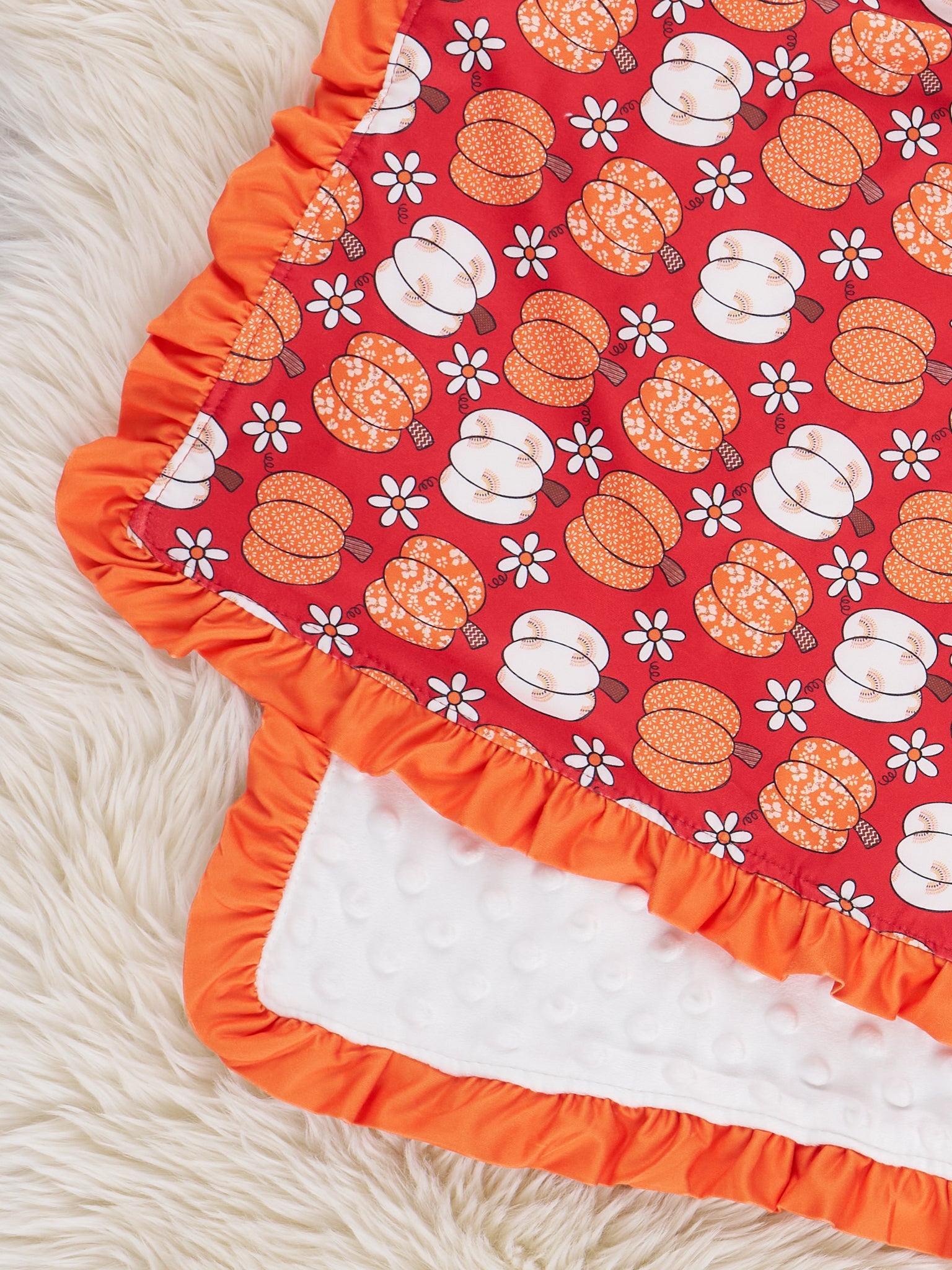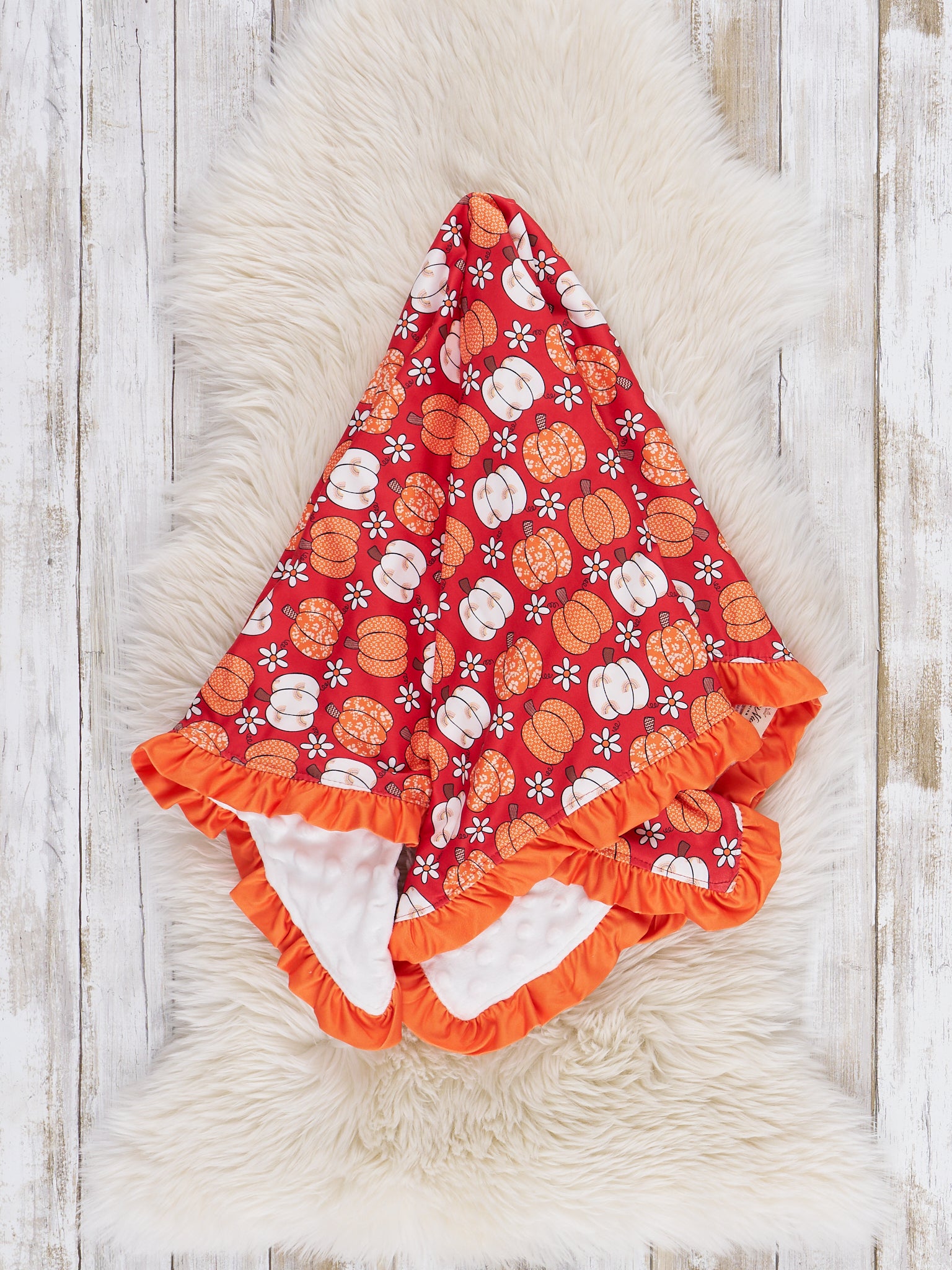 Pumpkins, pumpkins, and more pumpkins! The Maroon Pumpkin Wagon Embroidered Minky Blanket by Marie Nicole Clothing brings autumn cheer for the little ones with pumpkins and ruffles. The fun pattern and soft fabrics will keep your comfy this fall season!