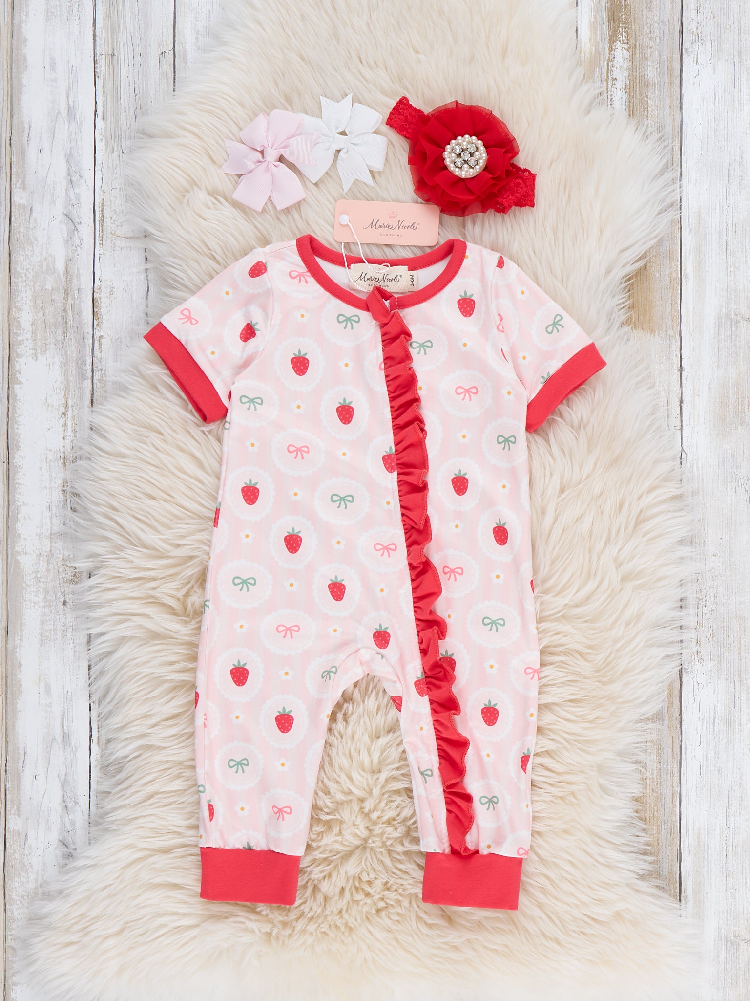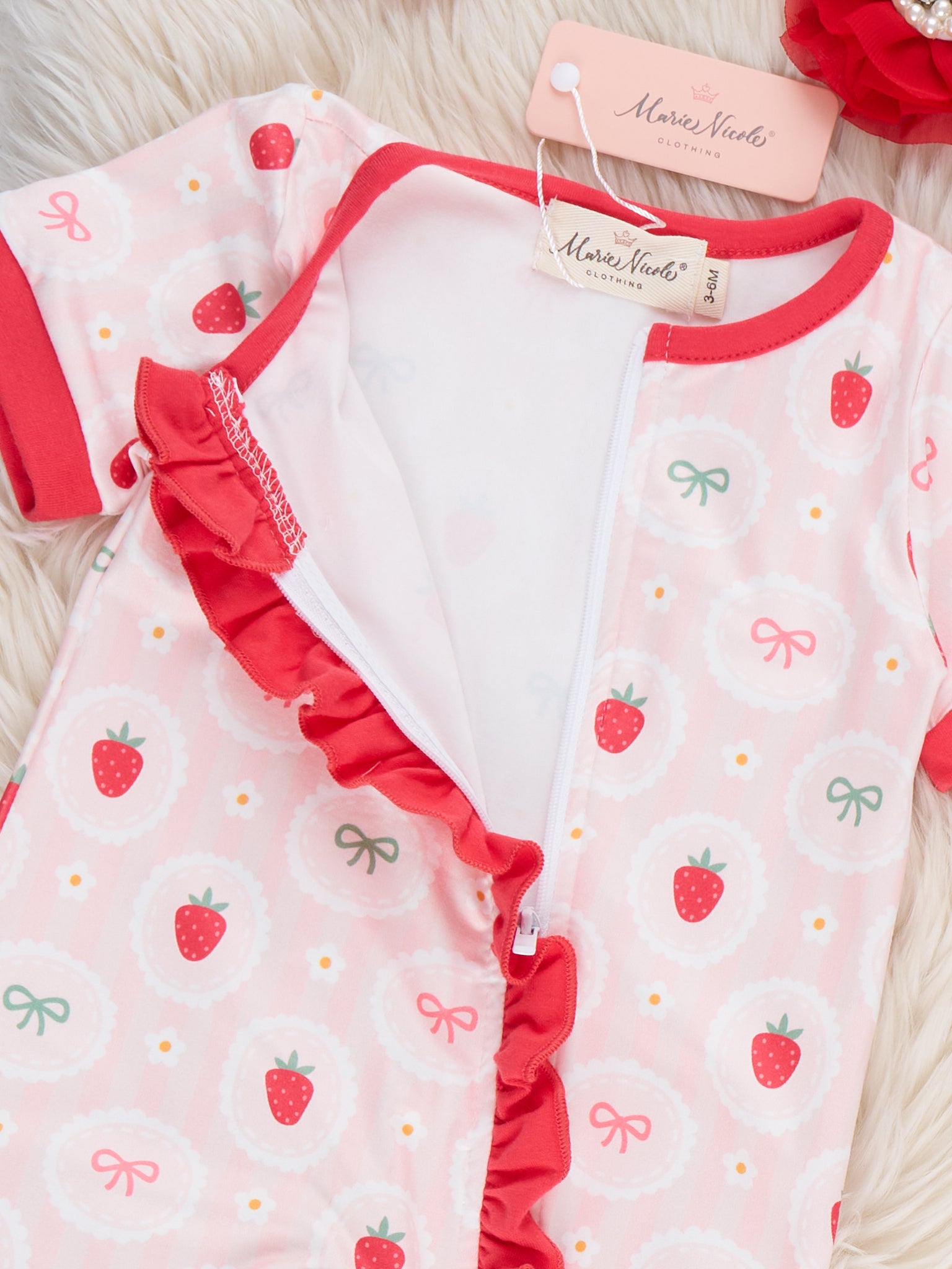 The Strawberry Dreams Sleeper Pajamas by Marie Nicole Clothing wrap baby in cozy sweetness with an allover berry-and-bow print and a playful front ruffle tracing the easy-zip closure. Soft, stretchy fabric and snug cuffs keep little ones comfortable for naps and nighttime, while the full-length design makes these pajamas perfect for snuggly, dream-filled sleep.