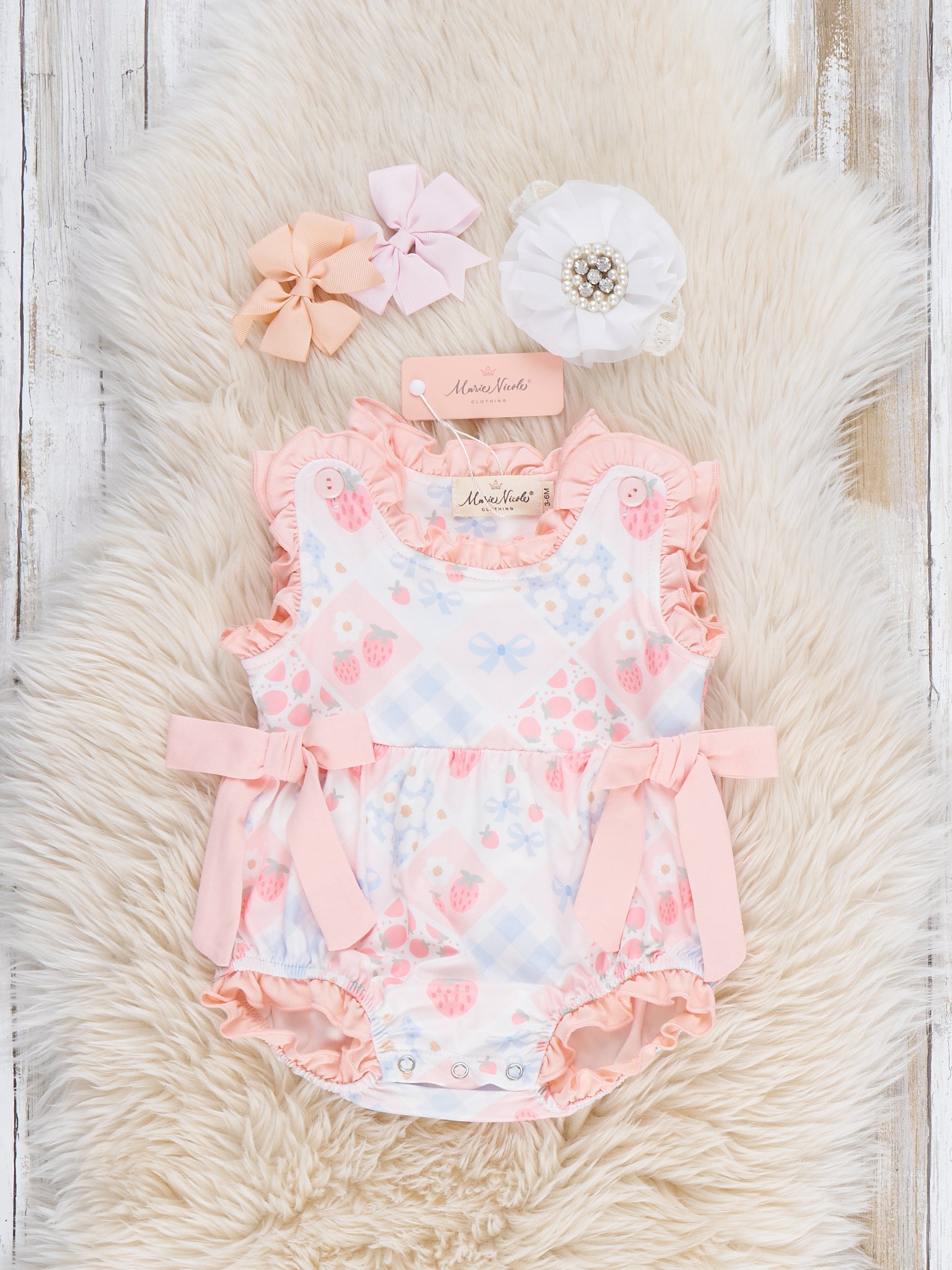 The Strawberry Sherbet Ruffle Bubble by Marie Nicole Clothing wraps baby in dreamy sweetness with its soft patchwork-style berry print, fluttery ruffle trim, and bow-tied sides. Gentle fabric, elastic leg openings, and convenient snaps keep little ones comfy and make changes easy for special outings, photos, and everyday snuggles.