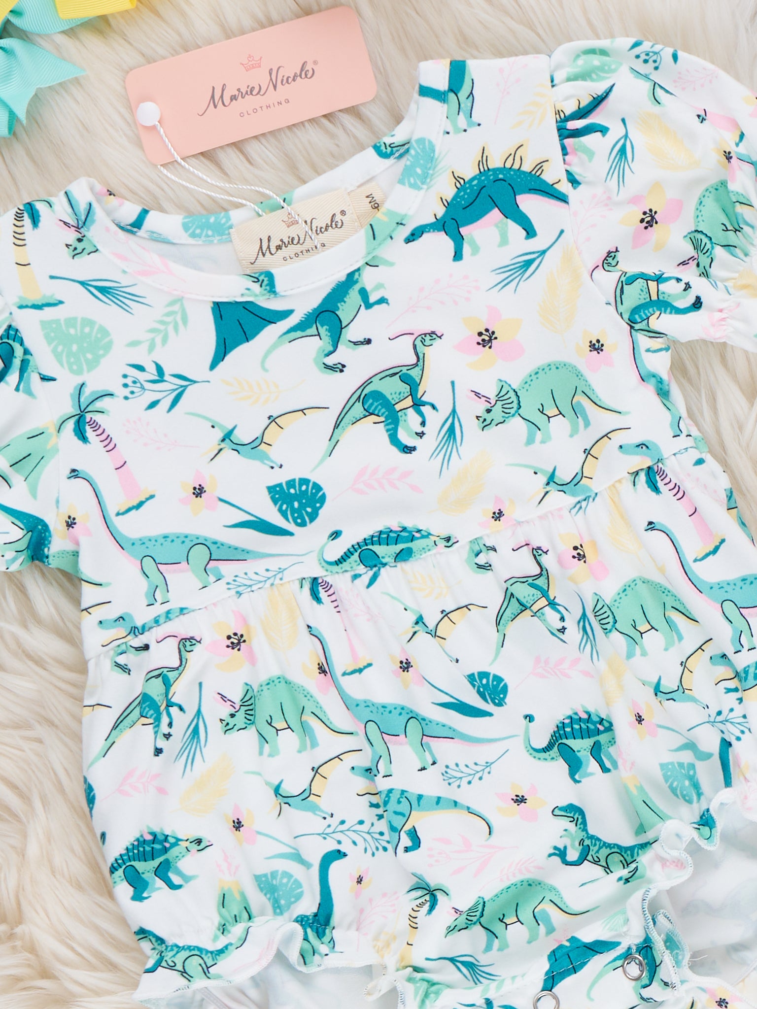 The Sweet Jurassic Garden Ruffle Bubble by Marie Nicole Clothing combines dino-loving fun with sweet baby style, featuring an allover prehistoric print and gentle ruffle details. Soft fabric, elastic leg openings, and convenient snaps keep little explorers comfy and make changes easy, creating a one-piece outfit perfect for playtime, naps, and adorable photo moments.
