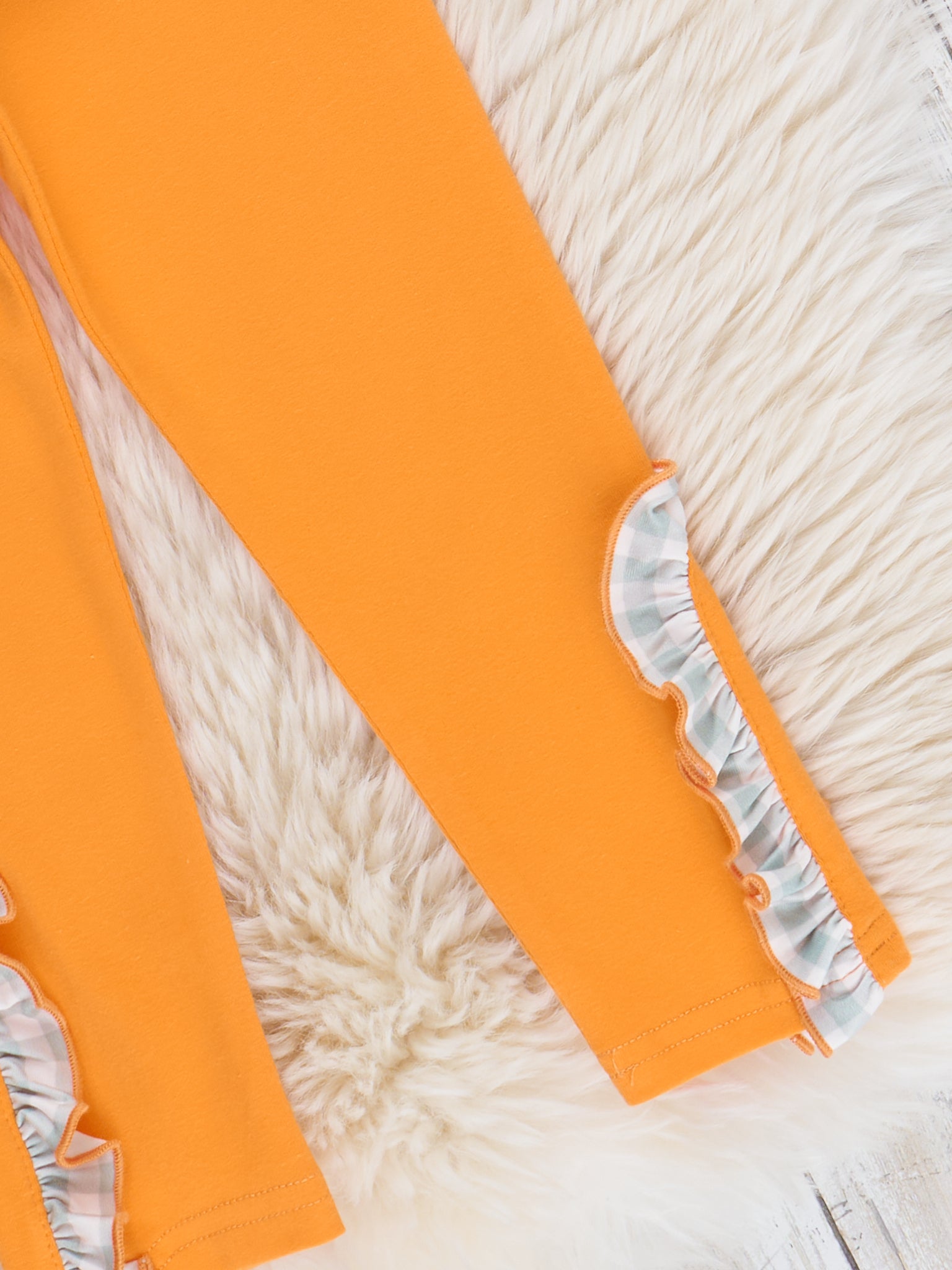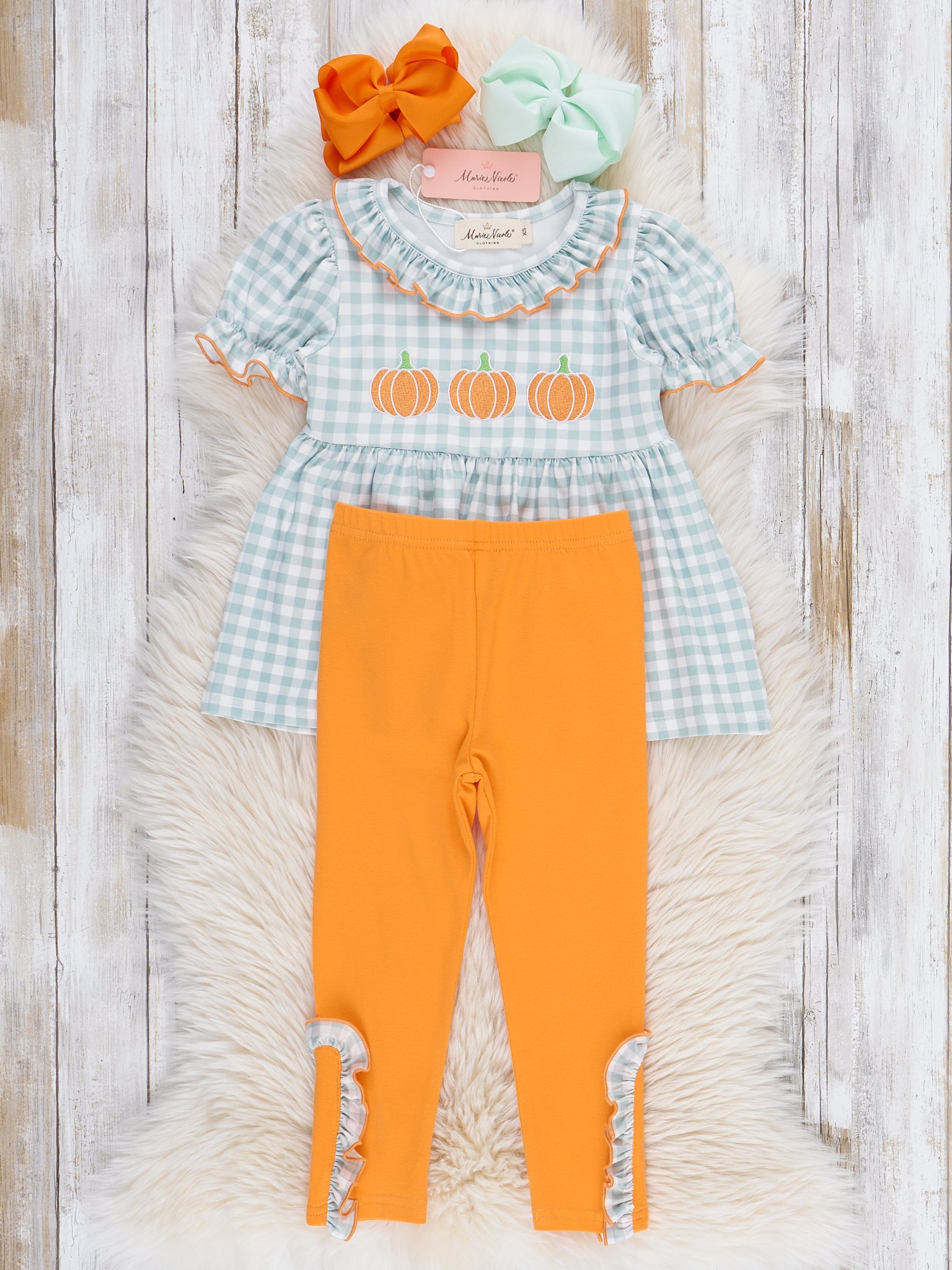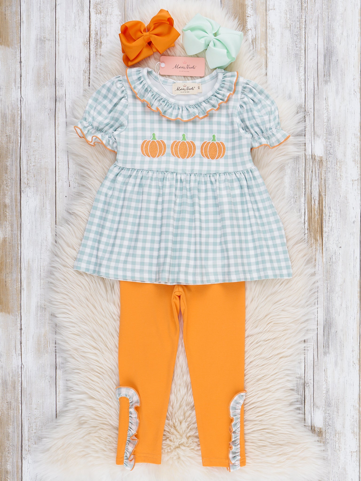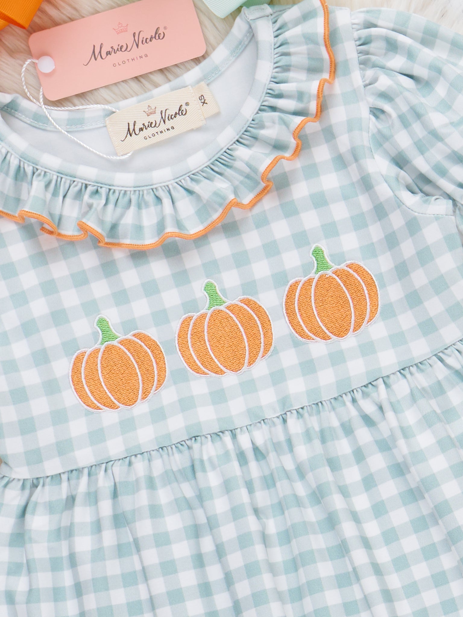 The Gingham Pumpkin Spice Embroidered Outfit is a cozy and charming pick for fall celebrations. Featuring delicate pumpkin embroidery on a classic gingham pattern, this outfit from Marie Nicole Clothing blends timeless style with seasonal warmth. Crafted from soft, breathable fabric and finished with gentle ruffle details, it’s perfect for pumpkin patch visits, family gatherings, and picture-perfect autumn moments.