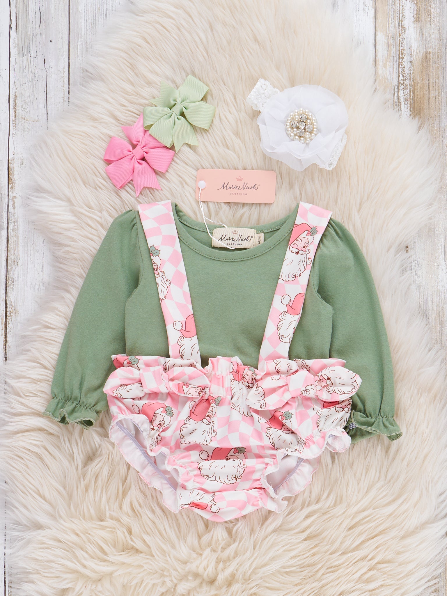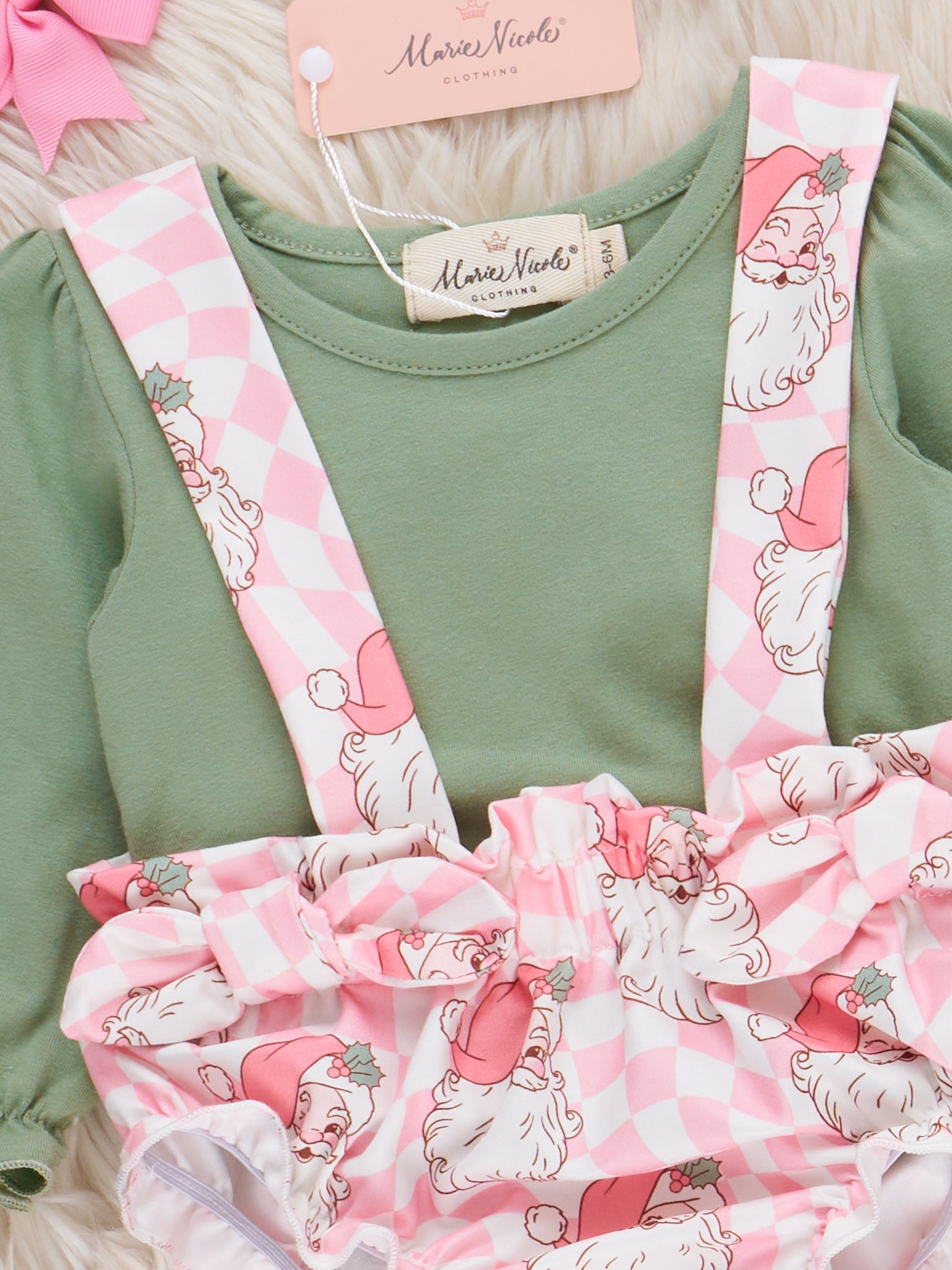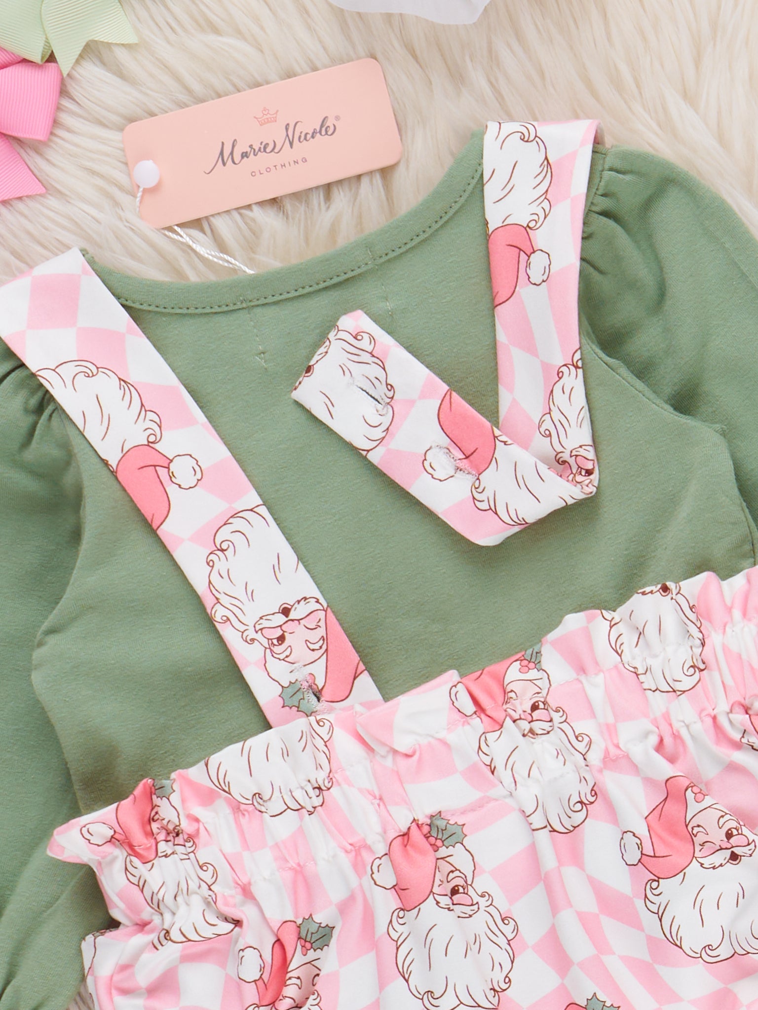 The Sweet Prairie Overall Bloomers Outfit by Marie Nicole features a long-sleeve top paired with adorable suspender bloomers, decorated with a playful checkered pattern and sweet Santa motif. Ruffle accents and a charming bow at the waist add a touch of Christmas-inspired whimsy, making this two-piece set perfect for everyday play or winter occasions.