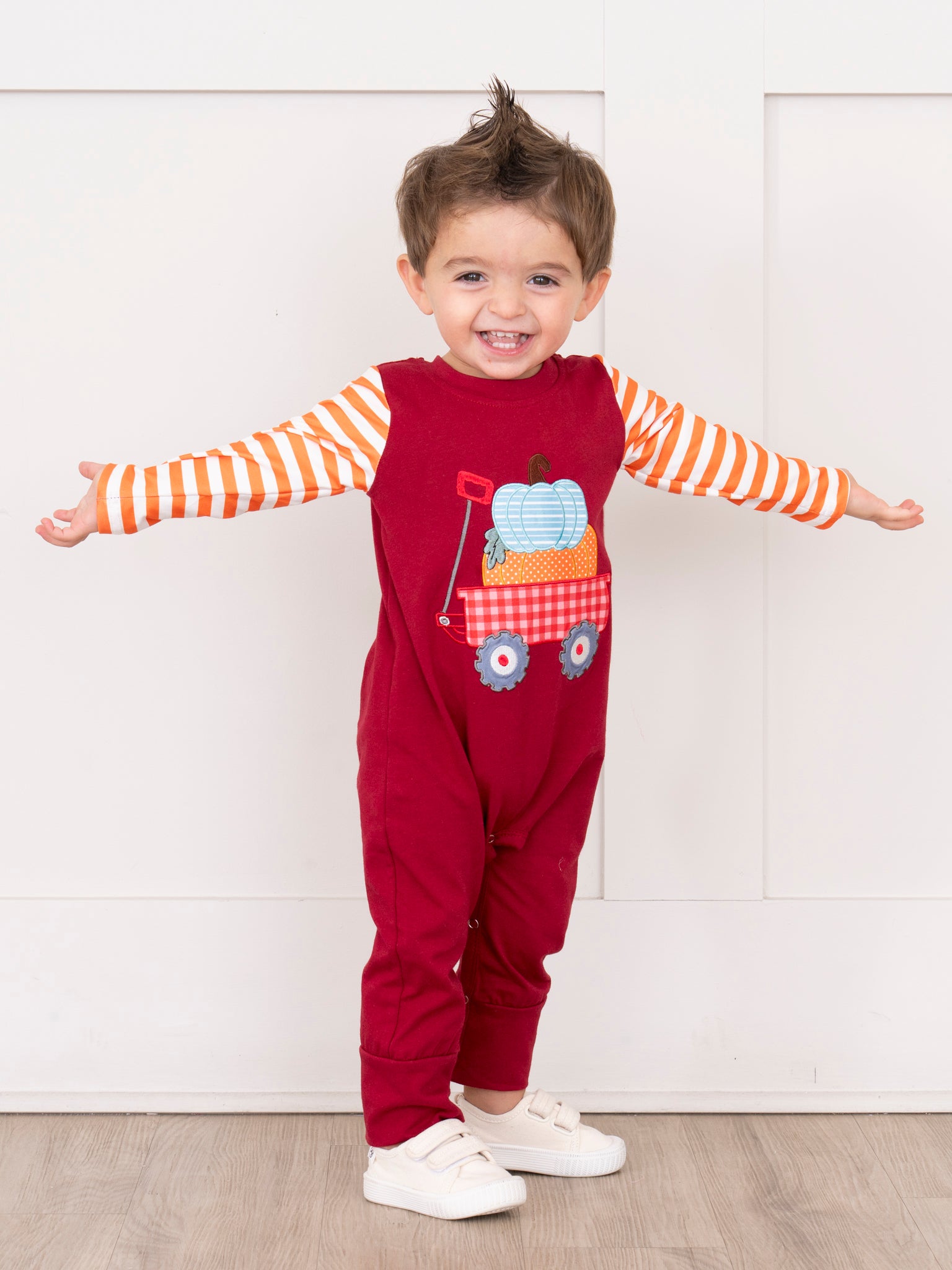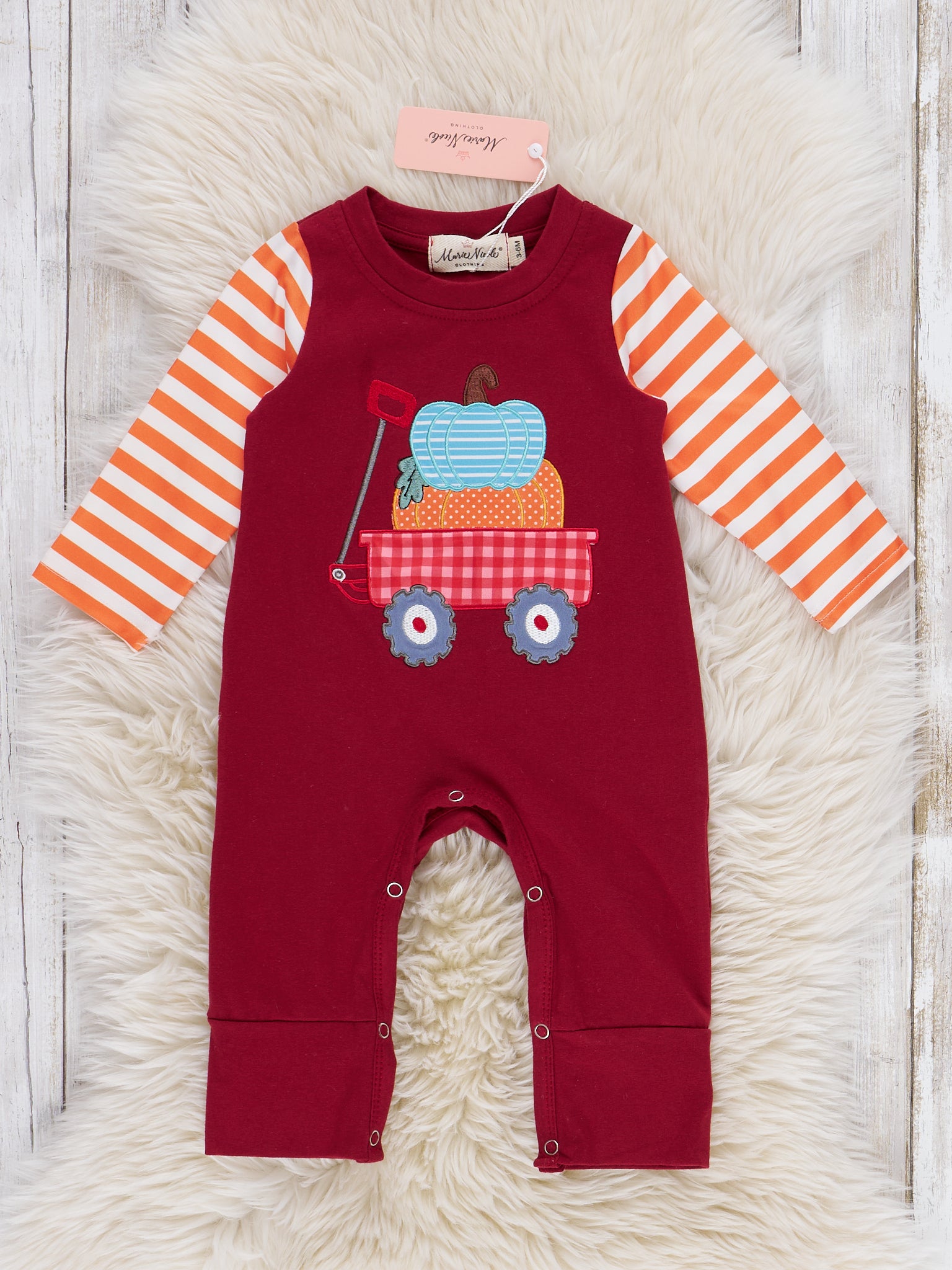 Pumpkins and pumpkins! The Maroon Pumpkin Wagon Embroidered Striped Romper by Marie Nicole Clothing brings autumn cheer for the little ones with embroidery and stripes. The fun pattern and soft fabrics will keep your little one stylish, expressive, and comfy this fall season!