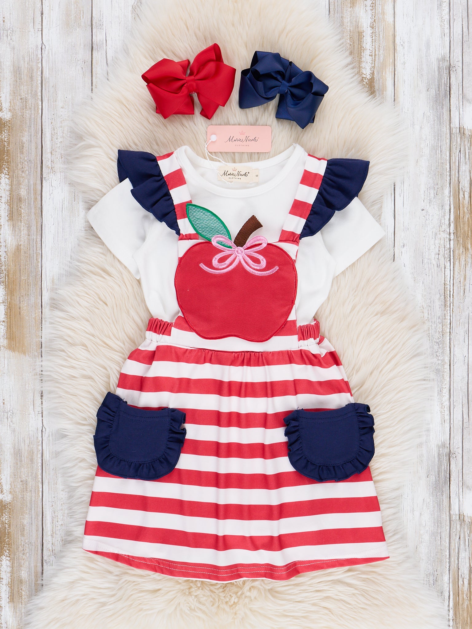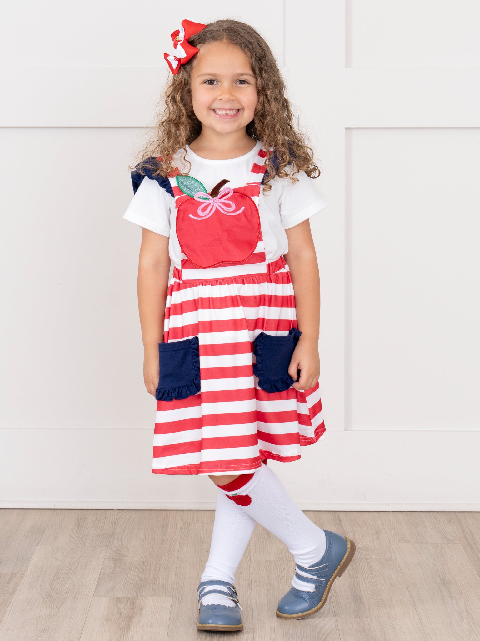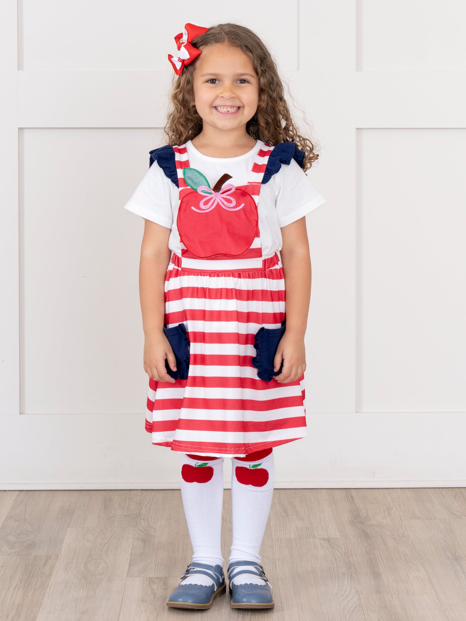 The Striped Embroidered Apple Skirtall Outfit is a playful and polished look perfect for back-to-school and everyday fun. Featuring classic stripes paired with charming apple embroidery, this skirtall from Marie Nicole Clothing is both stylish and comfortable. Made from soft, breathable fabric, it’s ideal for classroom adventures, family outings, or any day she wants to stand out with timeless charm.