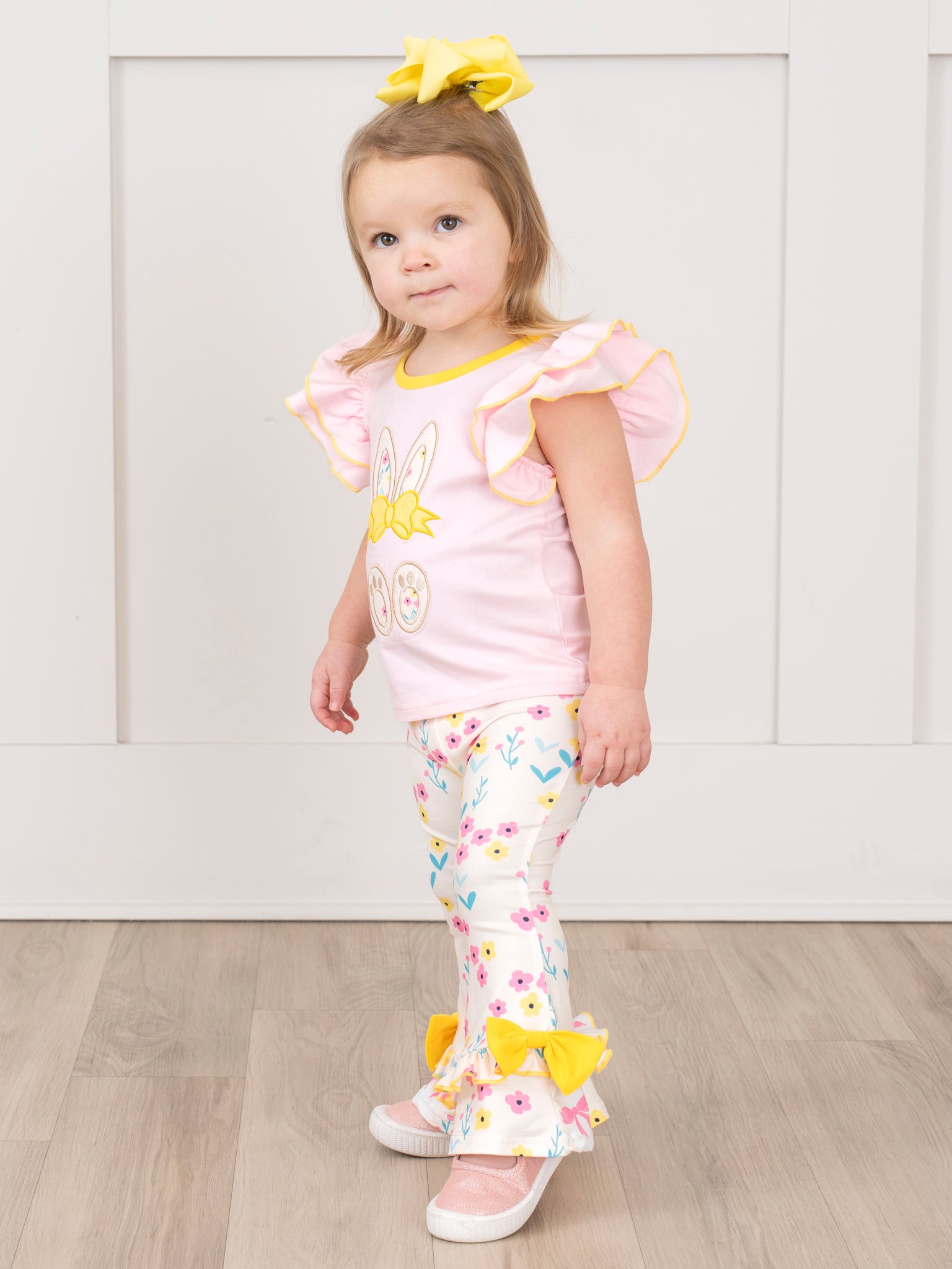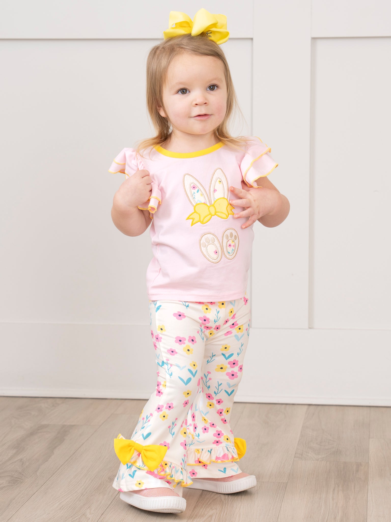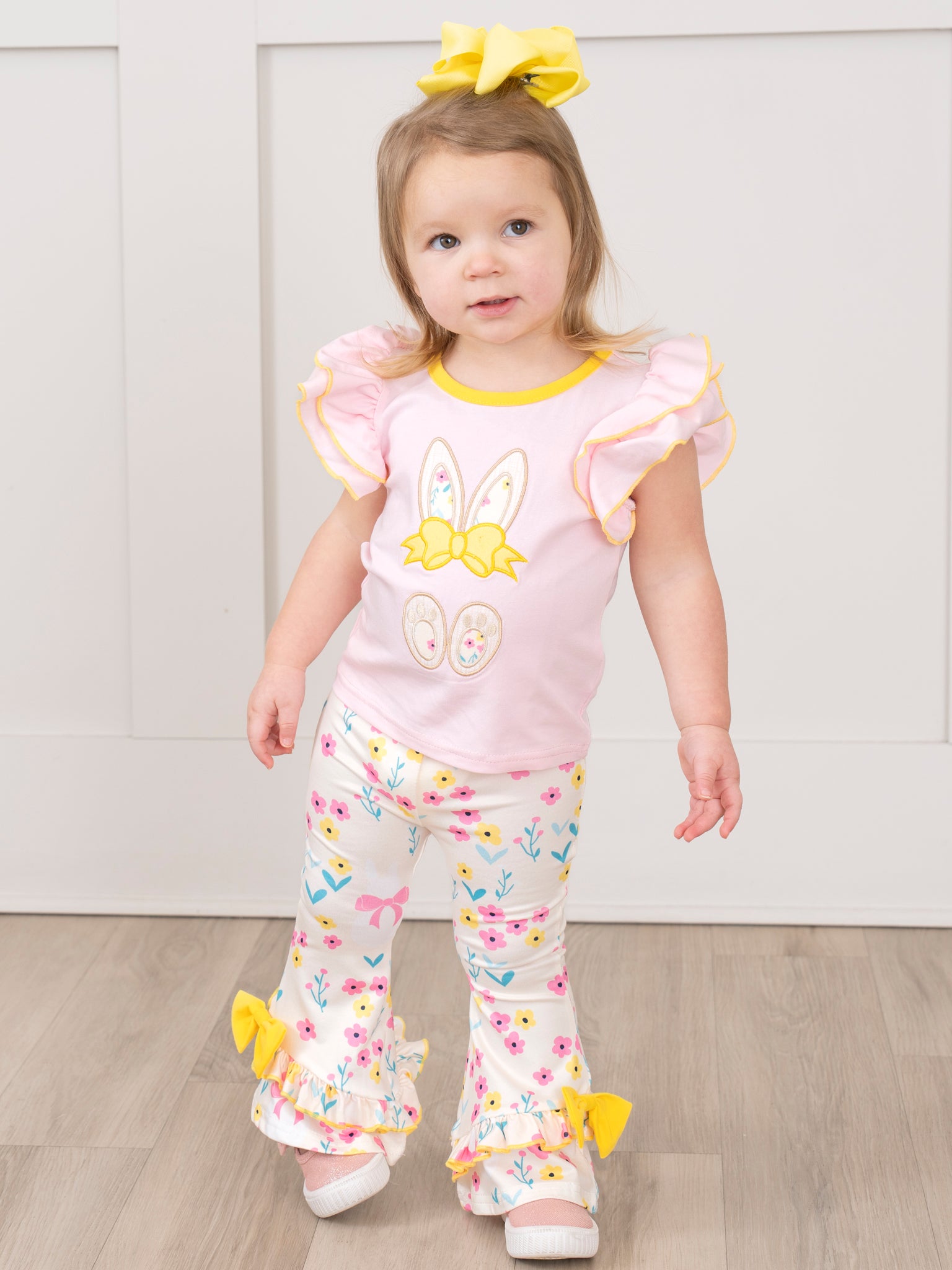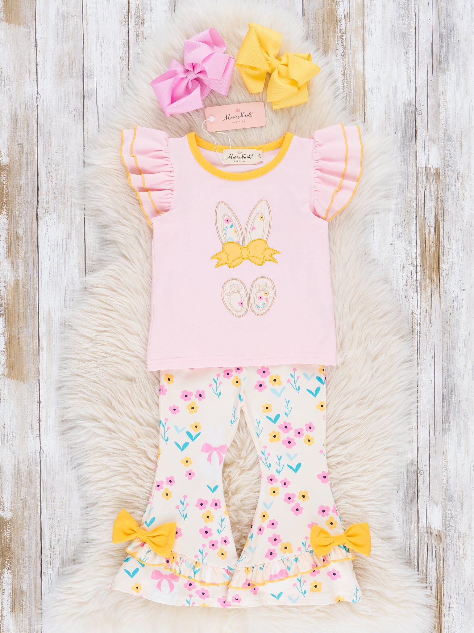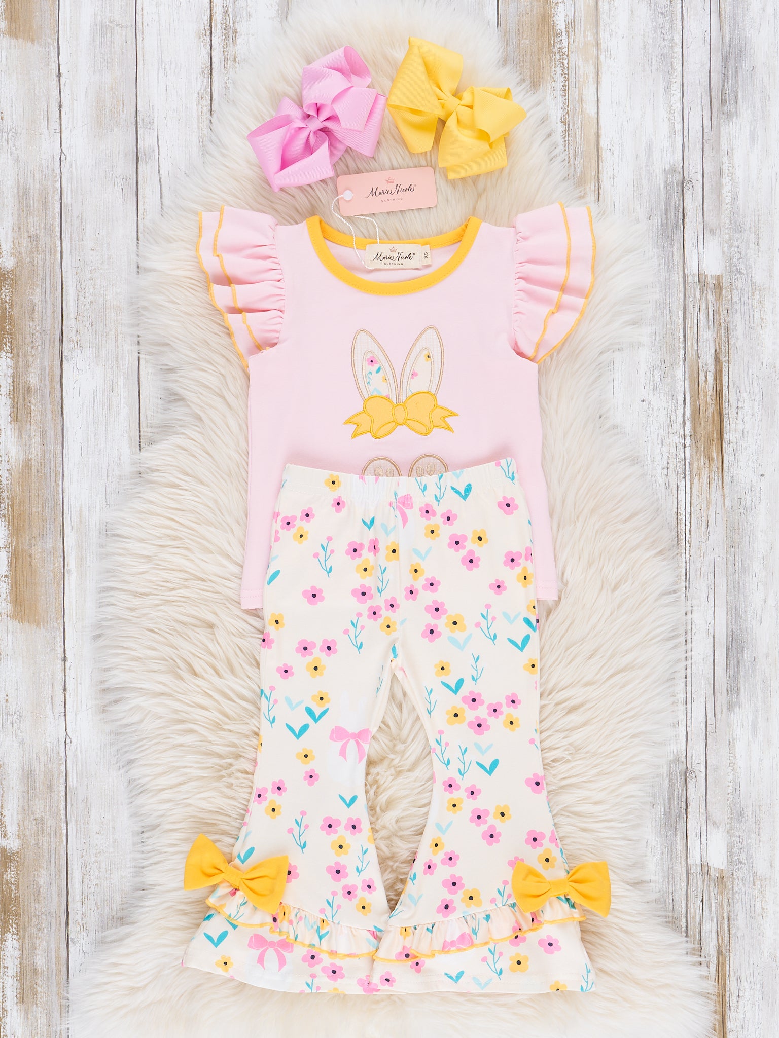 This Pink & Yellow Embroidered Floral Bunny Ruffle Outfit by Marie Nicole Clothing is perfect for matching sisters! The cute embroidered bunny adds a fun touch, while the floral ruffles give a sweet and girly look. Your little ones will look adorable and ready for any occasion in this charming and unique outfit.