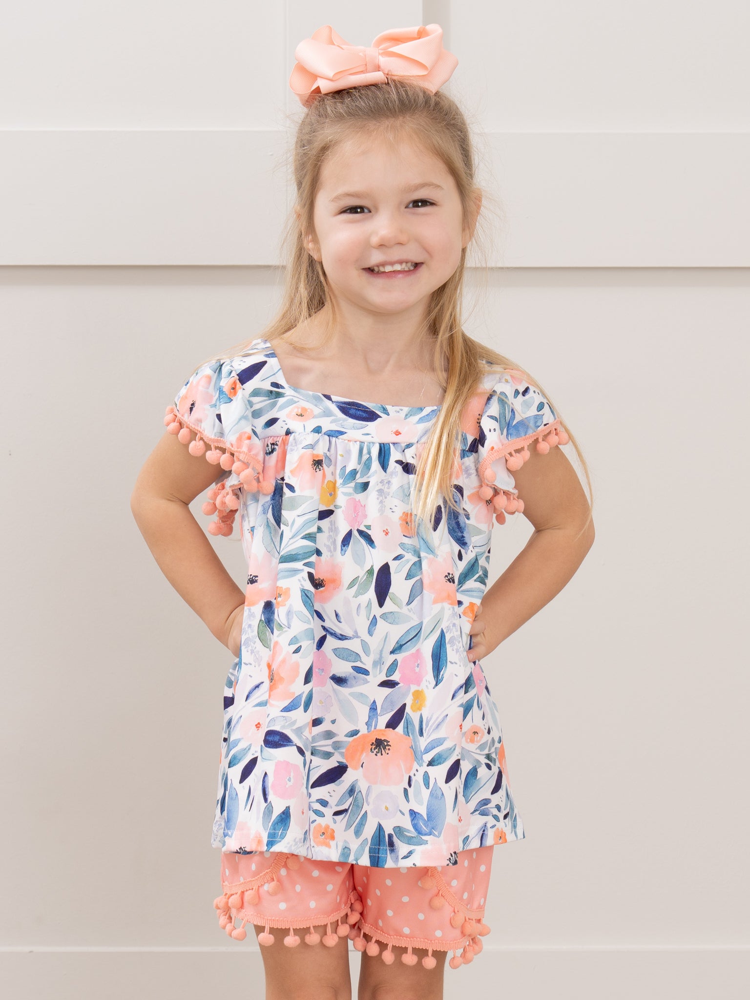 Our stunning Blushing Susie Shorts & Tank Pom Pom Outfit by Marie Nicole Clothing has something for everyone! This sweet 2 piece set includes a Blushing Susie ruffle tank & peach polka dot shorts with pom pom details. So sweet!