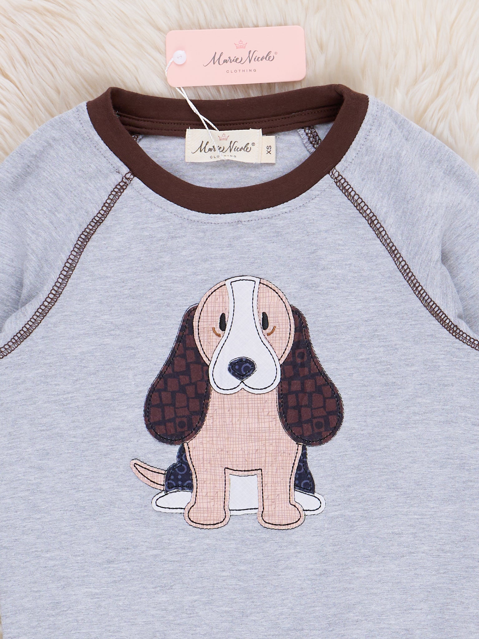 This sweet brother set deserves a round of A-PAWS! This grey long sleeve top features a darling puppy appliqué & brown accent at the collar, sleeves, and hem.