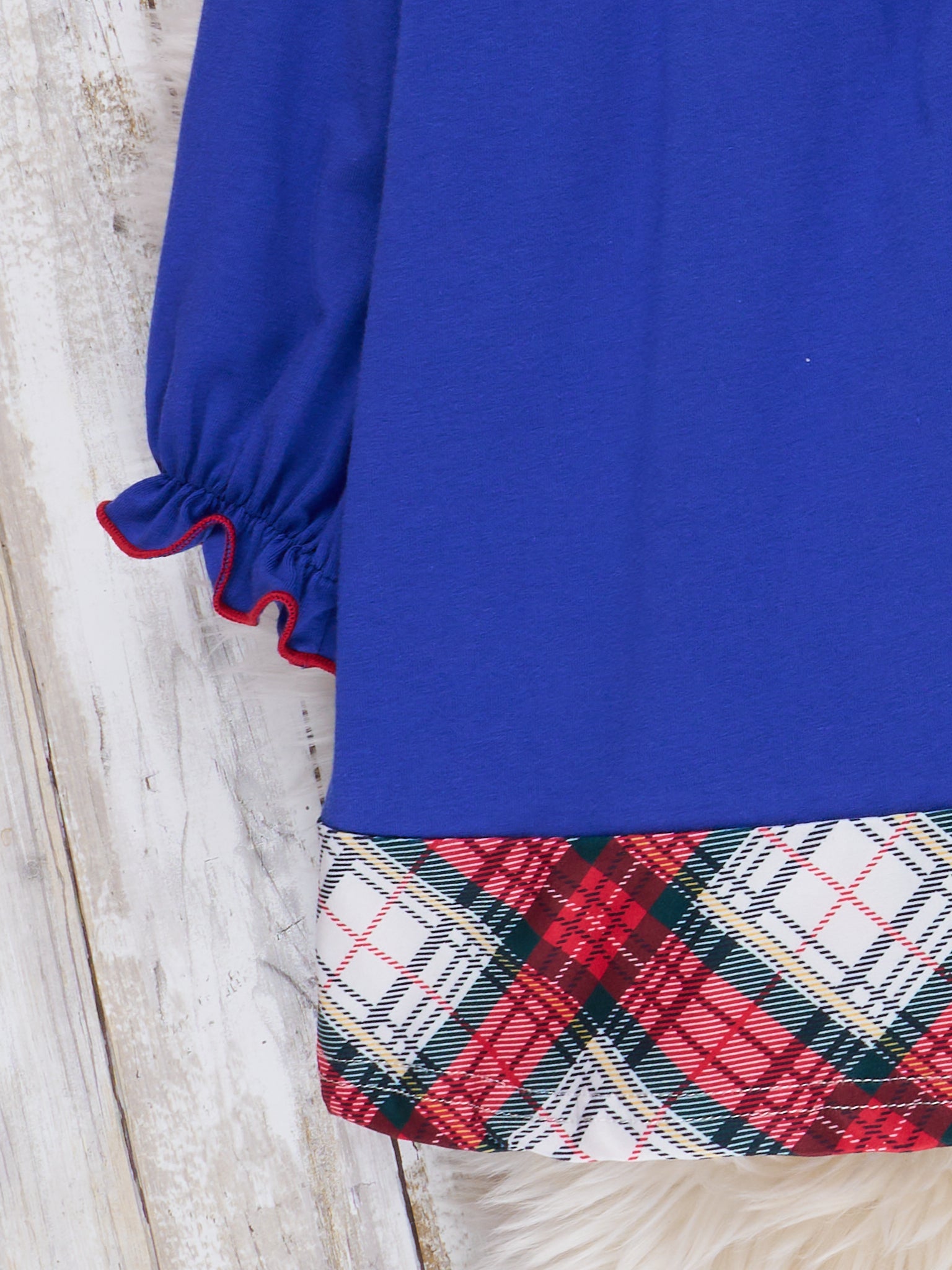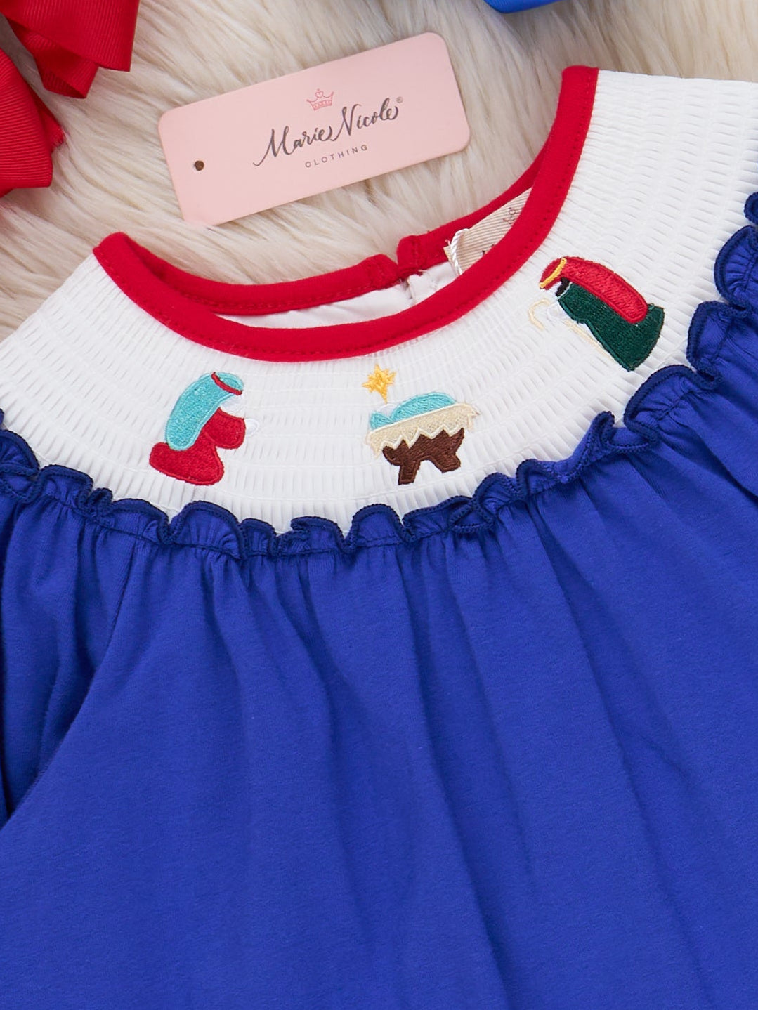 Your littles will be the new gifts of the magi in this precious Christmas sibling set. This shift dress features red trim detail, classic holiday plaid, and an embroidered nativity scene over smocking at the collar.