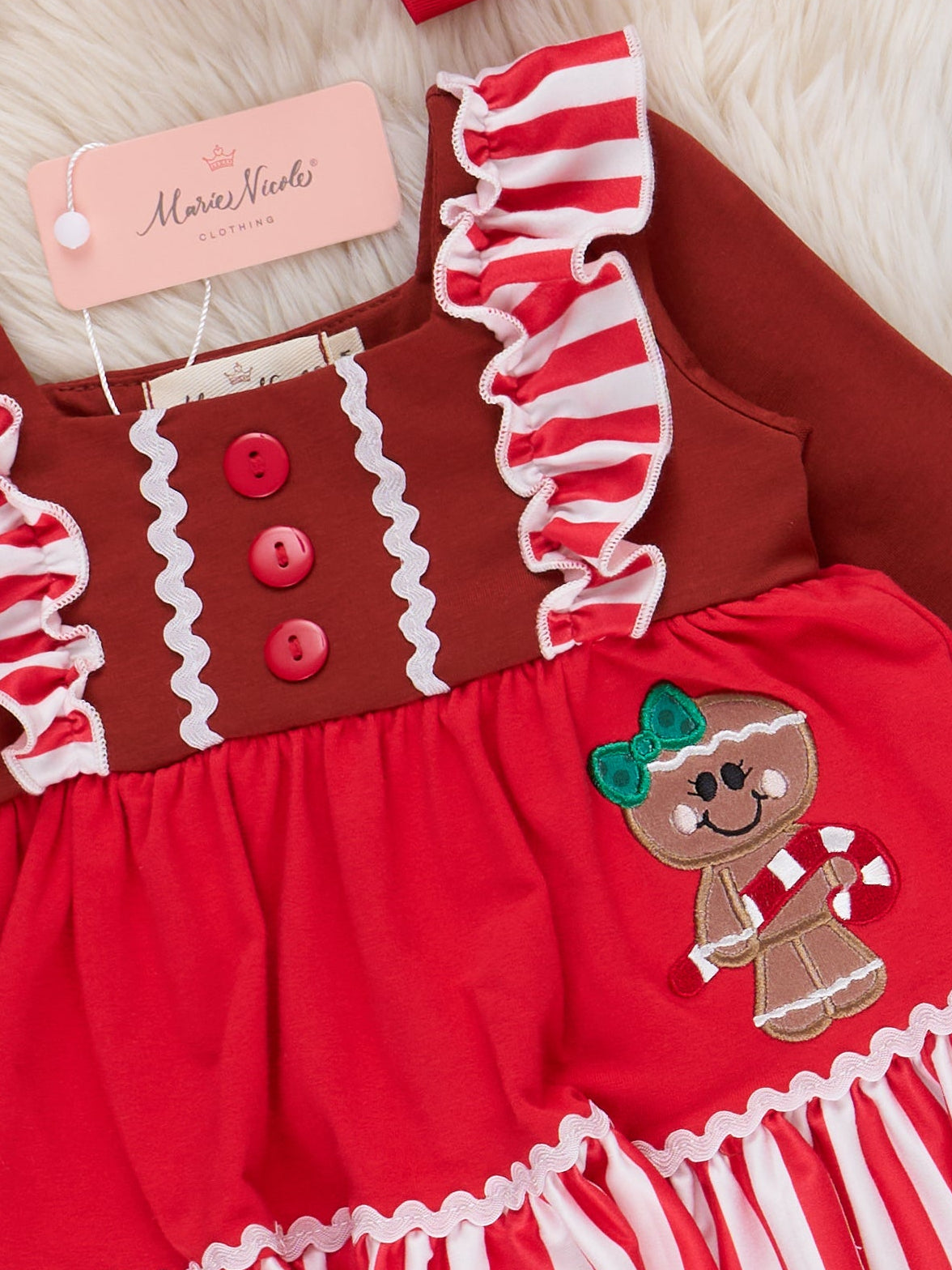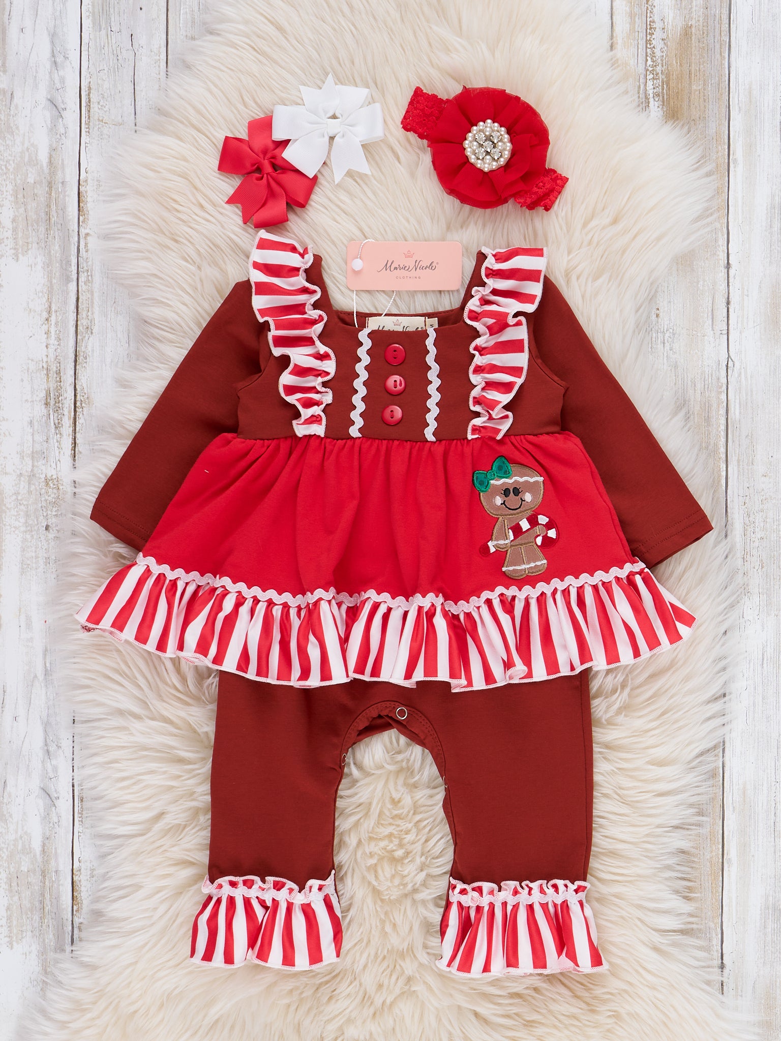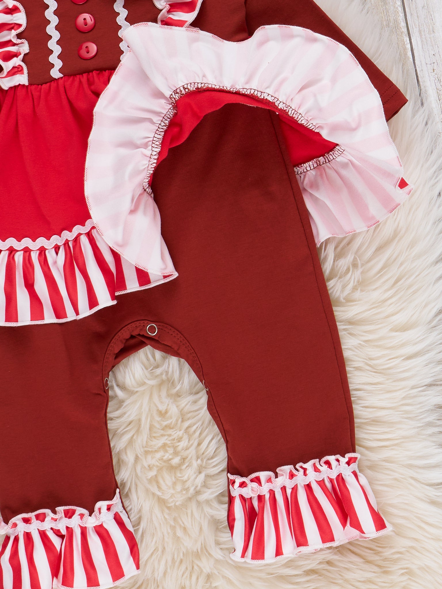 The perfect sister set for your sassy trendsetters! This romper features stripes, flutter trim, decorative buttons, a sassy gingerbread appliqué, & ruffle trim.