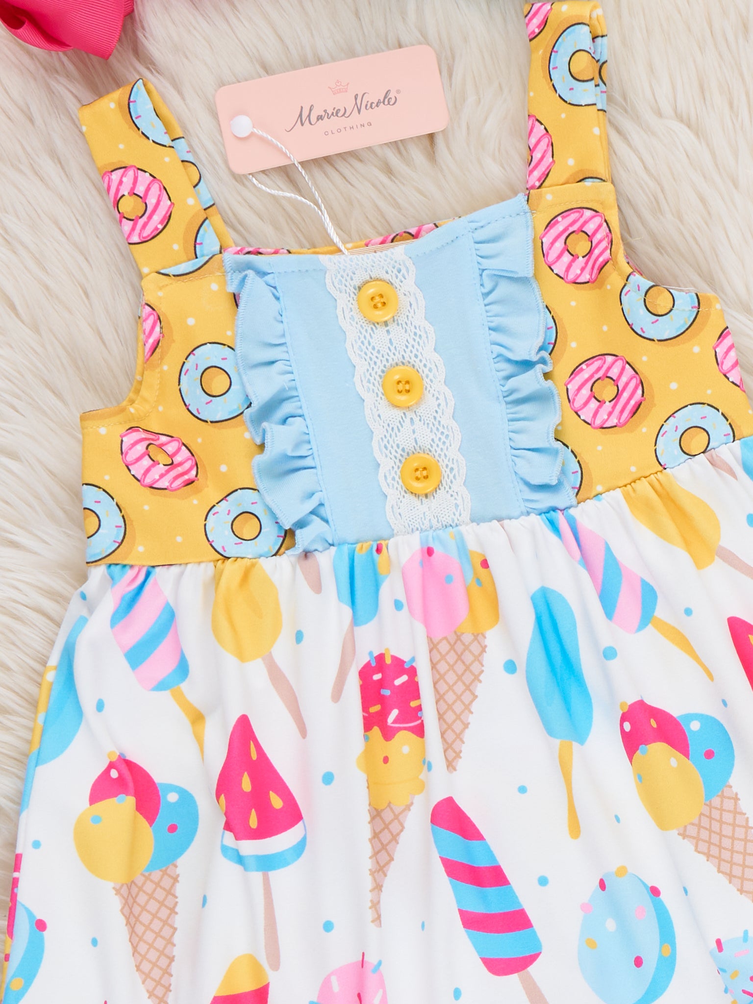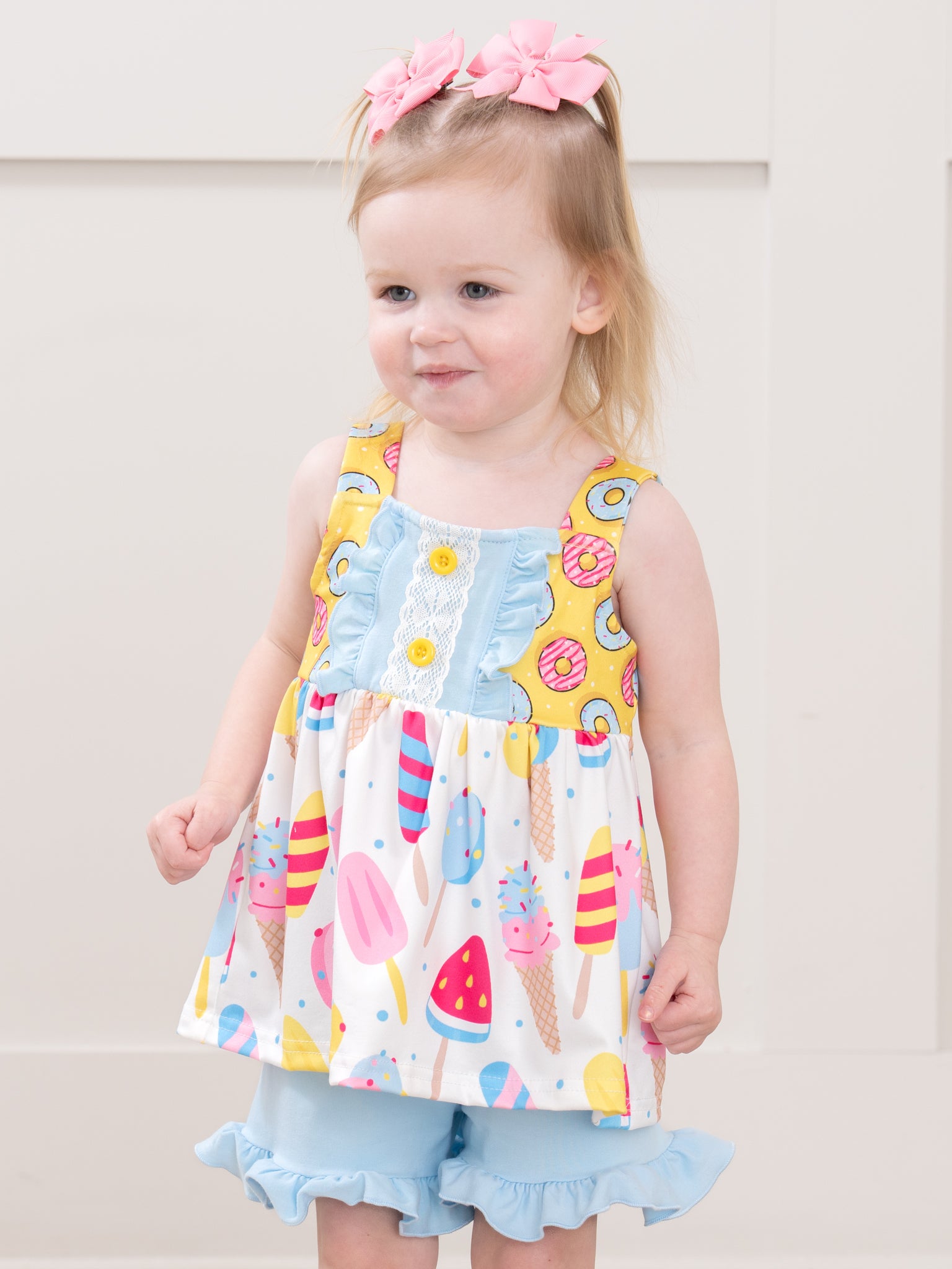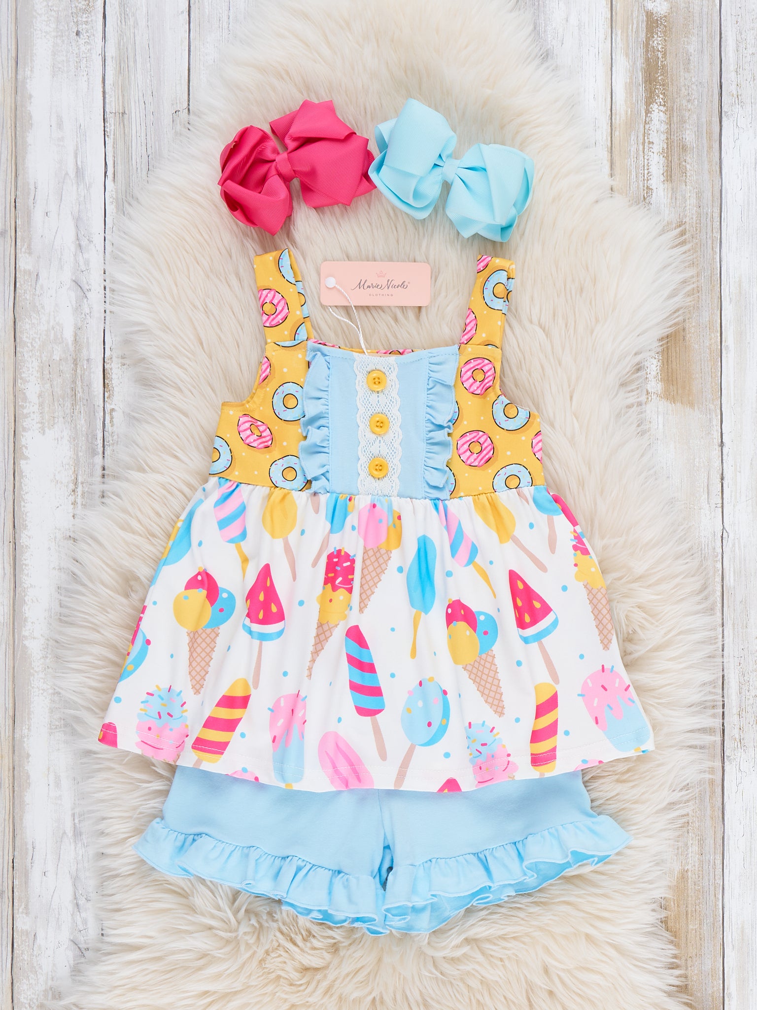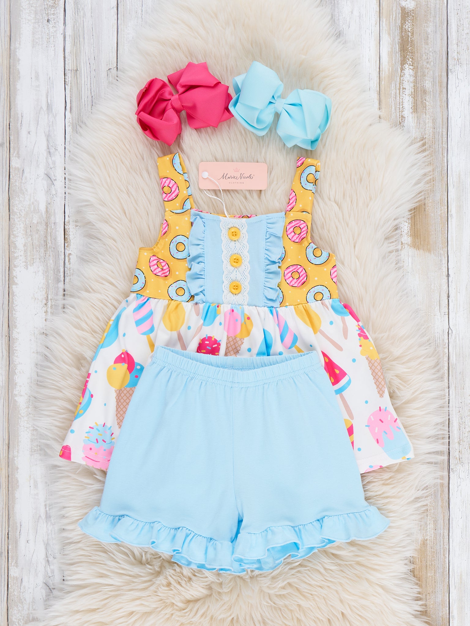 Get ready for some sweet summertime fun with our Summer Sweets Ruffle Outfit! This sibling set includes a girls outfit with a playful donut and ice cream treats print top and ruffle hem shorts. Perfect for warm weather adventures from Marie Nicole Clothing.
