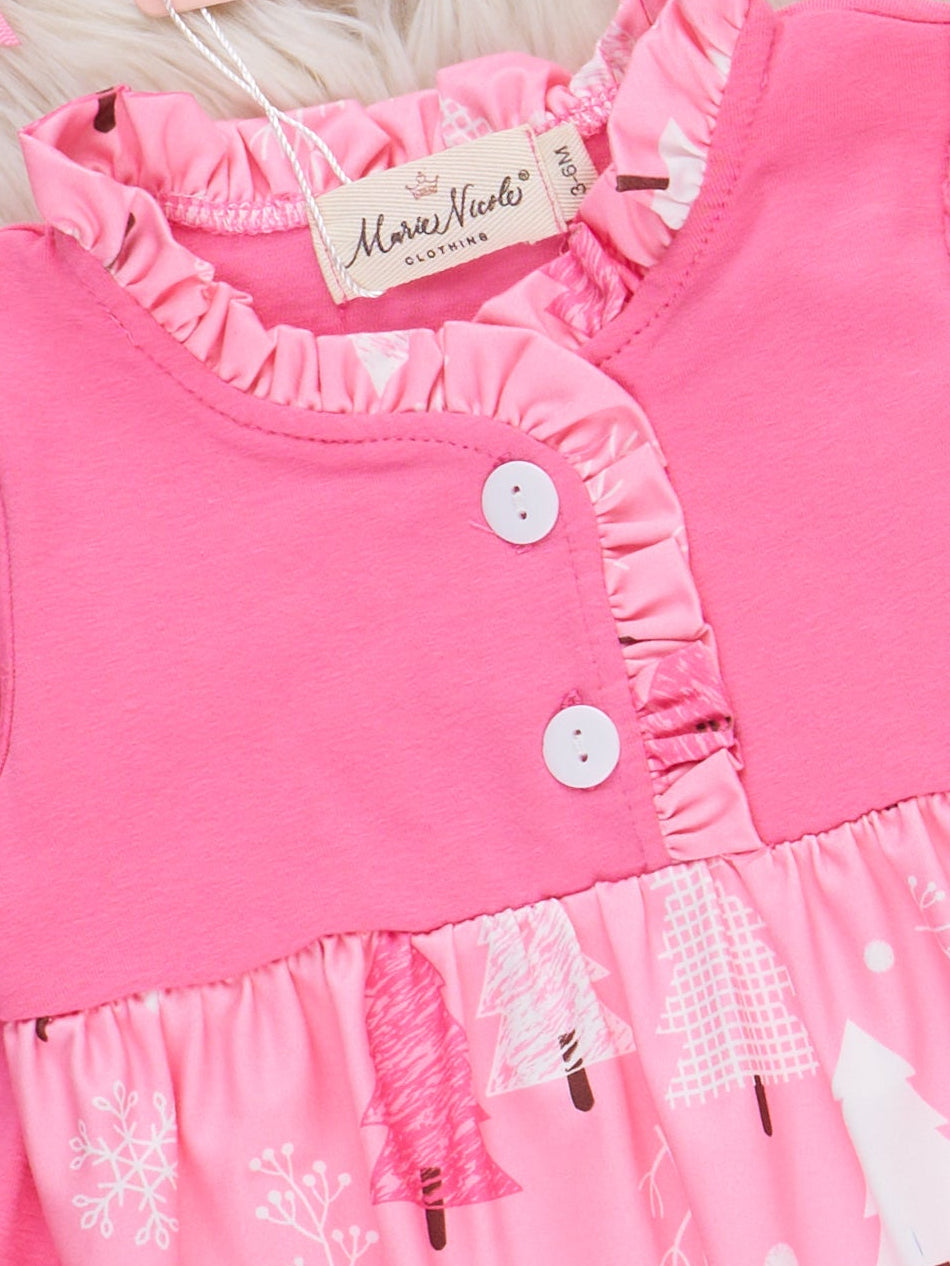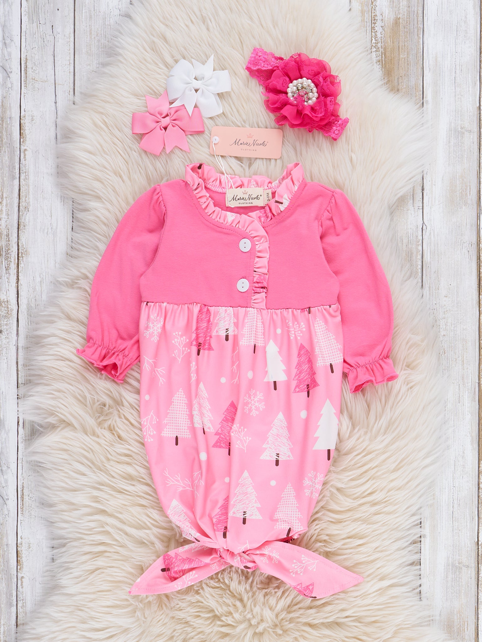 The Snowy Spruce Knot Gown by Marie Nicole features festive tree and star motifs, a gathered shoulder detail, and a buttoned bodice for easy dressing. Its knotted bottom provides a secure, cozy fit for restful nights and hassle-free diaper changes, making it an ideal choice for seasonal celebrations and everyday comfort
