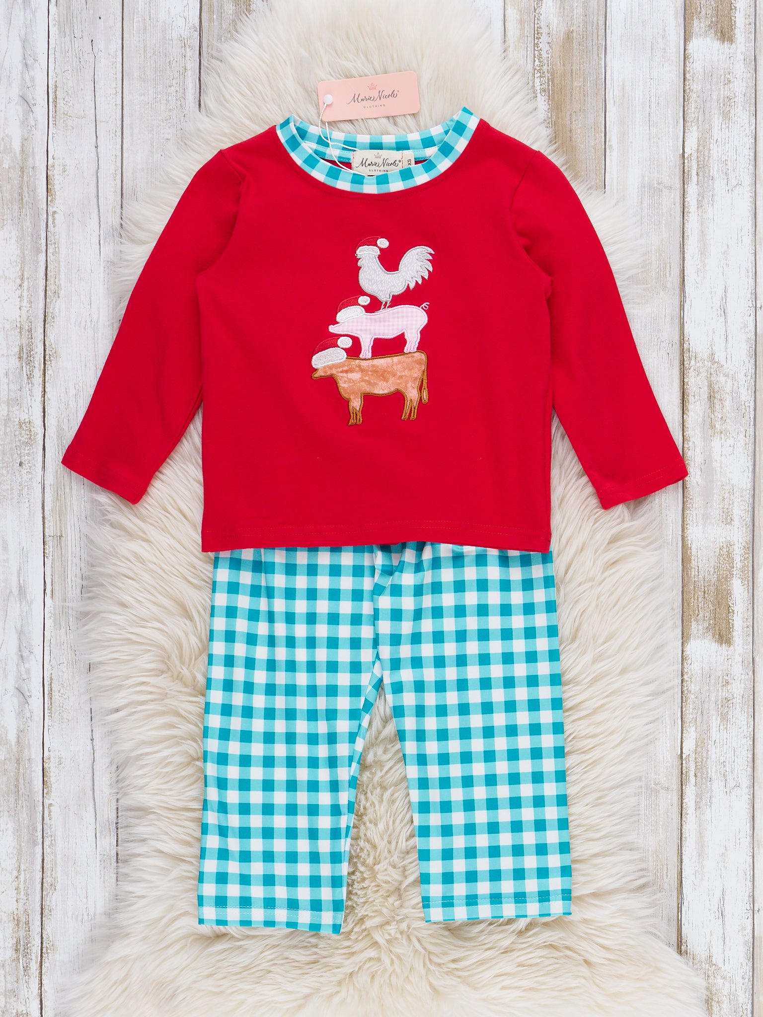 The Farmyard Friends Embroidered Outfit by Marie Nicole Clothing features a long-sleeve top with a stacked farm animal appliqué and gingham trim at the neck, paired with charming matching gingham pants. This playful set blends classic comfort with farm-inspired whimsy, making it perfect for everyday adventures and rural-themed celebrations.