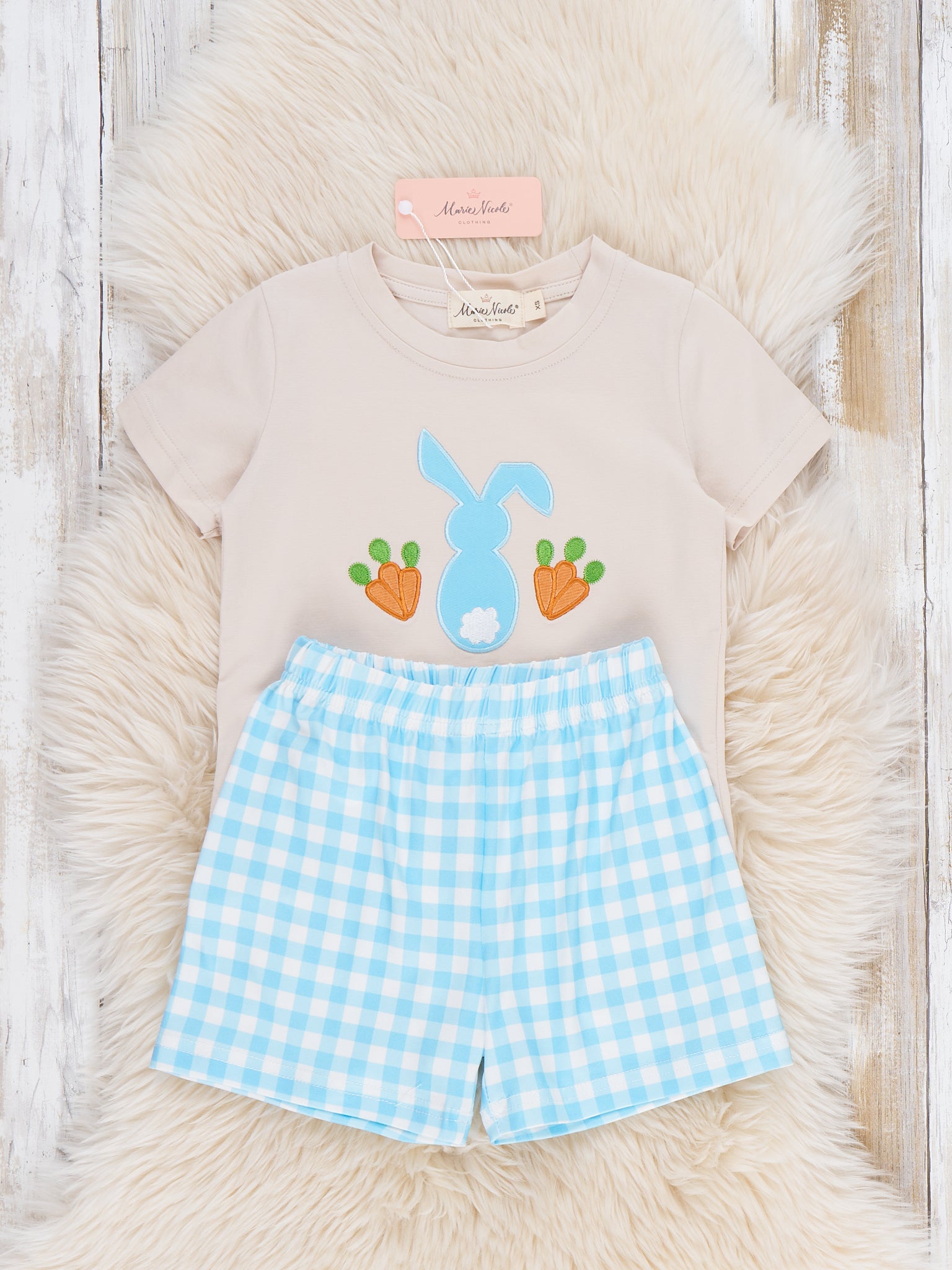 Bunny & Carrot Patch Embroidered Outfit by Marie Nicole Clothing includes a short sleeve tee with bunny and carrot appliqué, paired with classic gingham shorts. The set delivers playful seasonal style and soft stretch comfort, ideal for springtime play, Easter activities, or any day that calls for a cheerful, farm-inspired look.