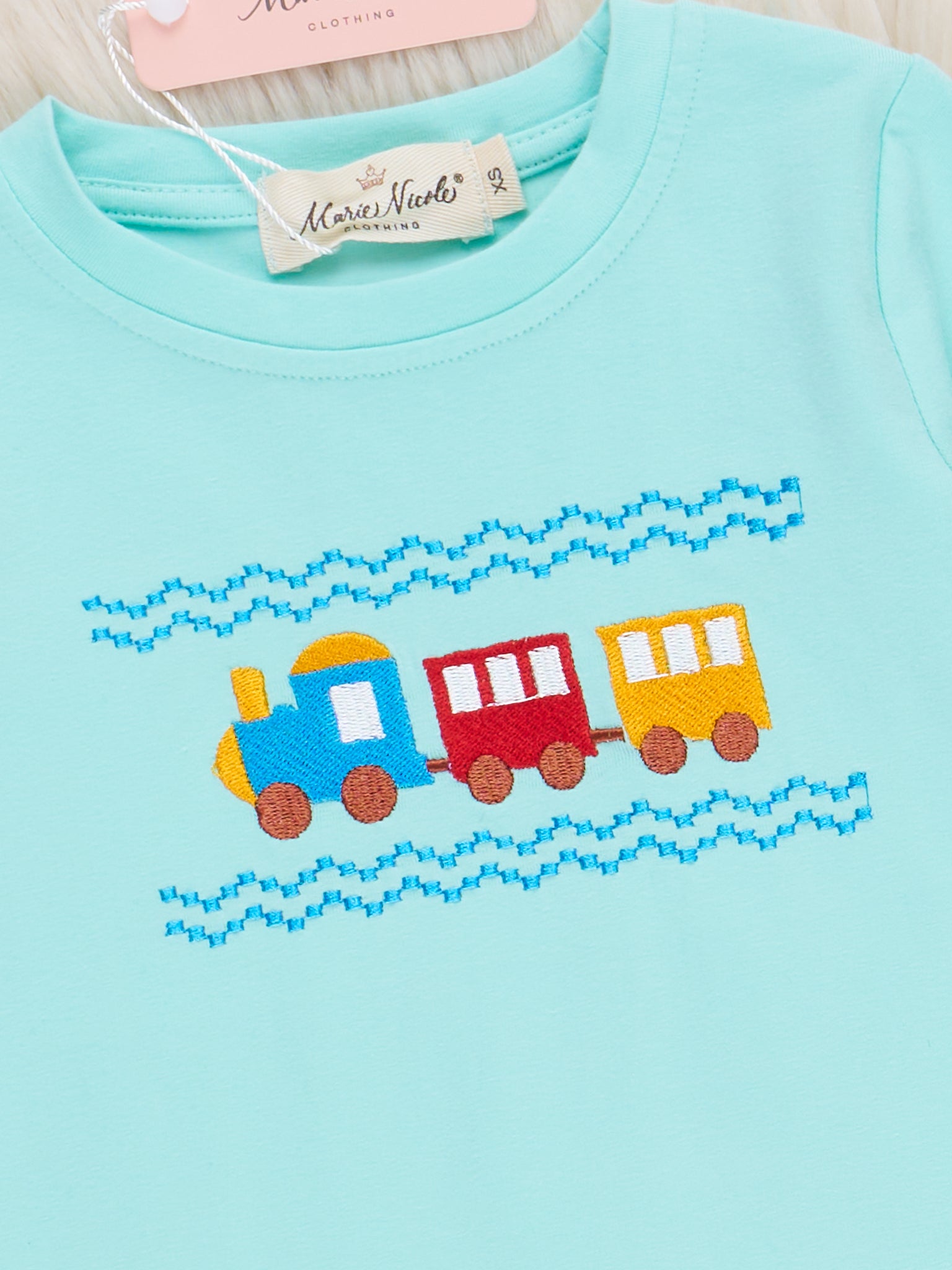 Coral & Teal Embroidered Triceratops Raglan Shirt