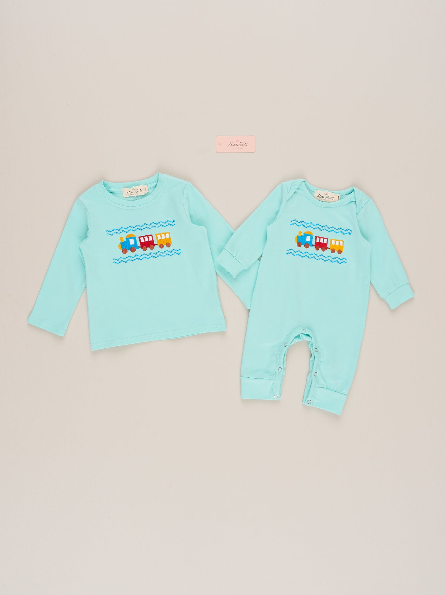Coral & Teal Embroidered Triceratops Raglan Romper